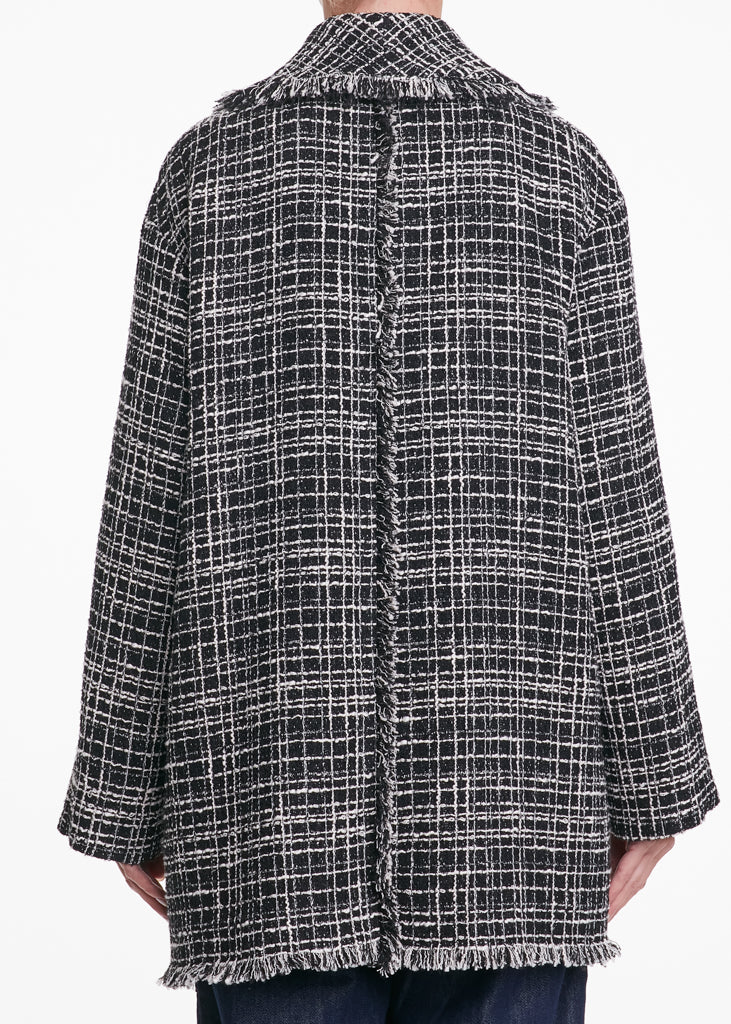 Cappotto spigato nero sui toni del nero e bianco con bordi sfrangiati, tasche laterali a filetto, spilla da balia e fodera interna.