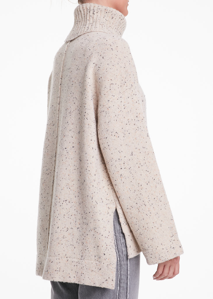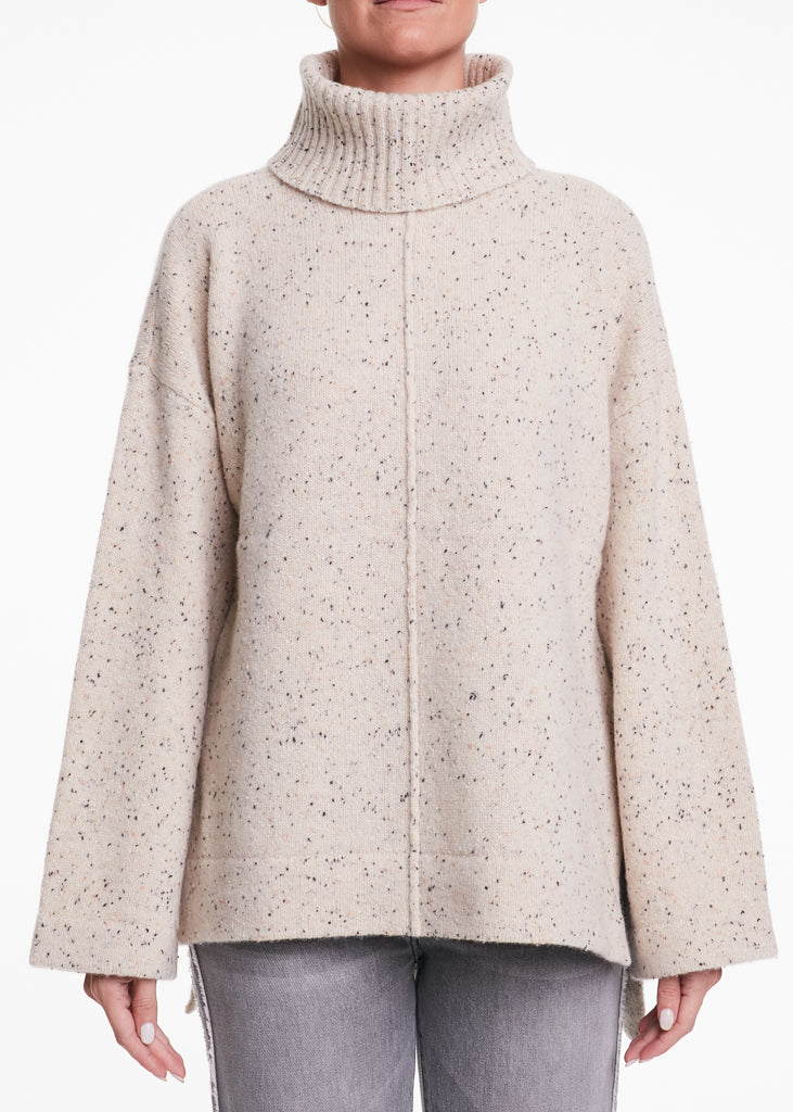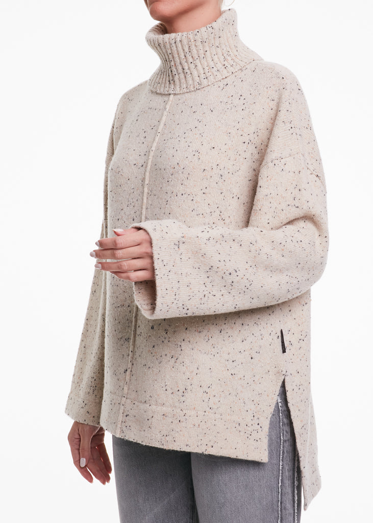 Dolcevita crema in lana con inserti neri, leggermente più lungo sulla parte posteriore.