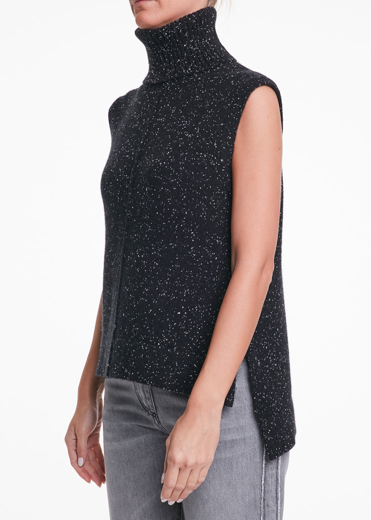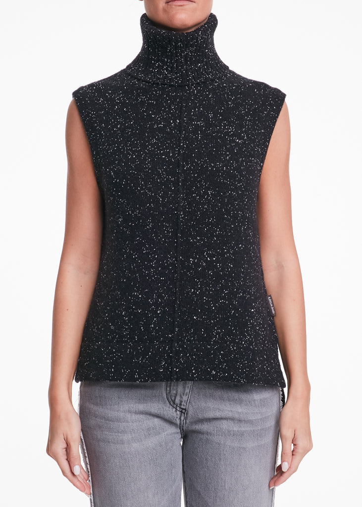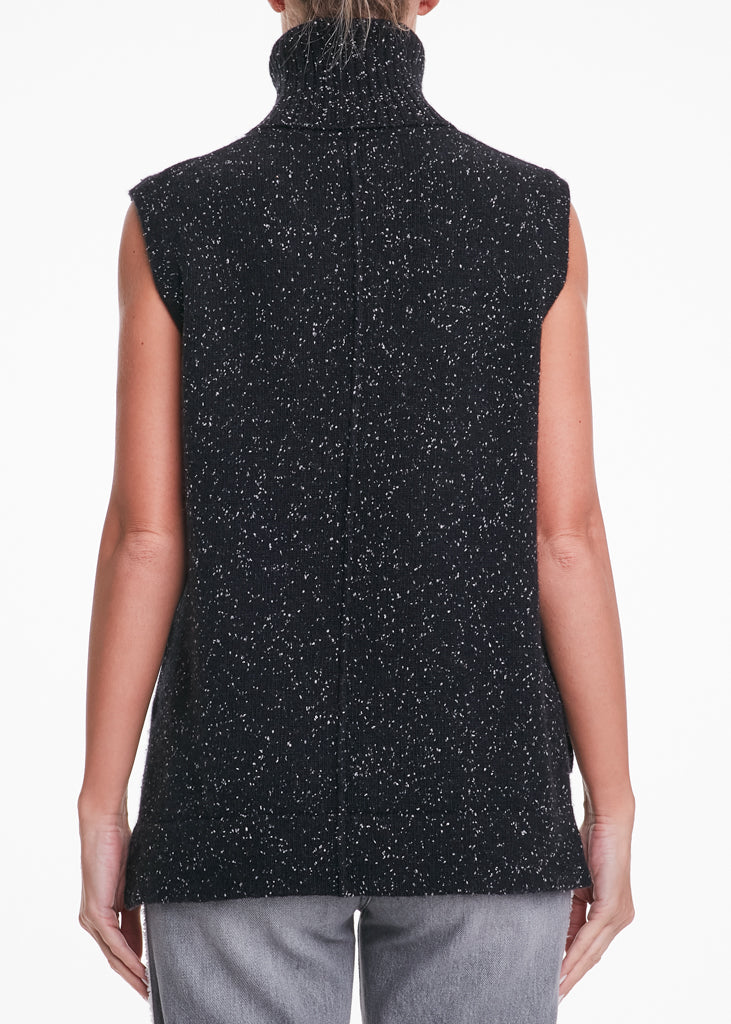 Dolcevita smanicato nero in lana con inserti bianchi, leggermente più lungo sulla parte posteriore.