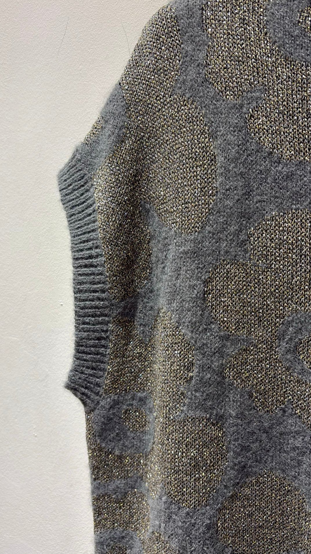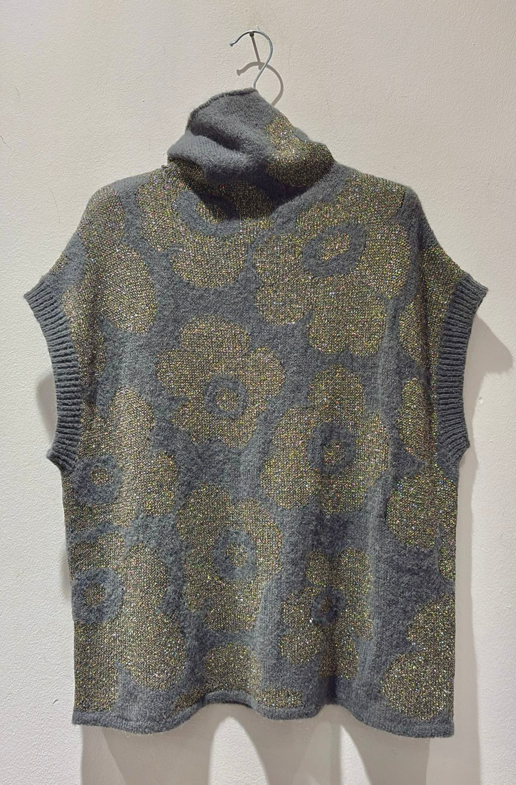 Dolcevita smanicato morbido misto lana e alpaca con bordini a coste, sui toni del grigio con disegno floreale e inserti in lurex.