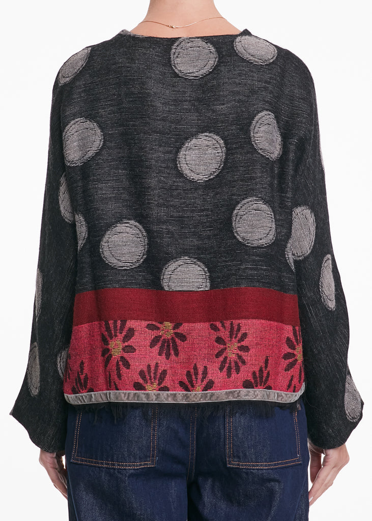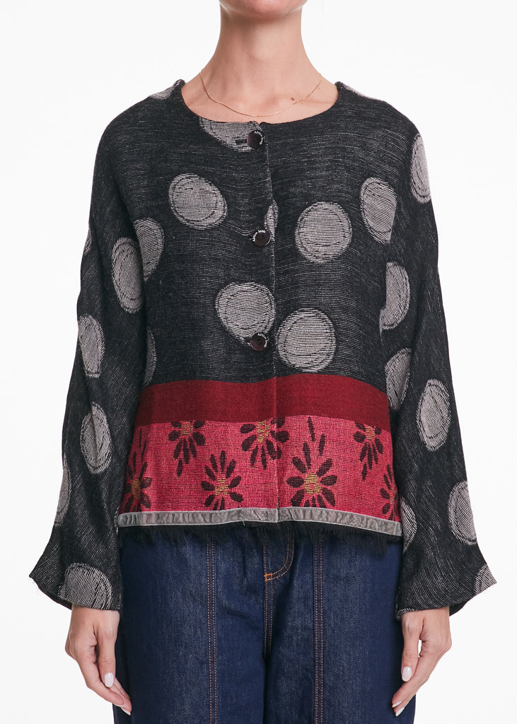 Giacca fantasia con fondo nero e dettagli grigio chiaro/rosso/fucsia.