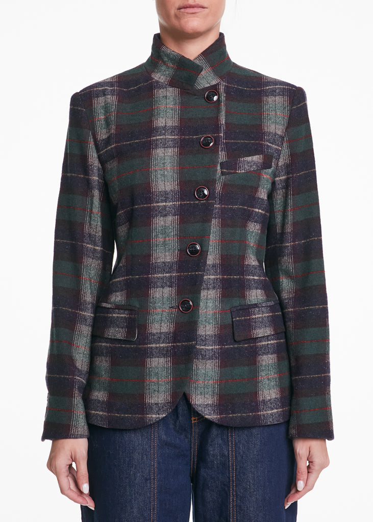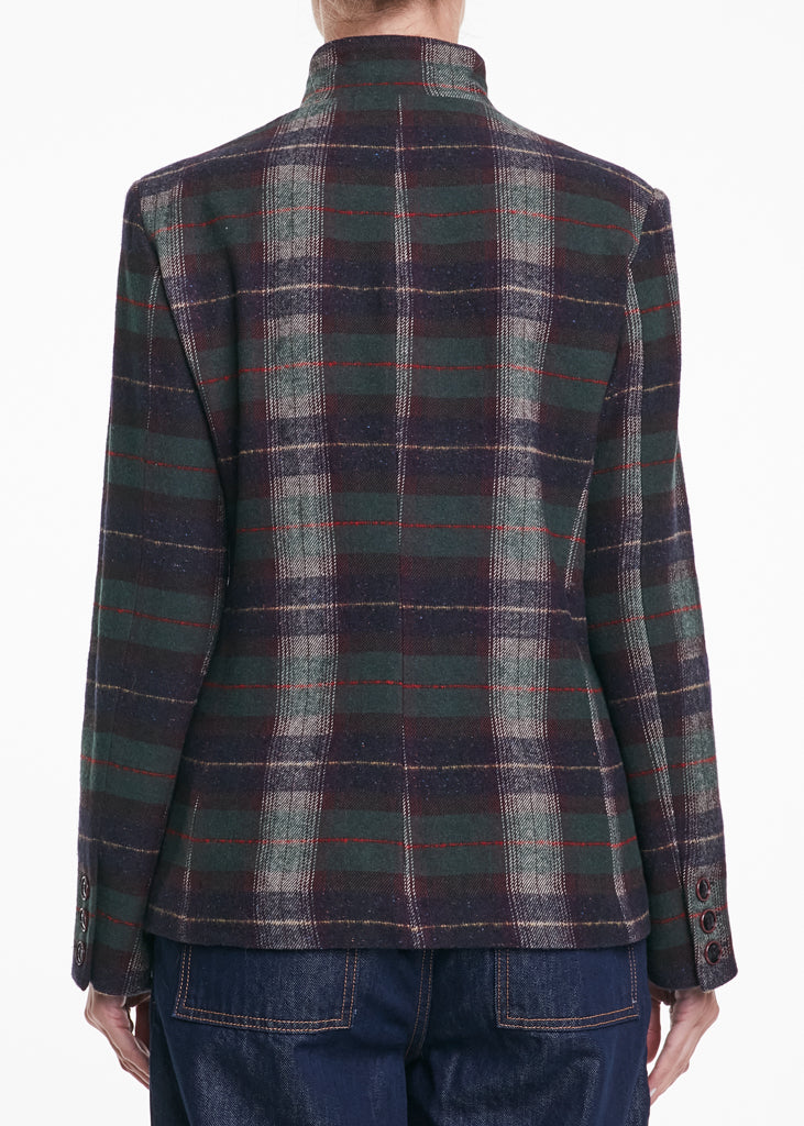 Giacca stampa scozzese sui toni del verde, marrone, blu.