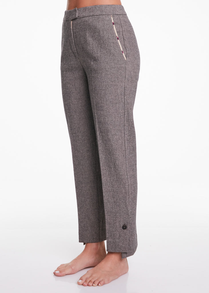 Pantalone dritto con tasche laterali a filetto, chiusura frontale a zip e bottone nascosto, dettaglio sul fondo con bottone e tasca sulla parte posteriore. Foderato internamente.