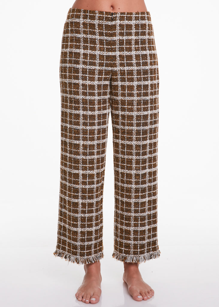 Pantalone dritto pied de poule sfrangiato sul fondo sui toni del verde/bianco/nero. Chiusura frontale a zip.