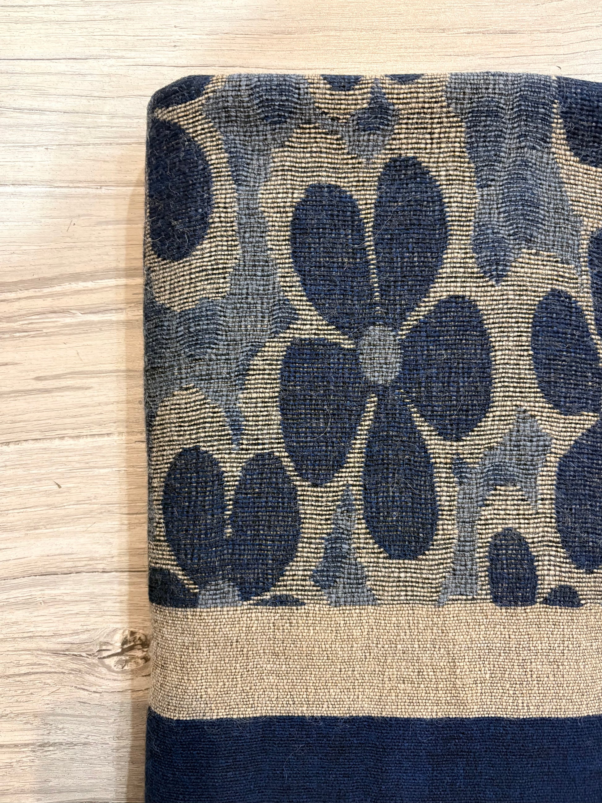 Sciarpa rettangolare sui toni del blu, azzurro e beige con frange sui bordi.
