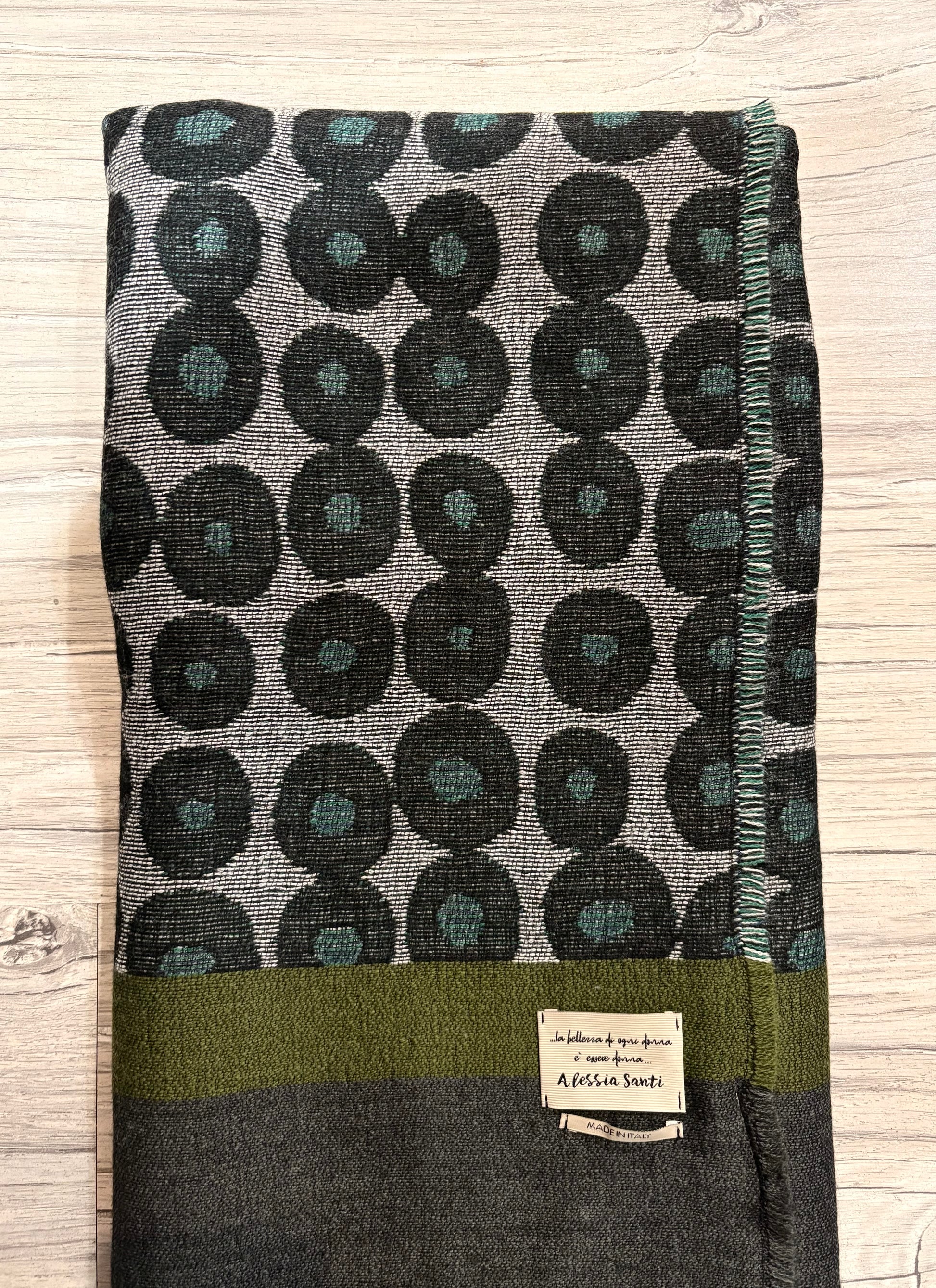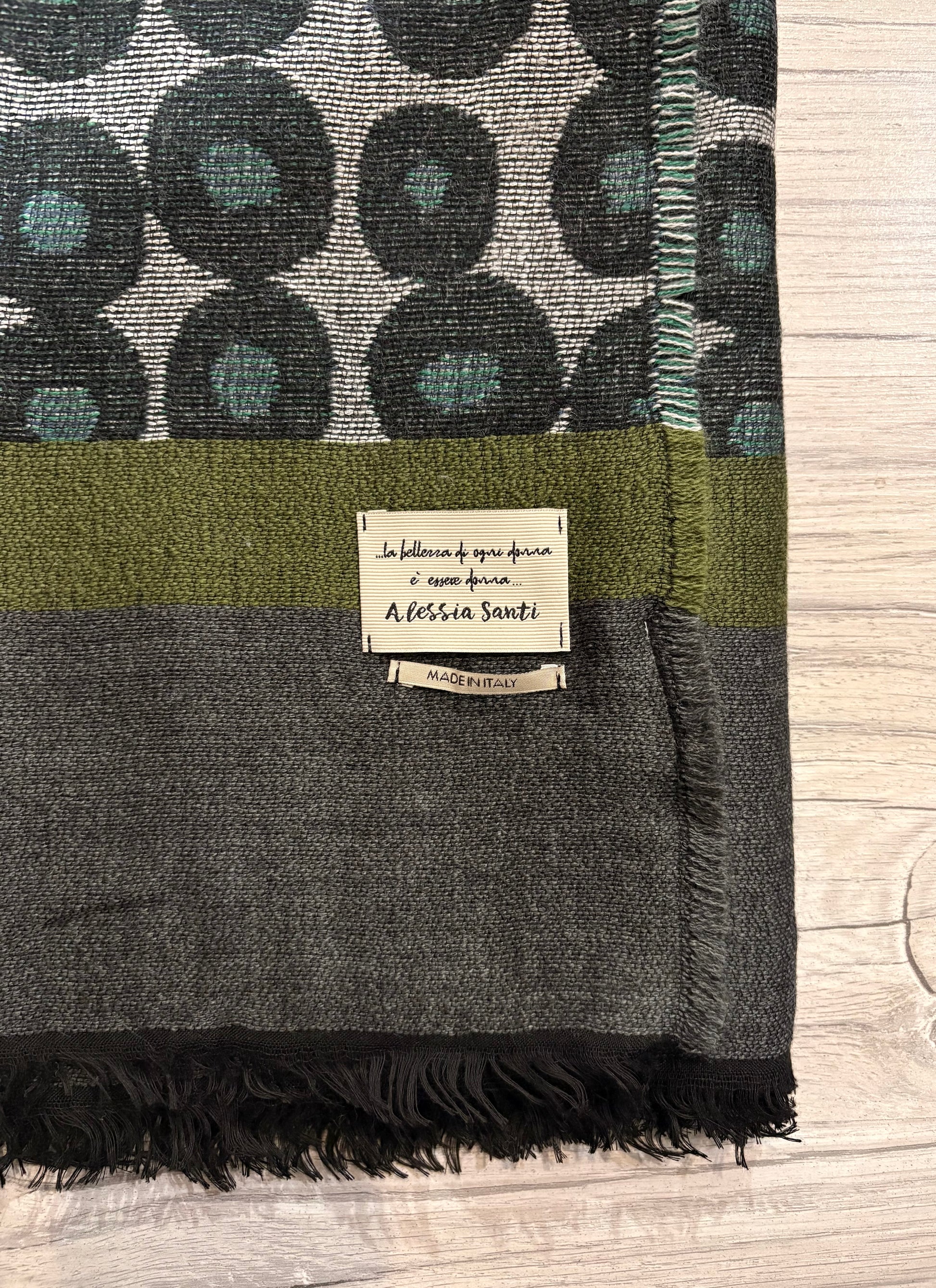 Sciarpa quadrata sui toni del verde, grigio antracite e nero con frange sui bordi.