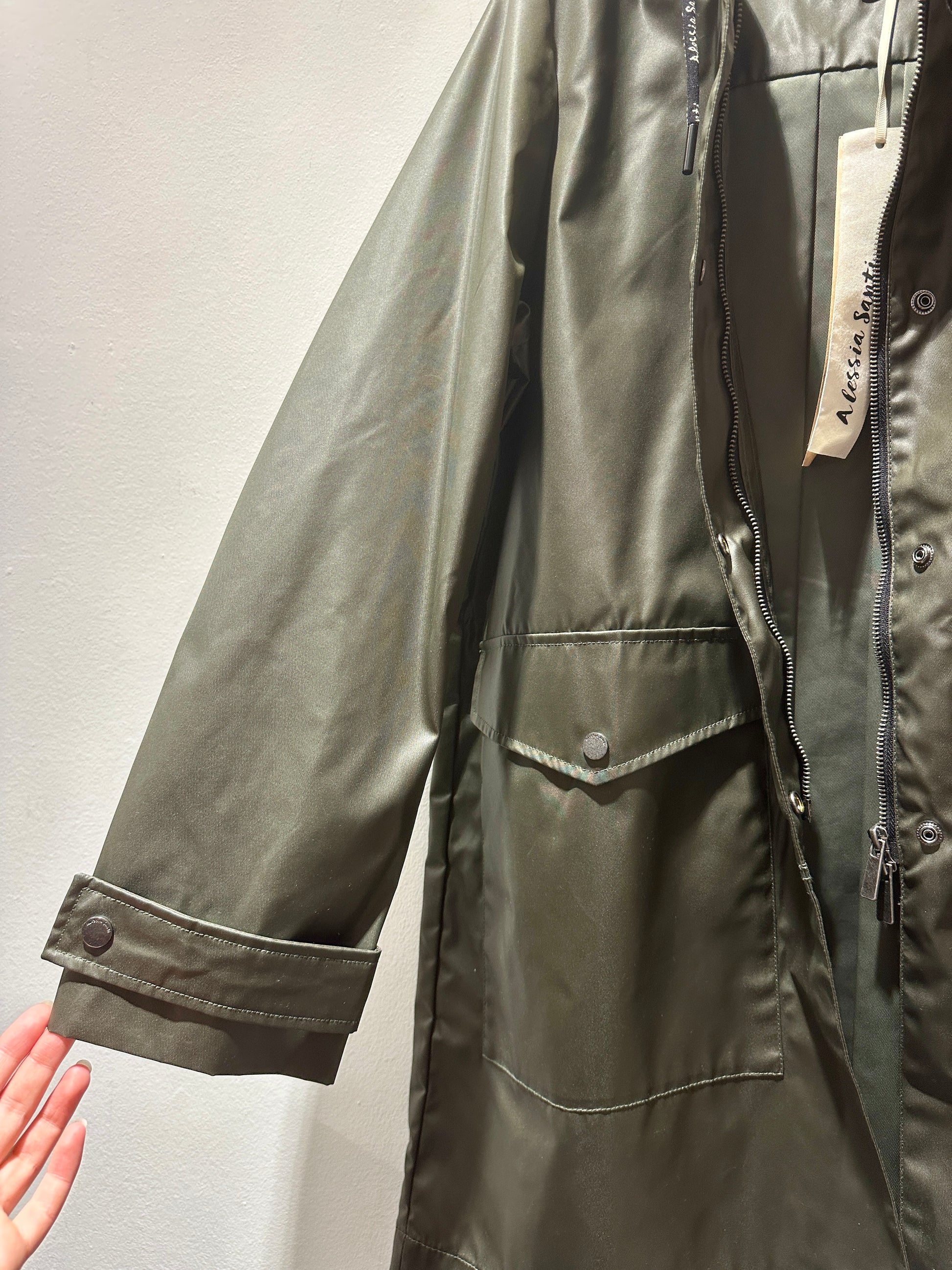 Trench verdone effetto spalmato lucido, leggermente più lungo dietro.