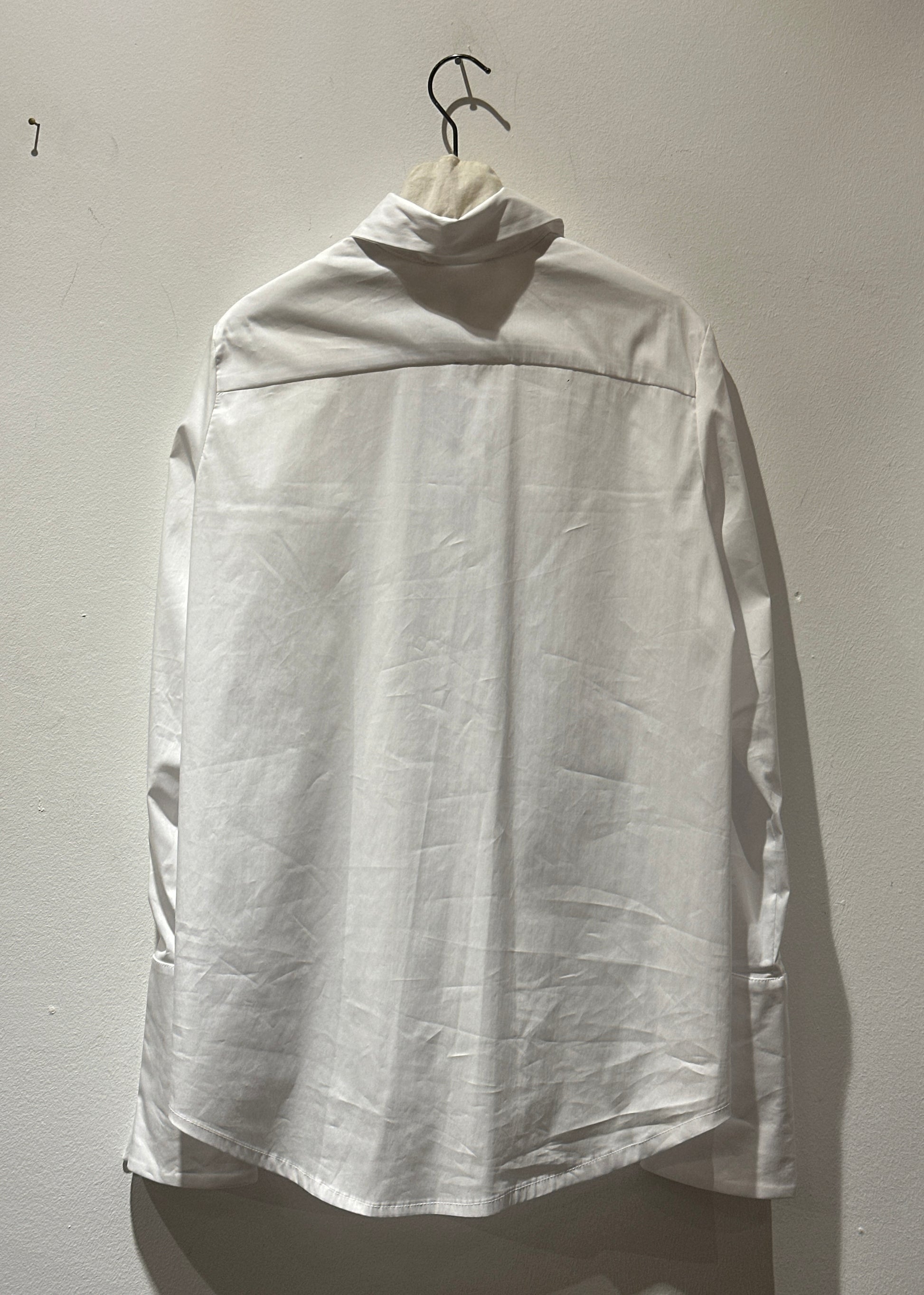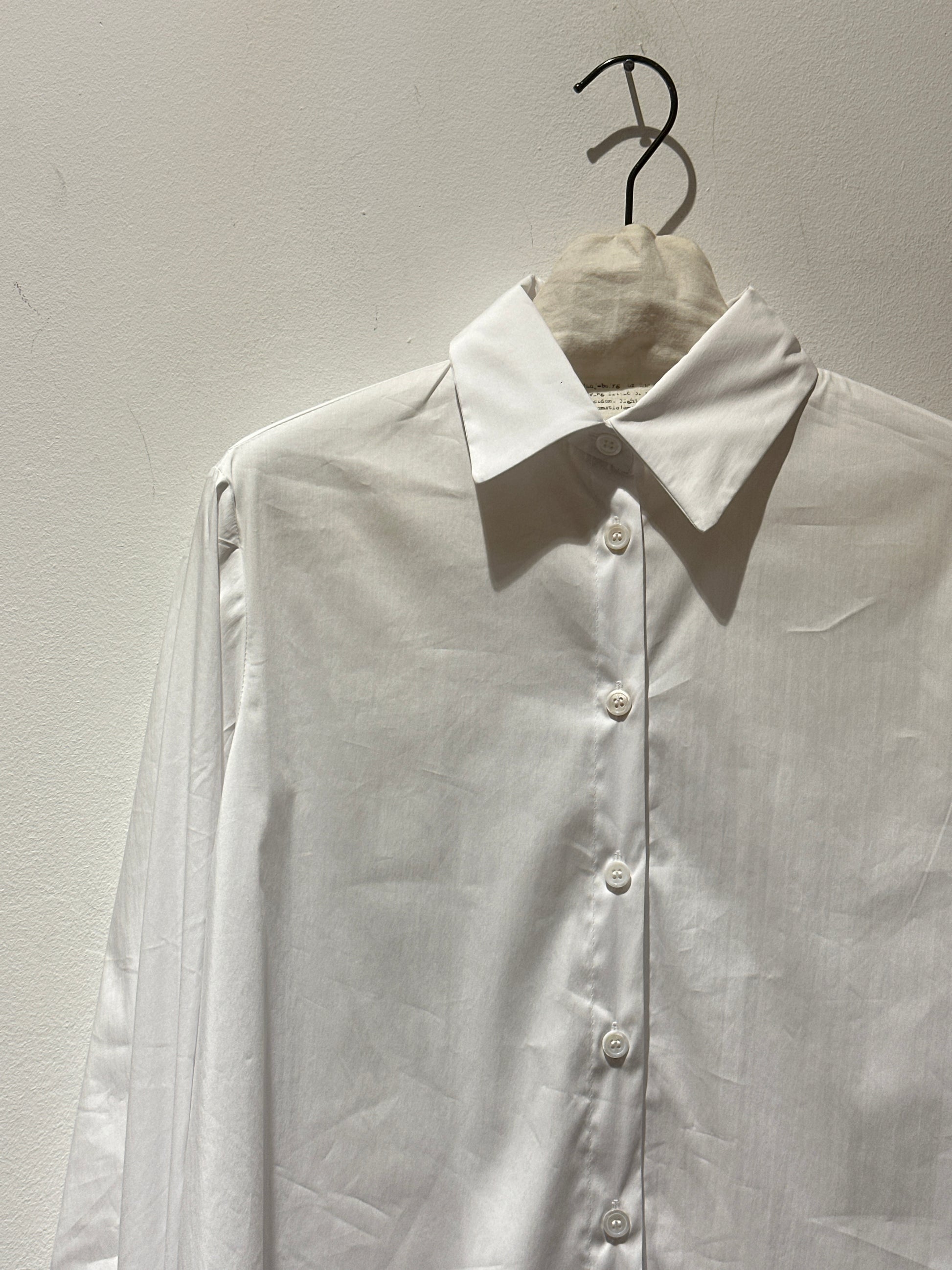 Camicia bianca semplice con colletto, chiusura frontale a bottoni e dettaglio del polsino alto. Leggermente più lunga dietro. Vestibilità molto ampia.