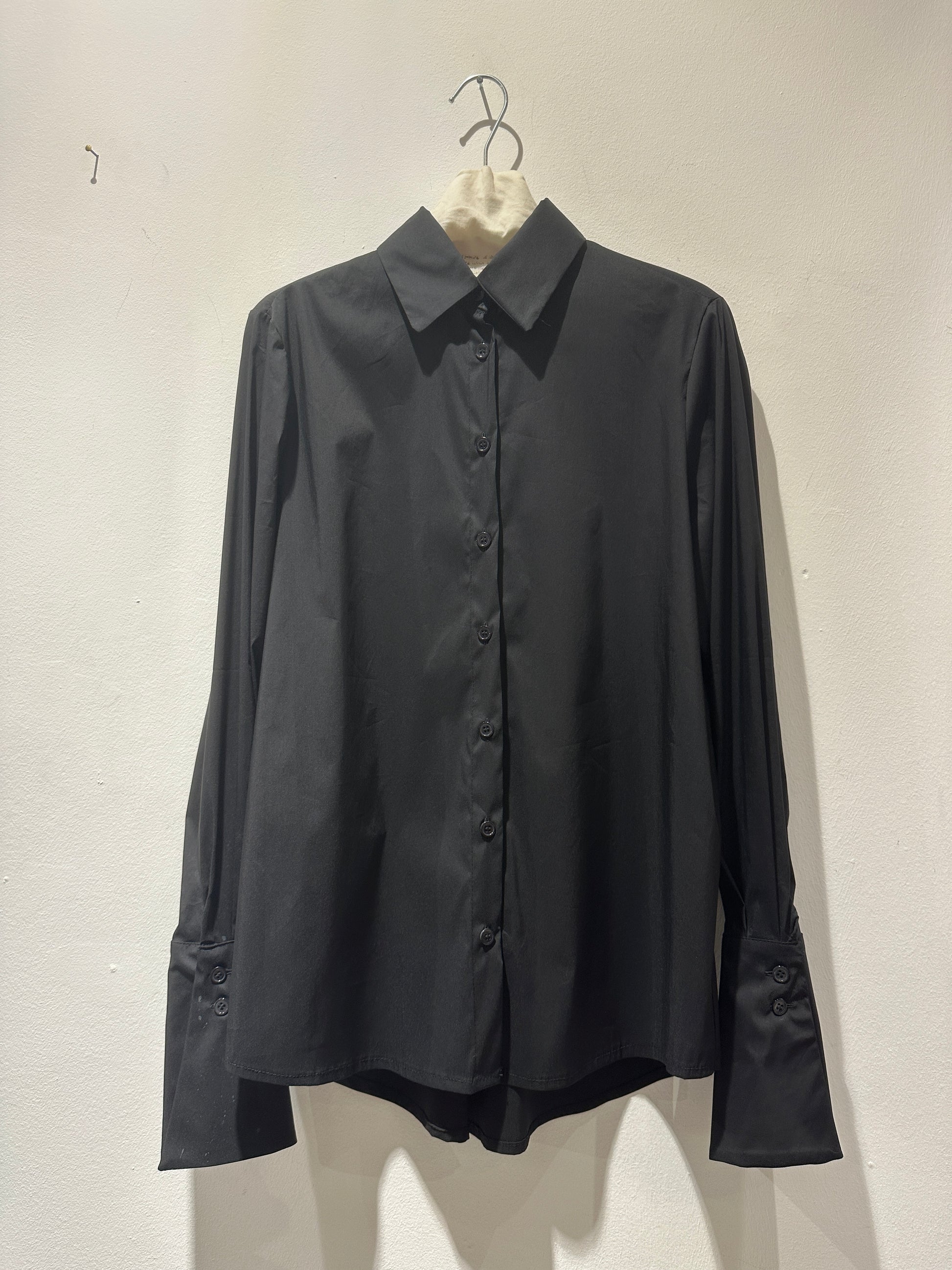 Camicia nera semplice con colletto, chiusura frontale a bottoni e dettaglio del polsino alto. Leggermente più lunga dietro. Vestibilità molto ampia.