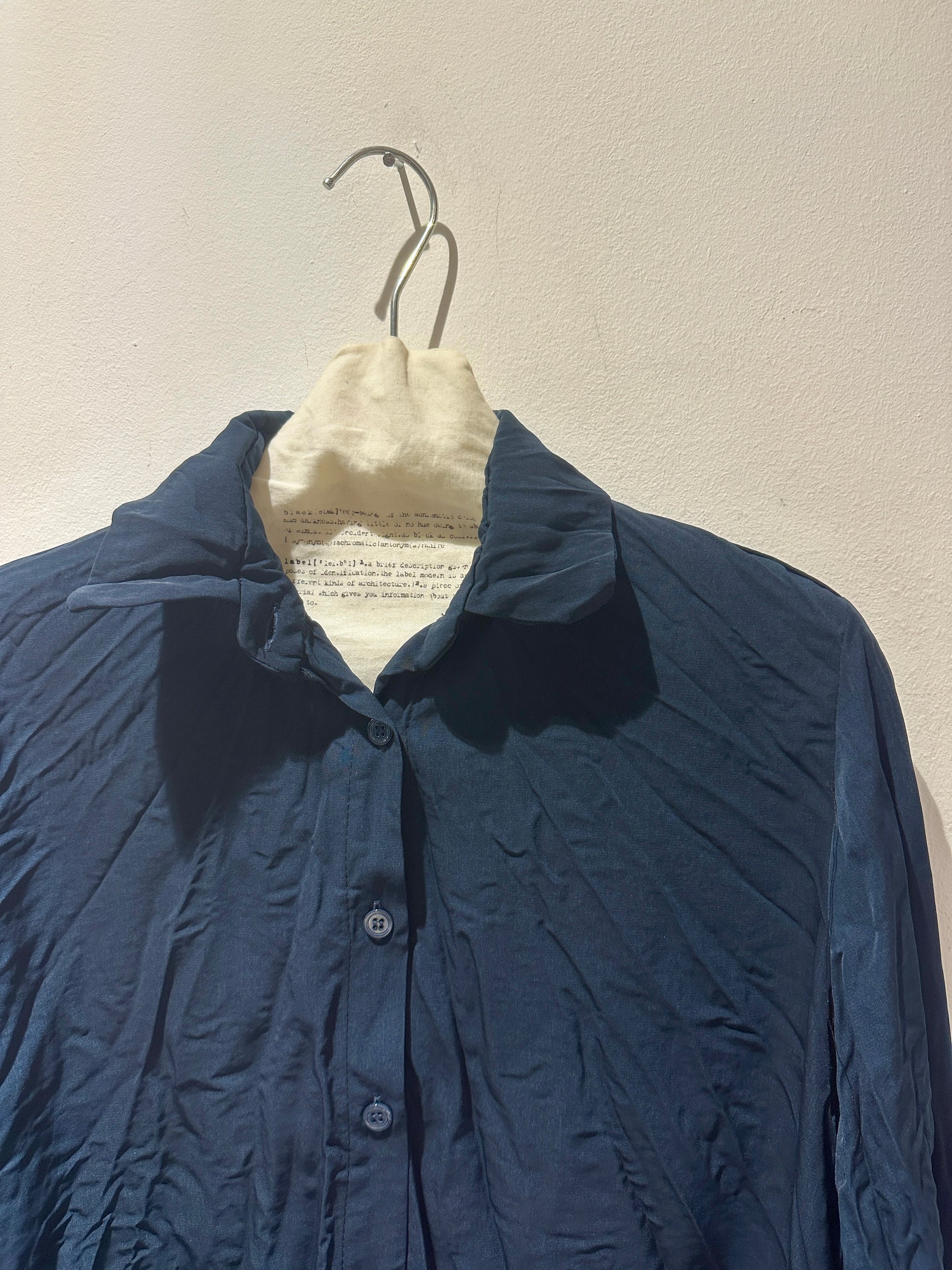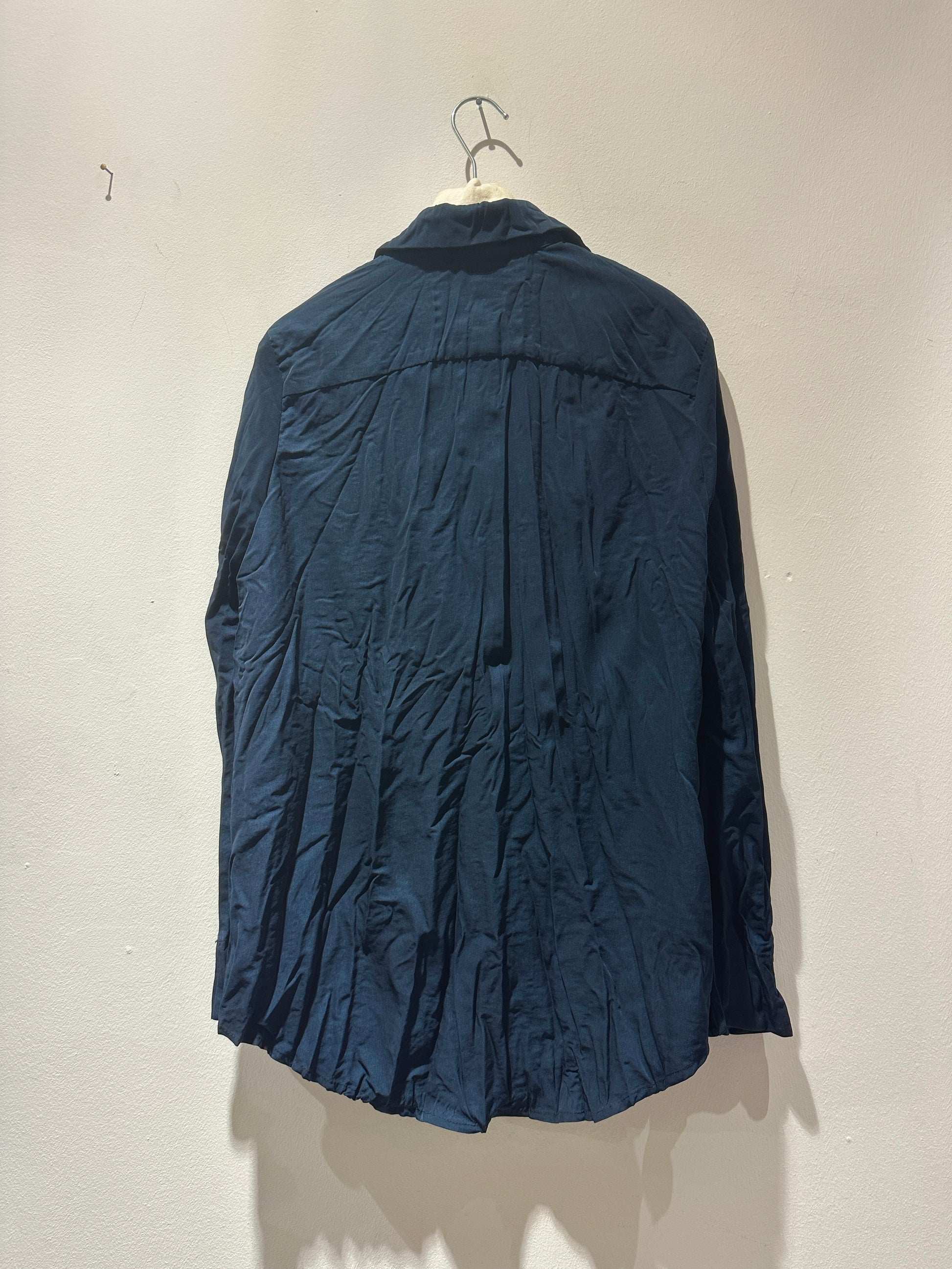 Camicia blu navy dall'effetto stropicciato con colletto classico, manica lunga con polsino ripreso e chiusura a bottoni. Leggermente più lunga dietro. Vestibilità molto ampia.