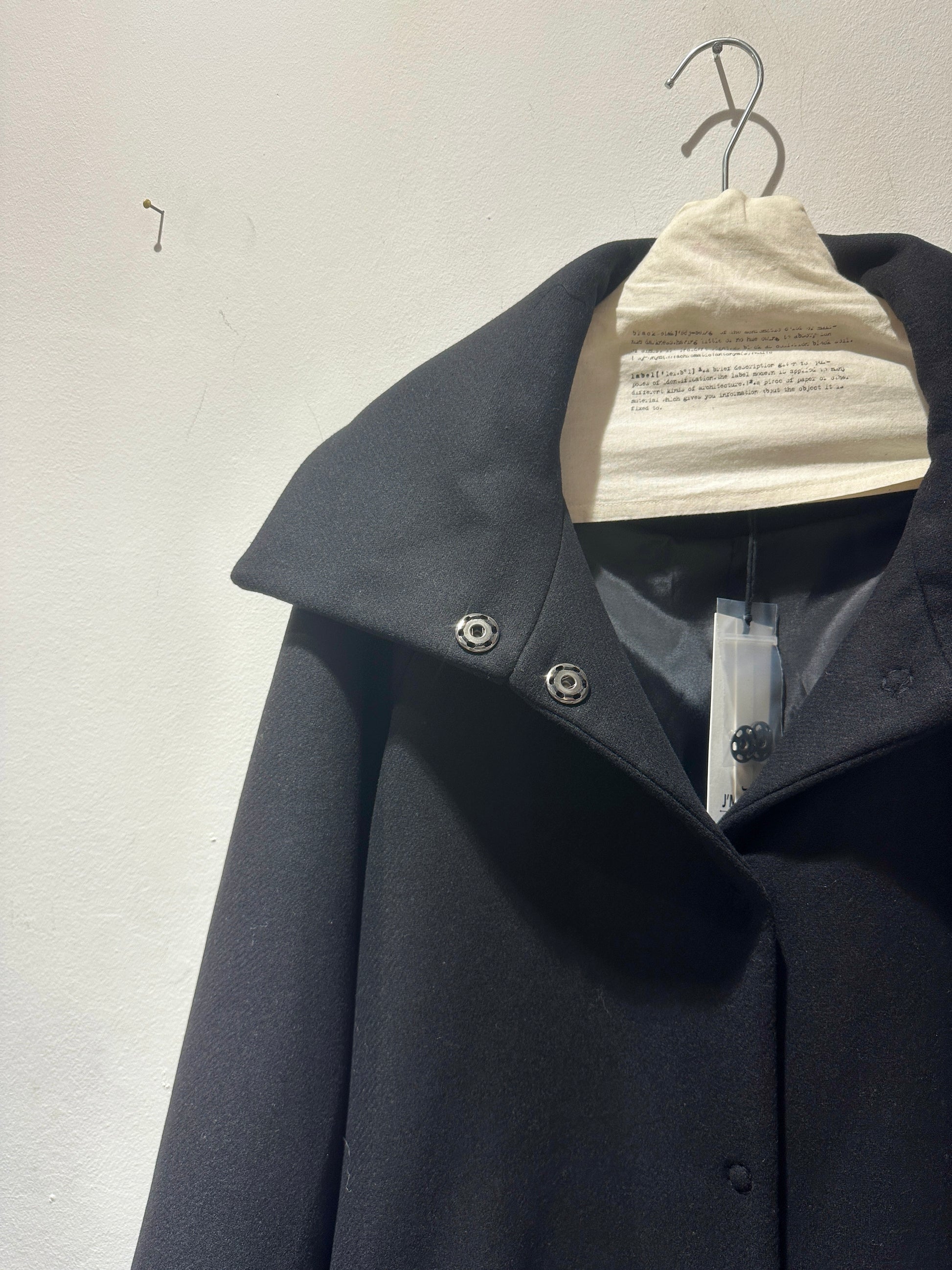 Cappotto lungo nero misto lana con collo alto e chiusura frontale con automatici. Vestibilità molto ampia.