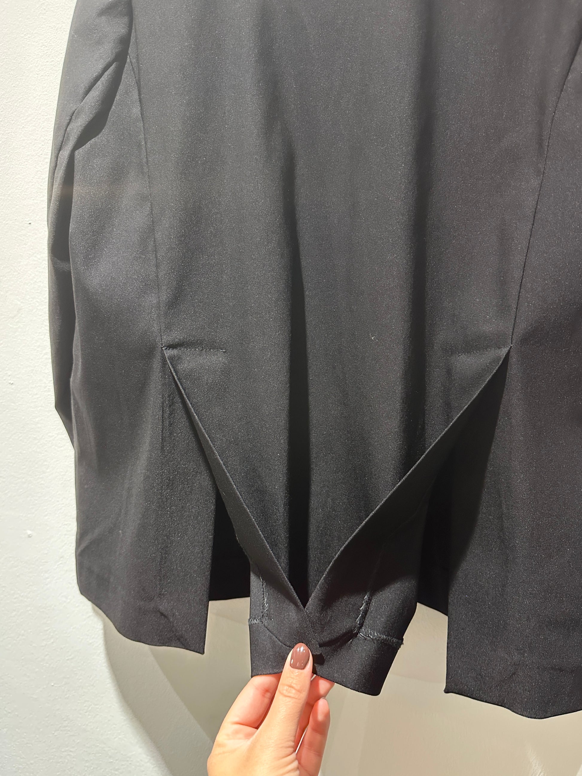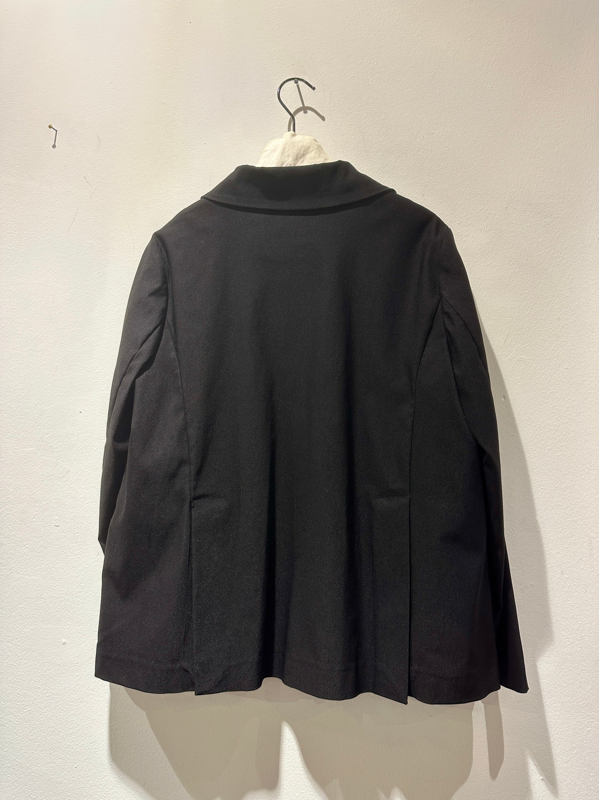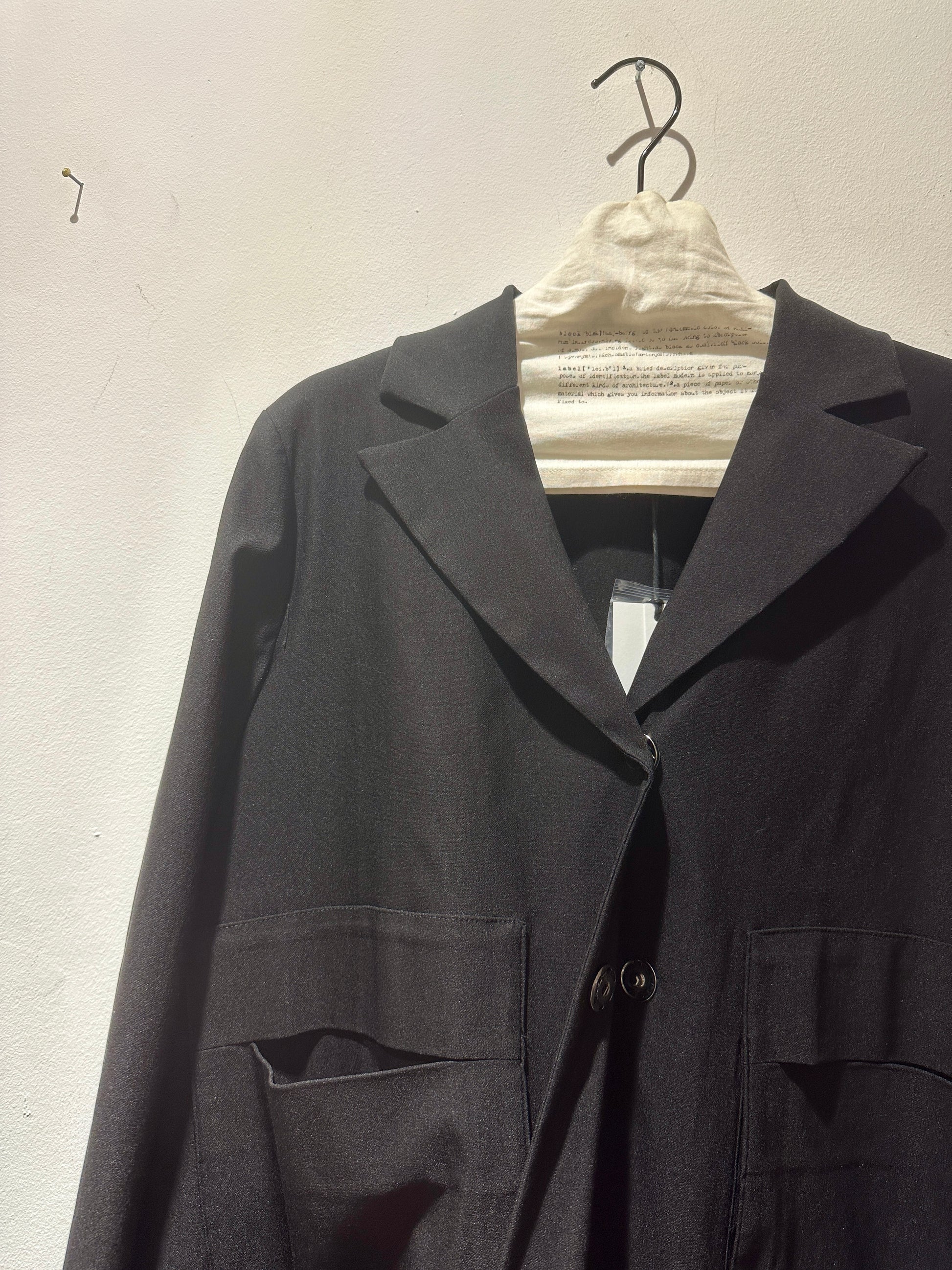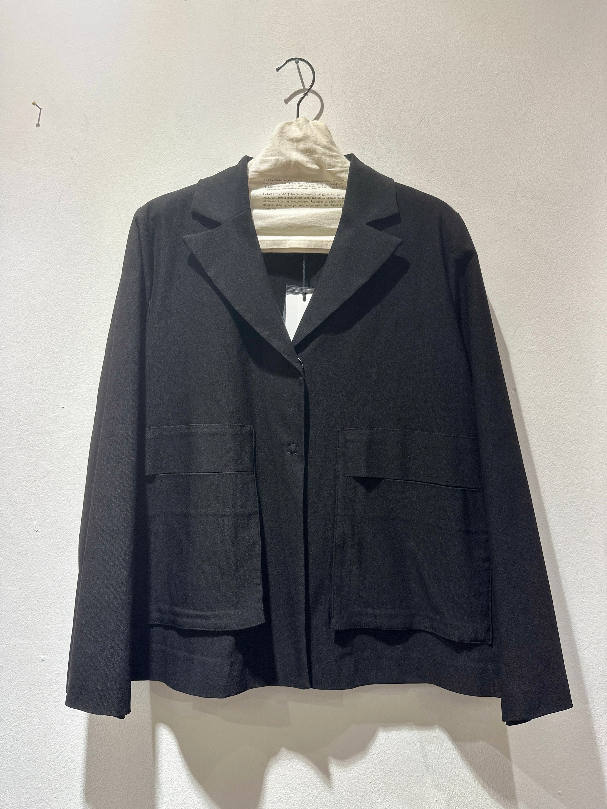 Giacca nera con due tasche applicate sulla parte frontale, chiusura con 2 automatici e spacchetti sulla schiena. Vestibilità molto ampia.