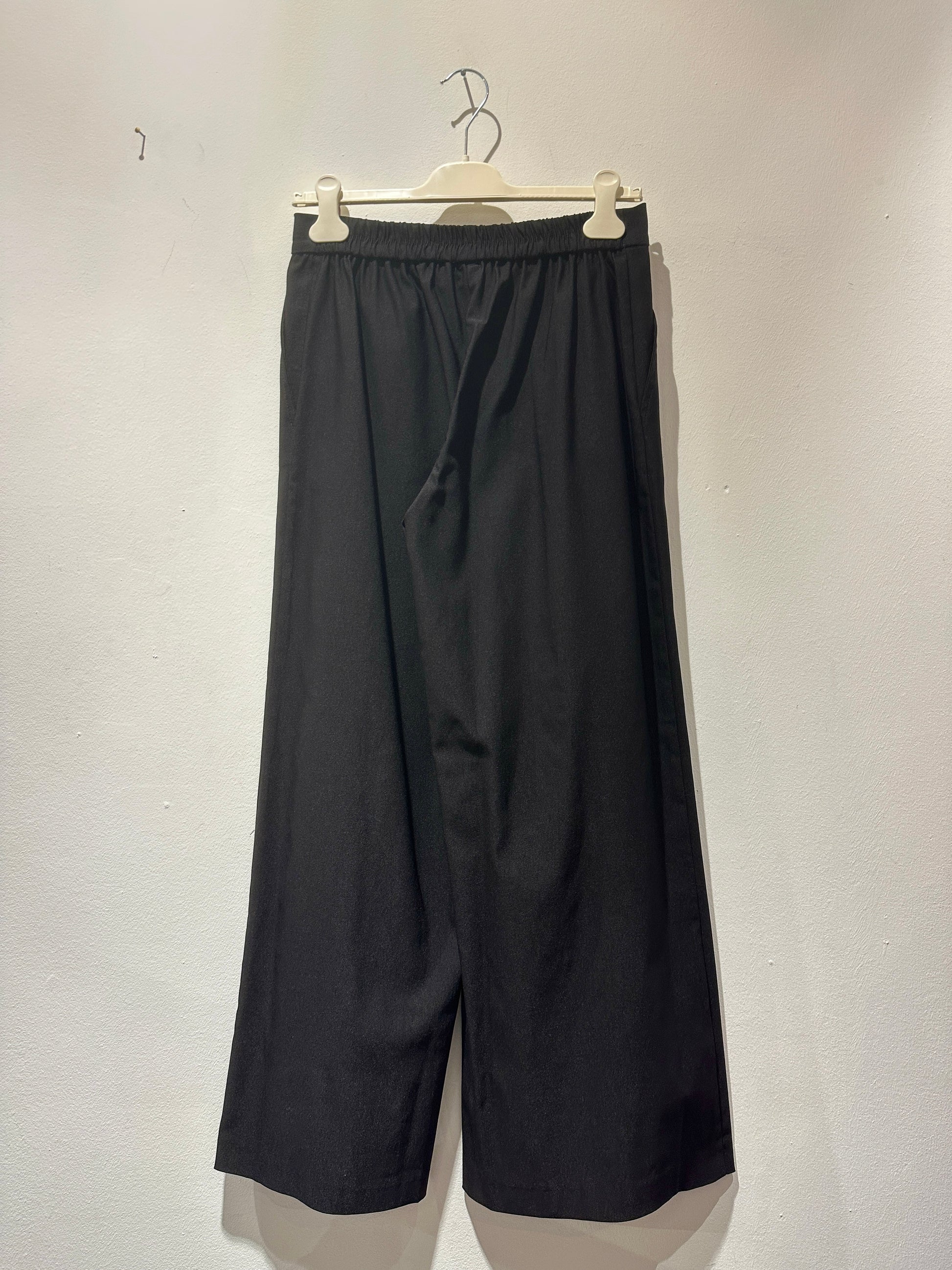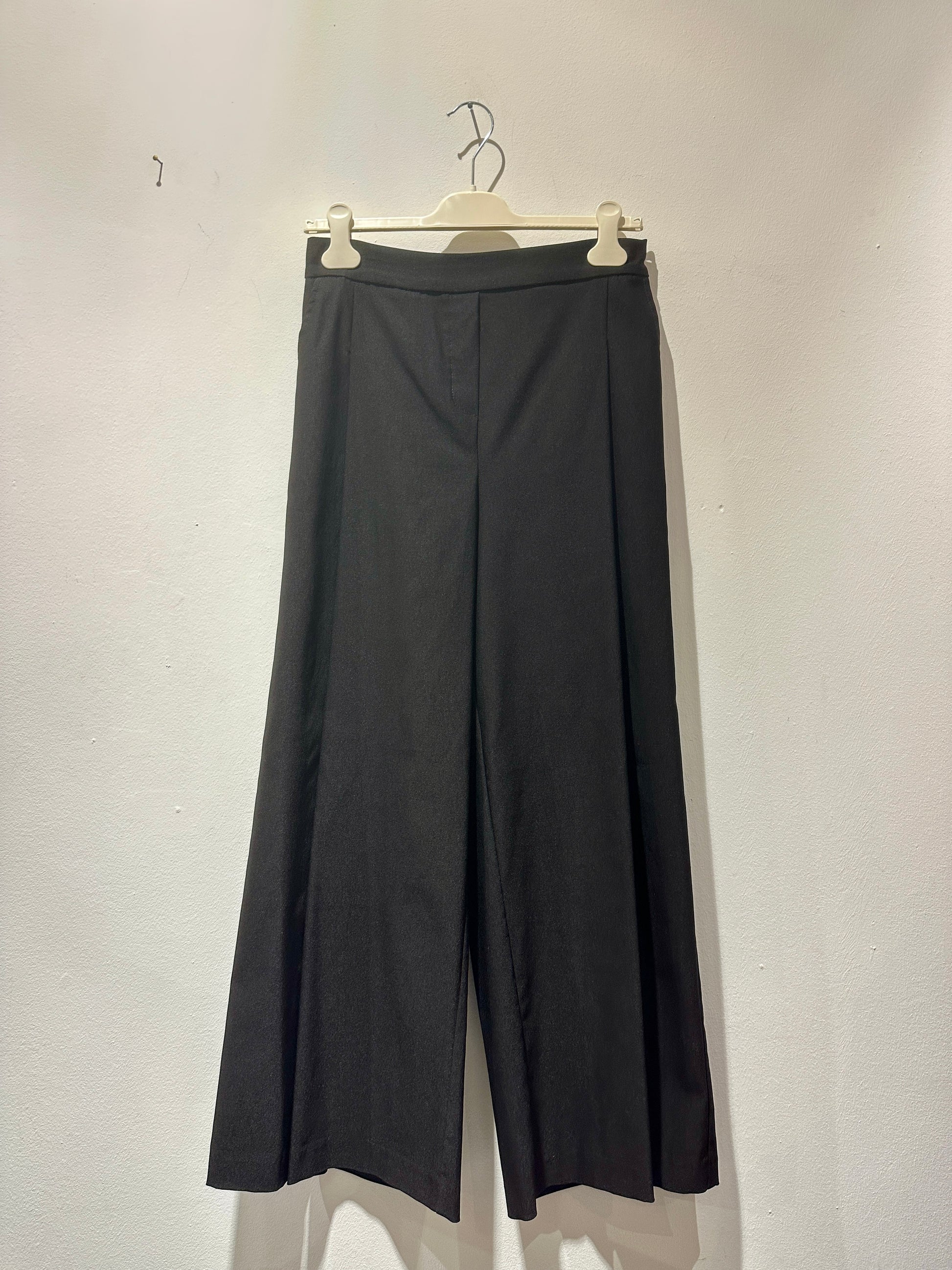 Pantalone liscio a zampa senza cuciture, con pences e tasche laterali a filetto. Vestibilità molto grande.