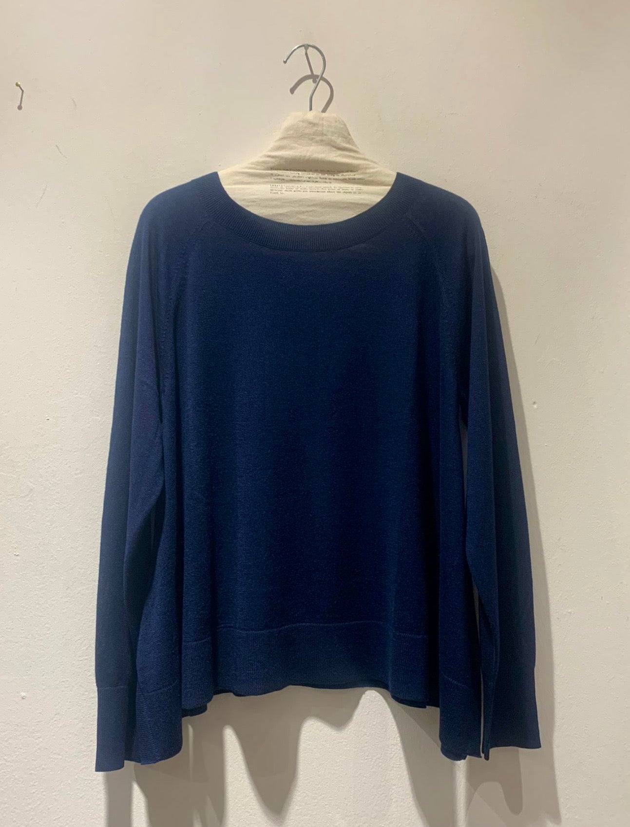 Maglia raglan blu navy con punte laterali, scollo rotondo, bordi a coste e spacchetti laterali.