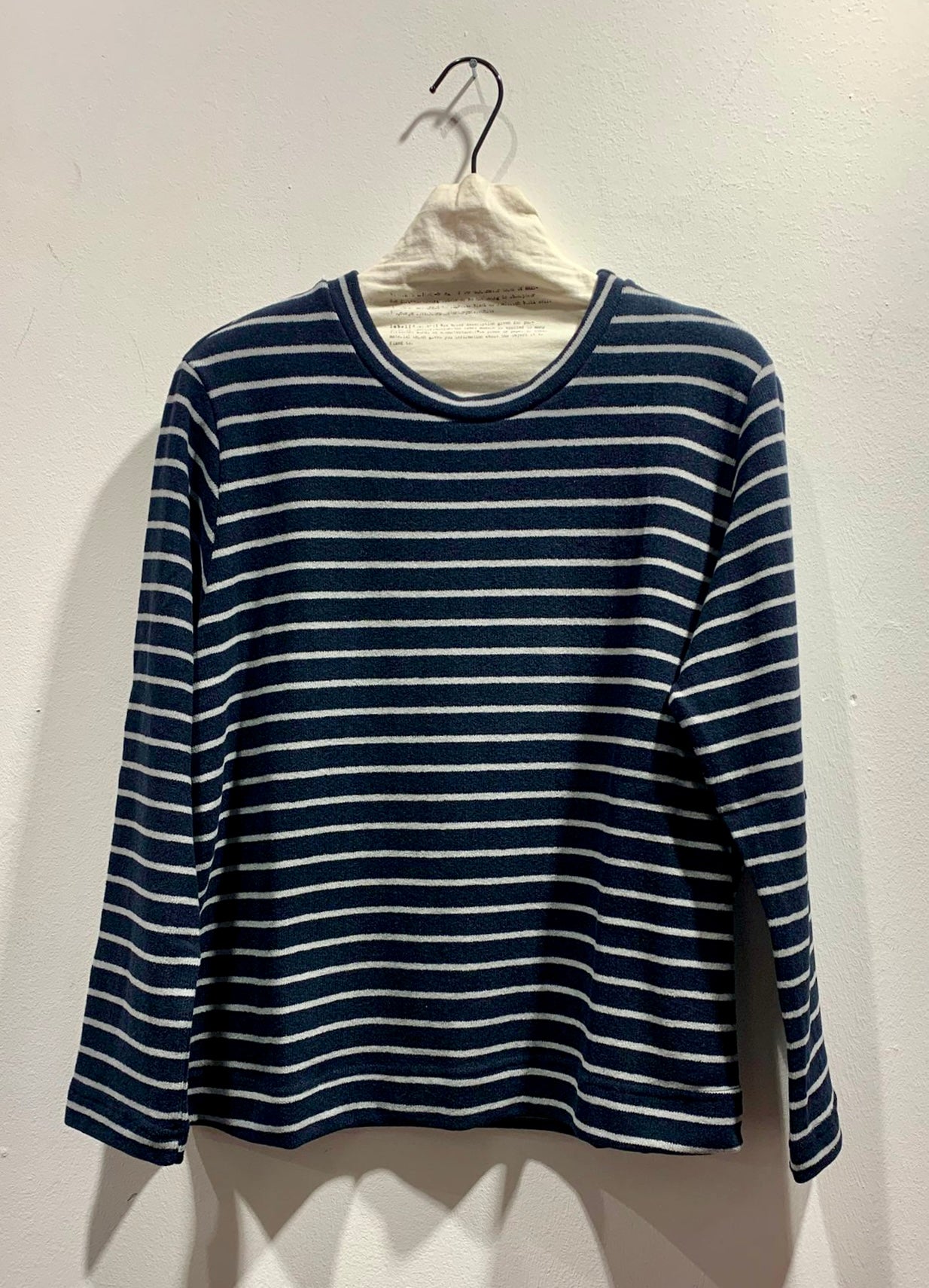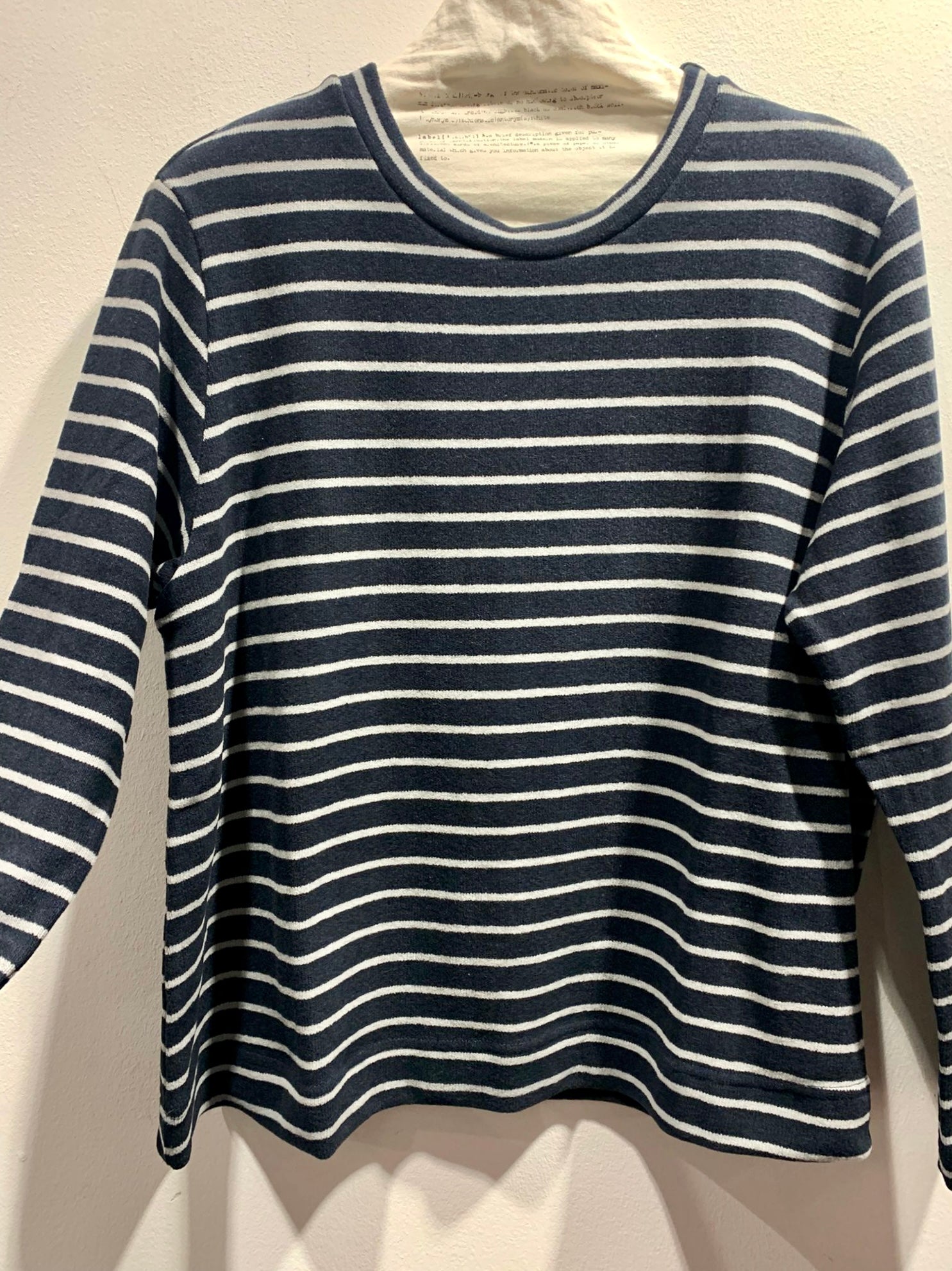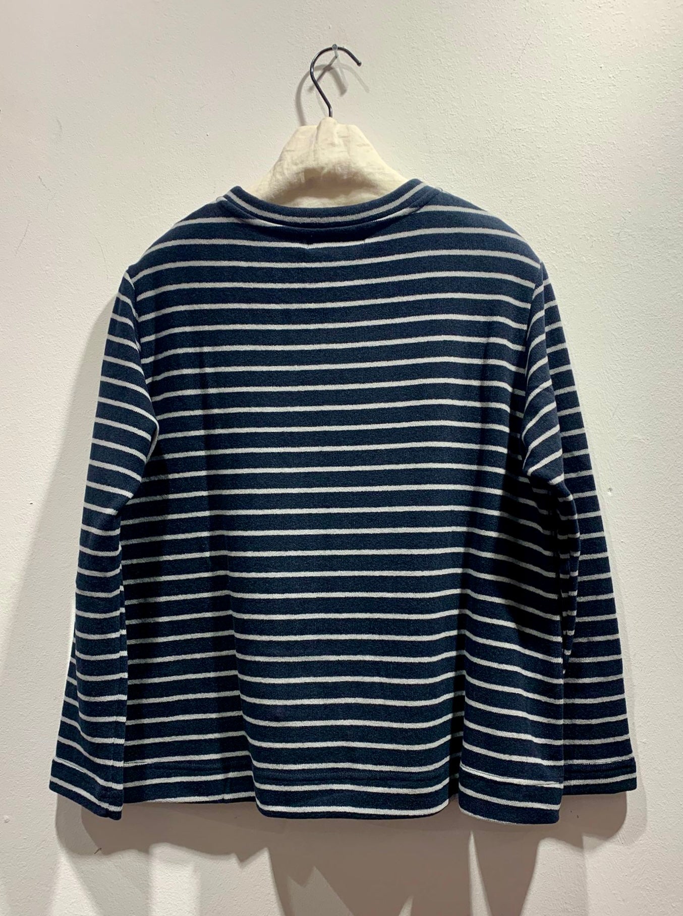 Maglia in caldo cotone a righe sui toni del blu notte/grigio.