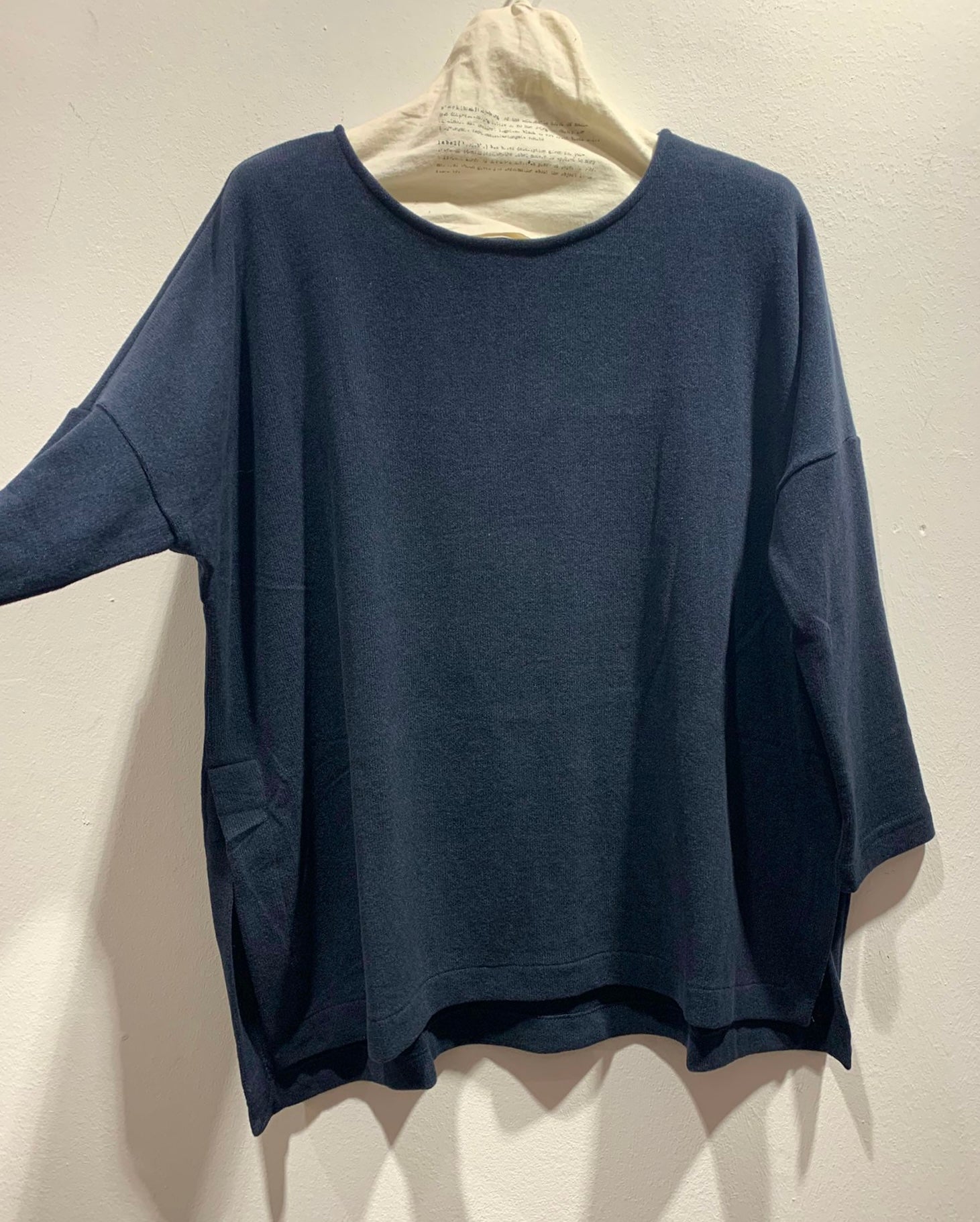 Maglia morbida blu notte in caldo cotone con scollo ampio rotondo e spacchi laterali.
