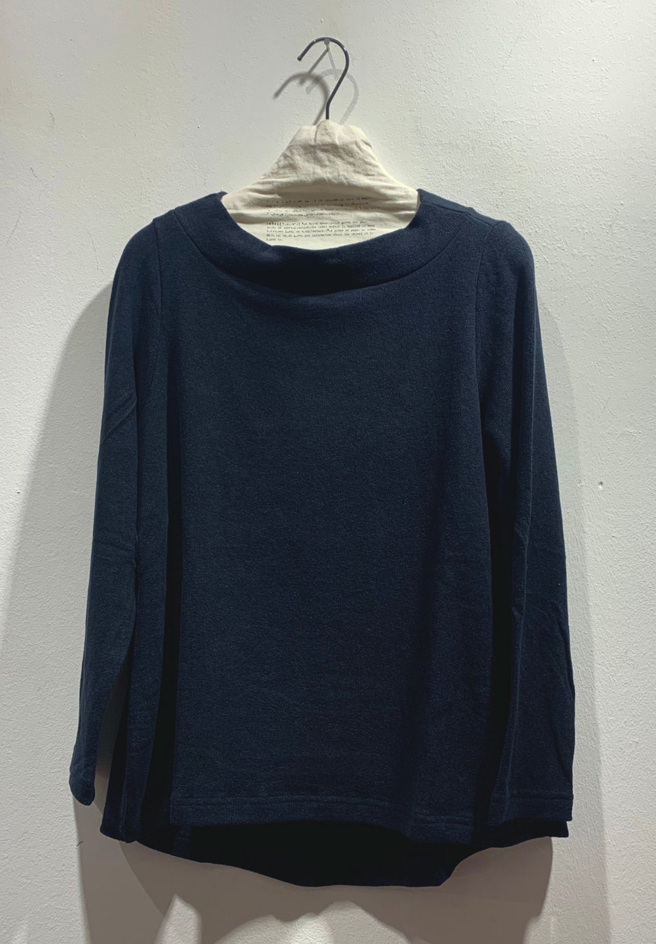 Maglia blu notte in caldo cotone con scollo ampio, leggermente più lunga dietro.