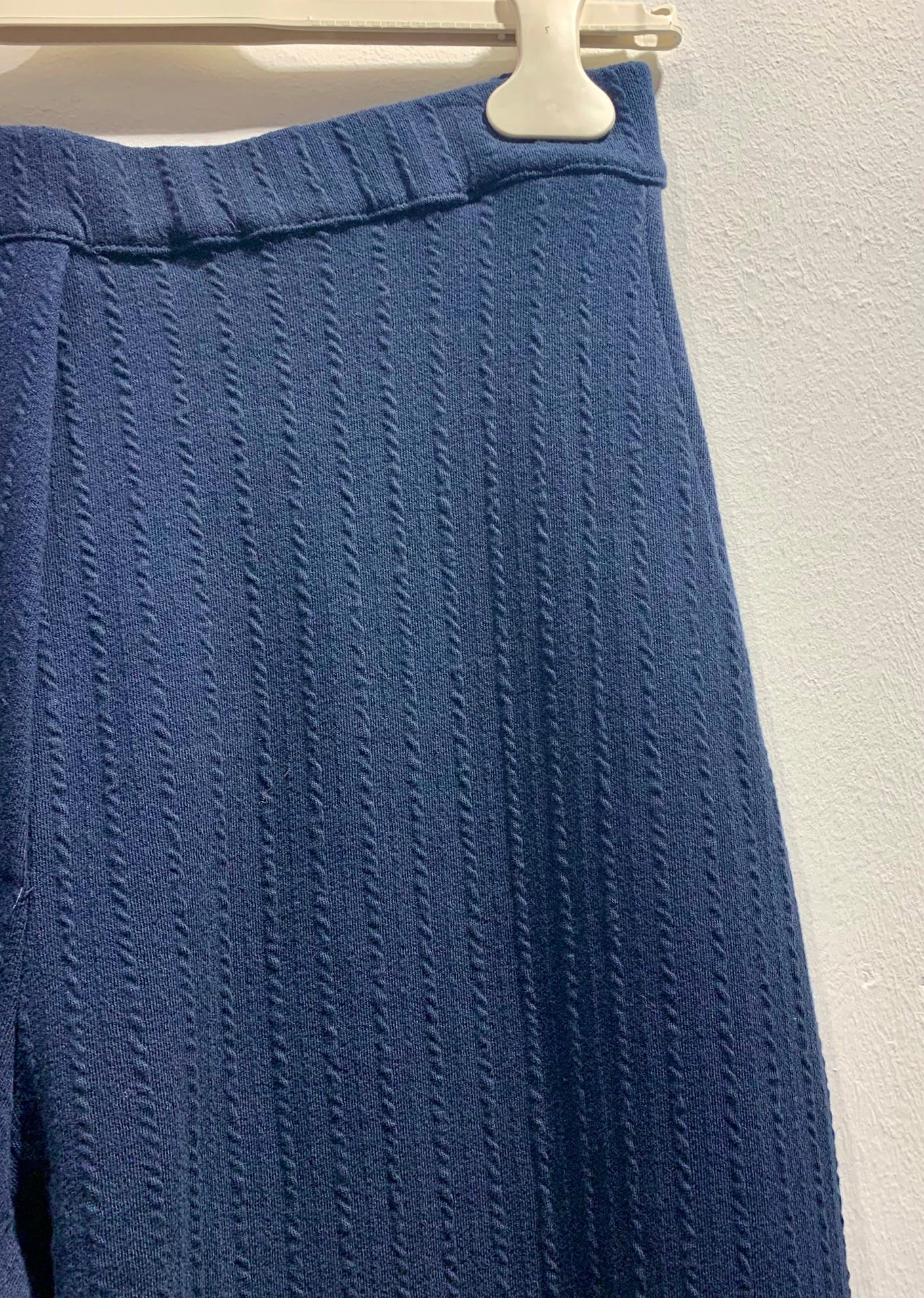 Pantalone blu notte con dettagli in rilievo, gamba morbida ripresa in fondo, tasche laterali a filetto, elastico in vita e tasca applicata sulla parte posteriore.