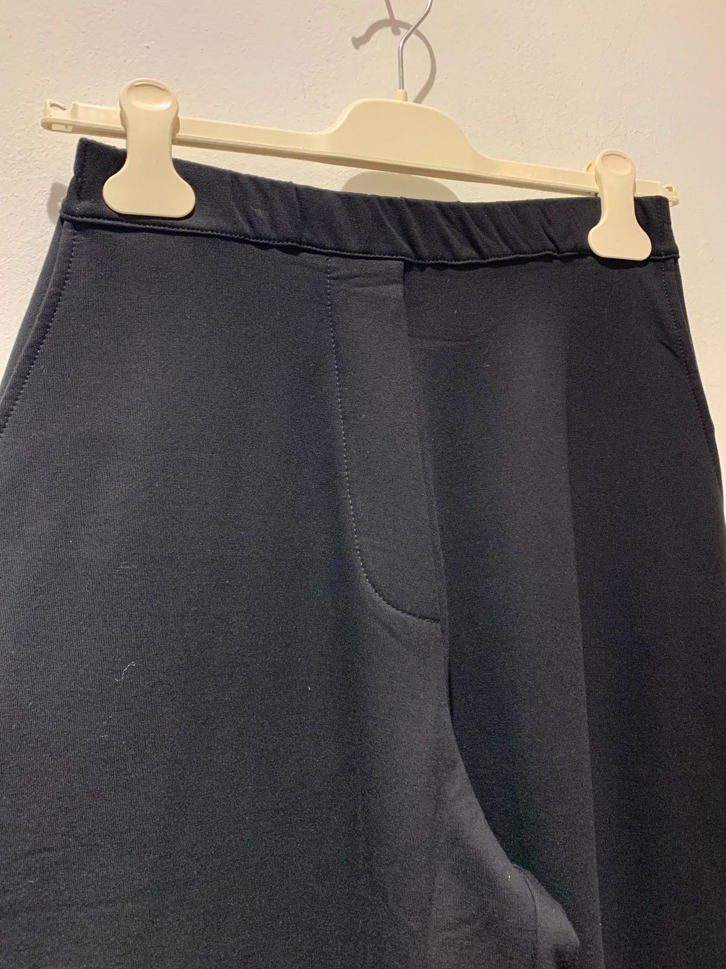 Pantalone nero in felpa con gamba morbida ripresa in fondo, tasche laterali a filetto, elastico in vita e tasca applicata sulla parte posteriore.