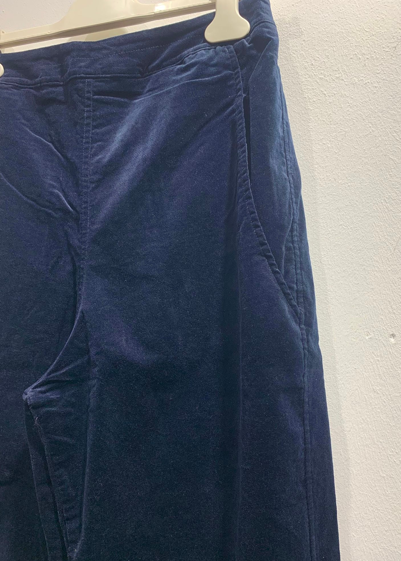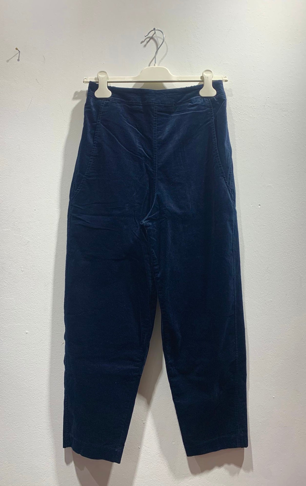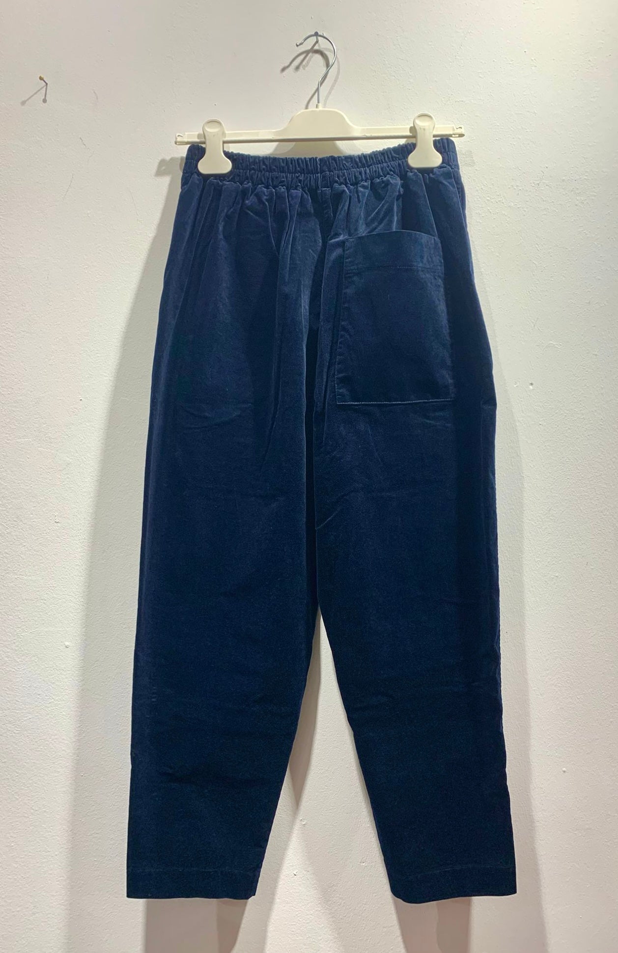 Pantalone in velluto blu notte con gamba dritta, elastico in vita, due tasche frontali e una tasca applicata sulla parte posteriore.