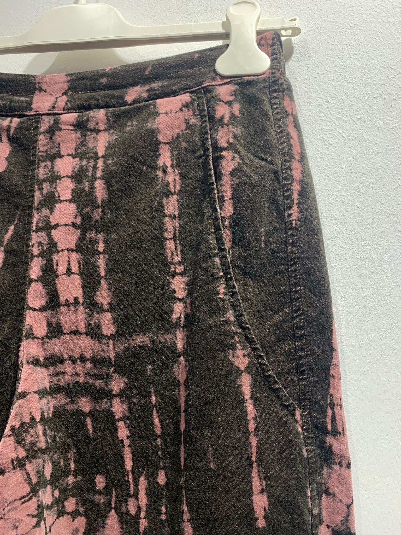 Pantalone dritto stampato rosa e marrone con tasche laterali a filetto, elastico in vita e tasca applicata sul retro.