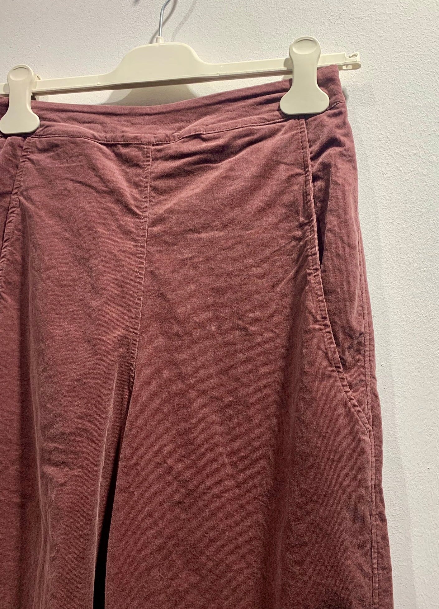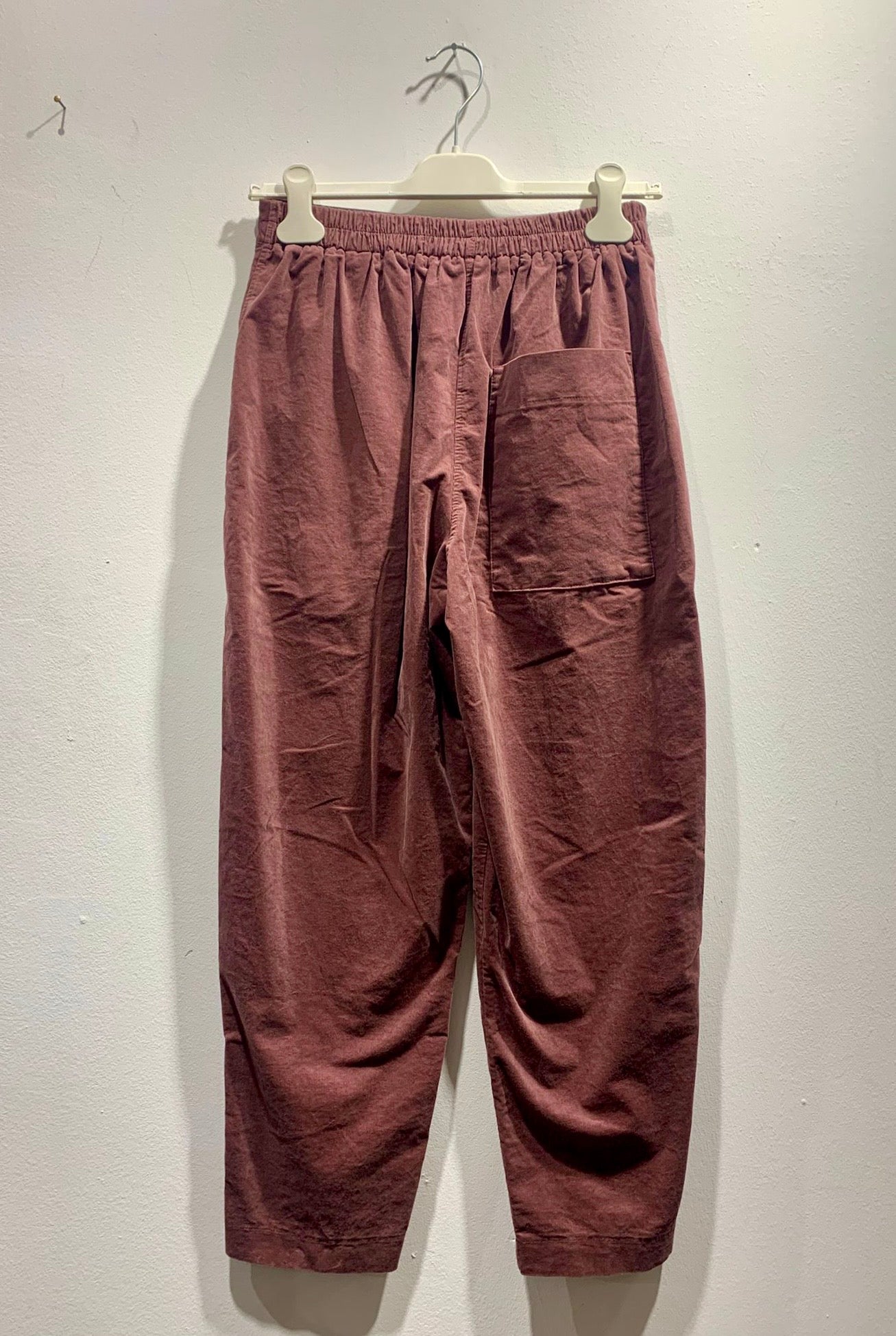 Pantalone in velluto con gamba dritta, elastico in vita, due tasche frontali e una tasca applicata sulla parte posteriore.