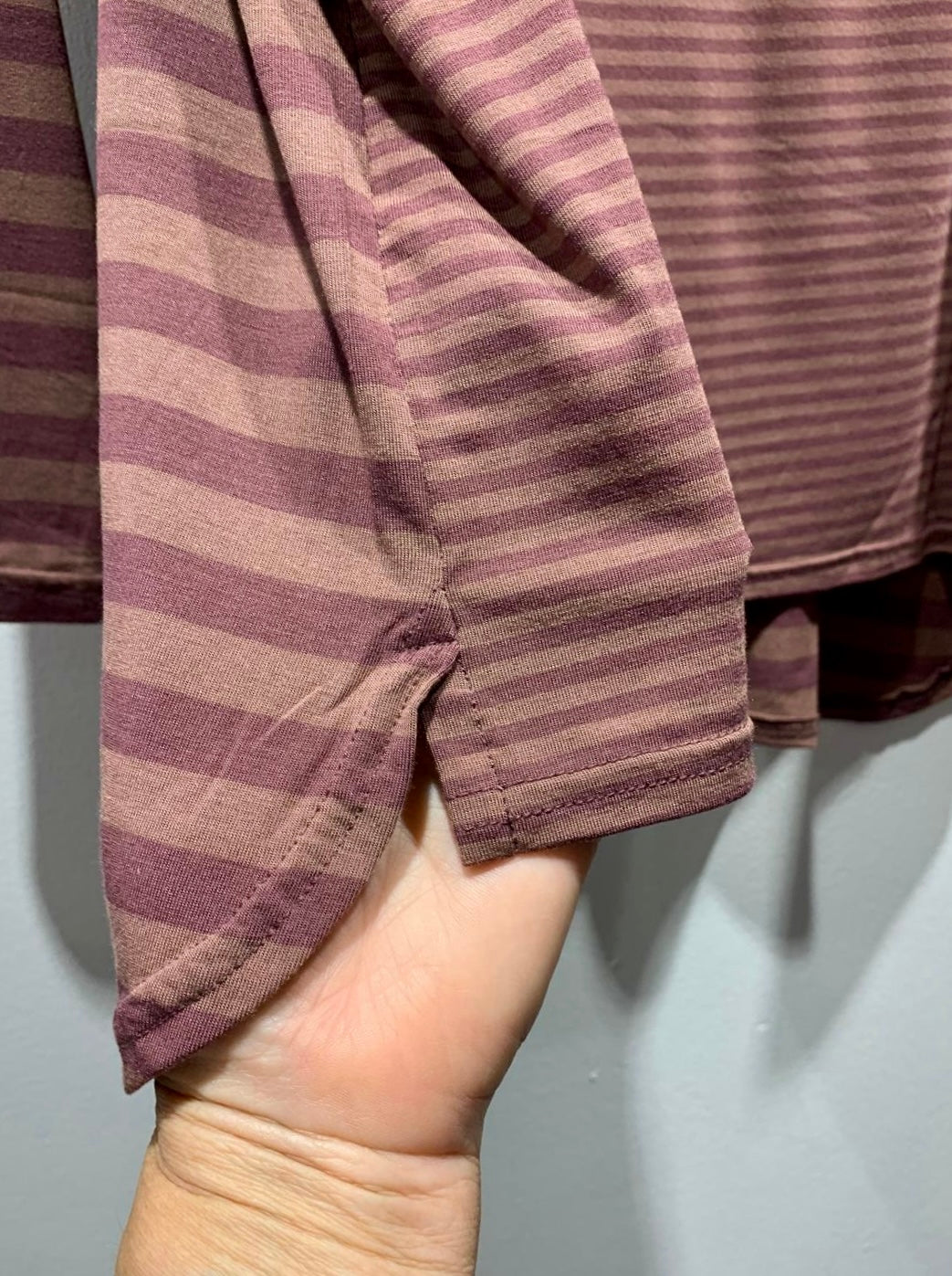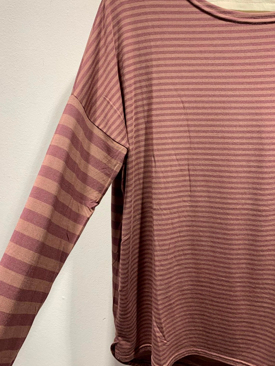 T-shirt morbida rigata in micromodal con manica lunga, scollo rotondo, leggermente più lunga dietro.