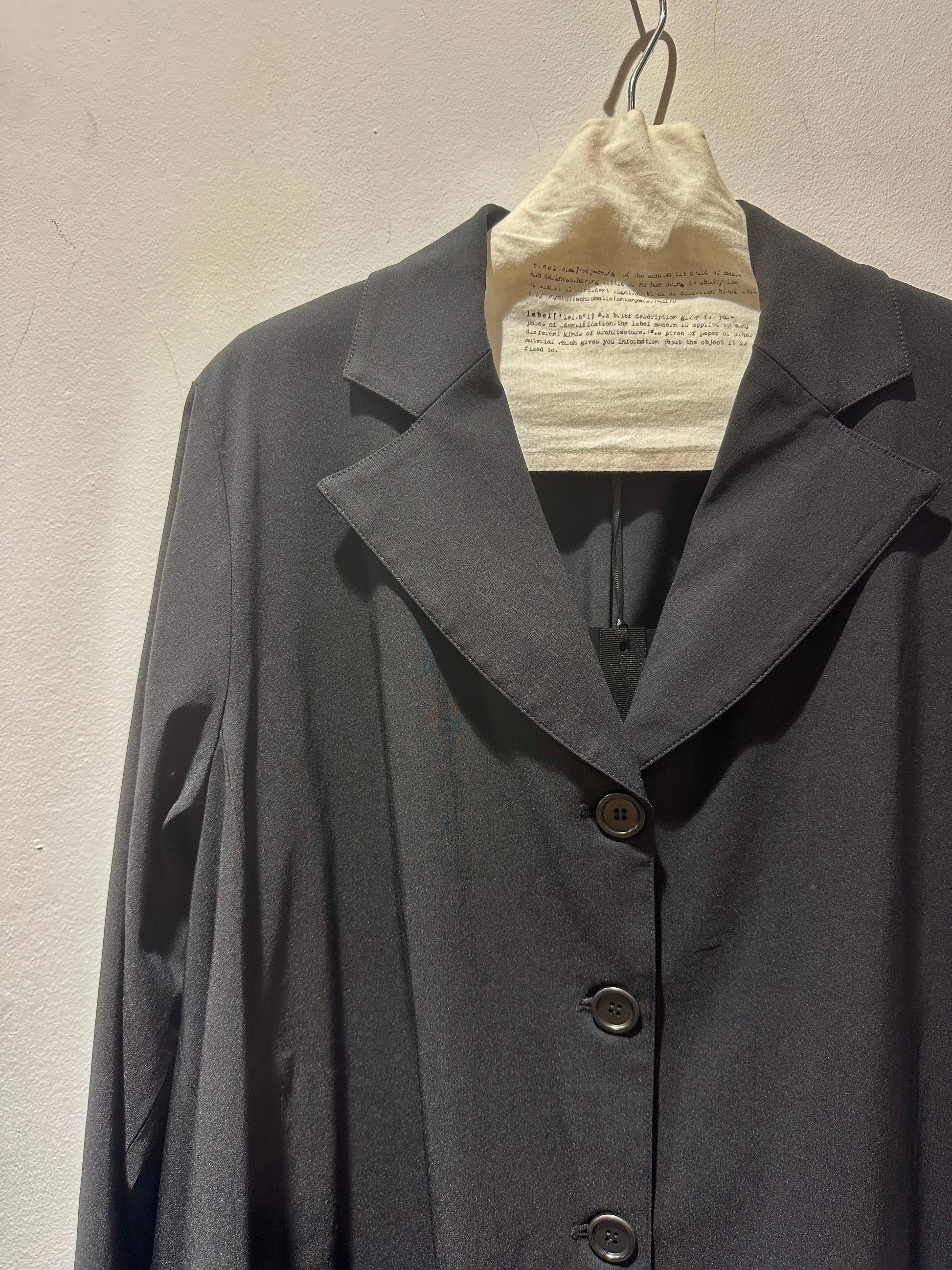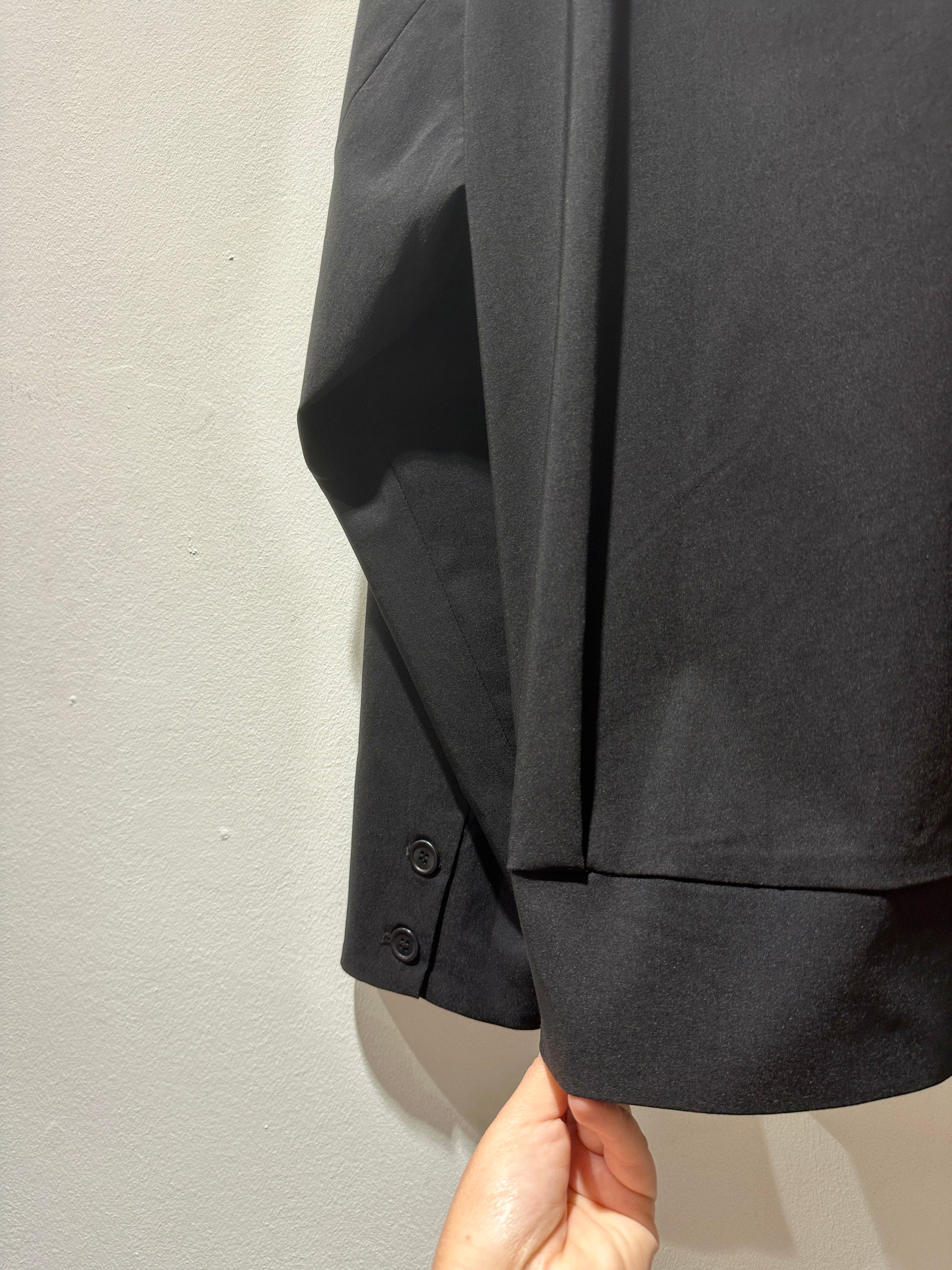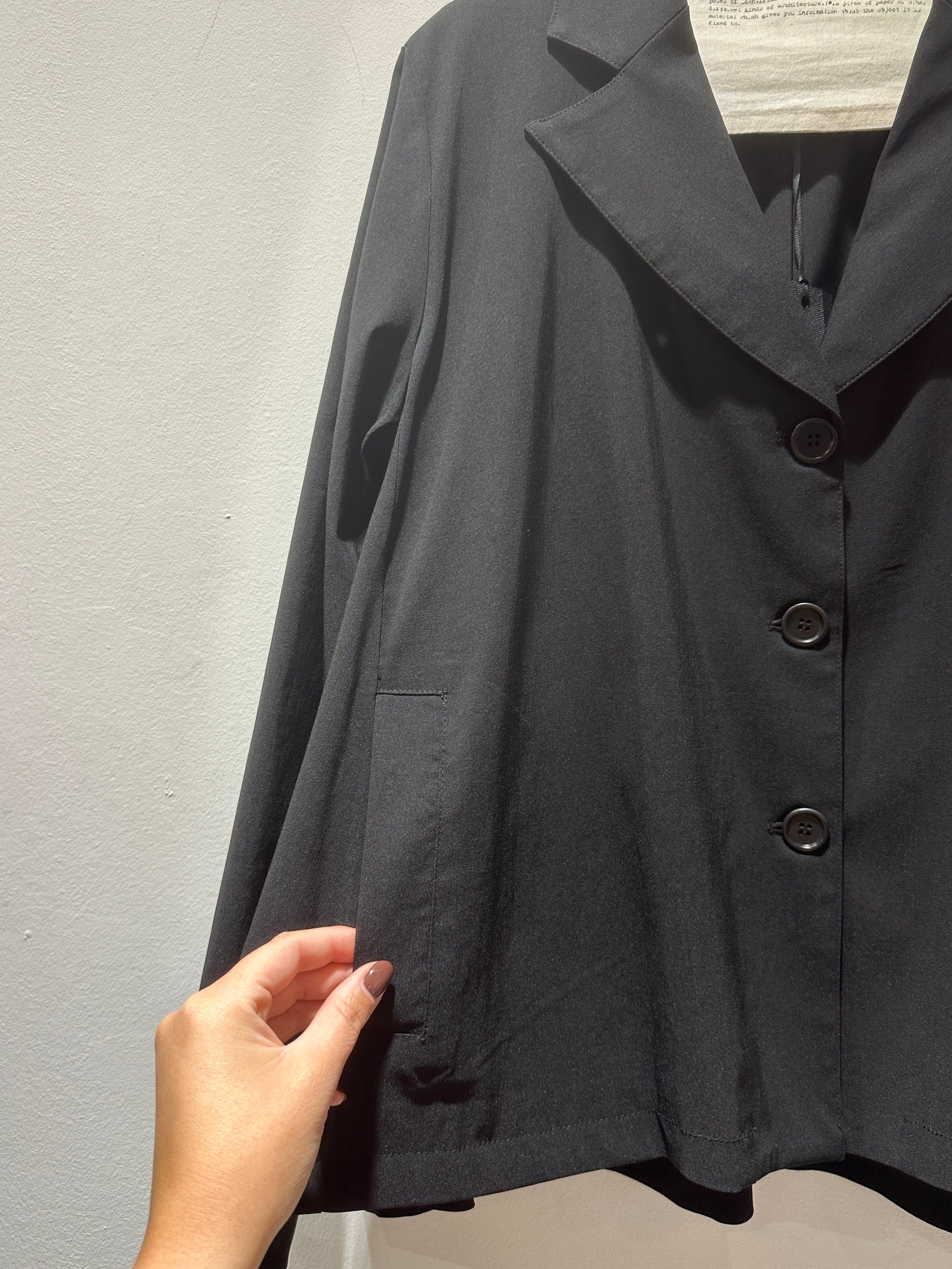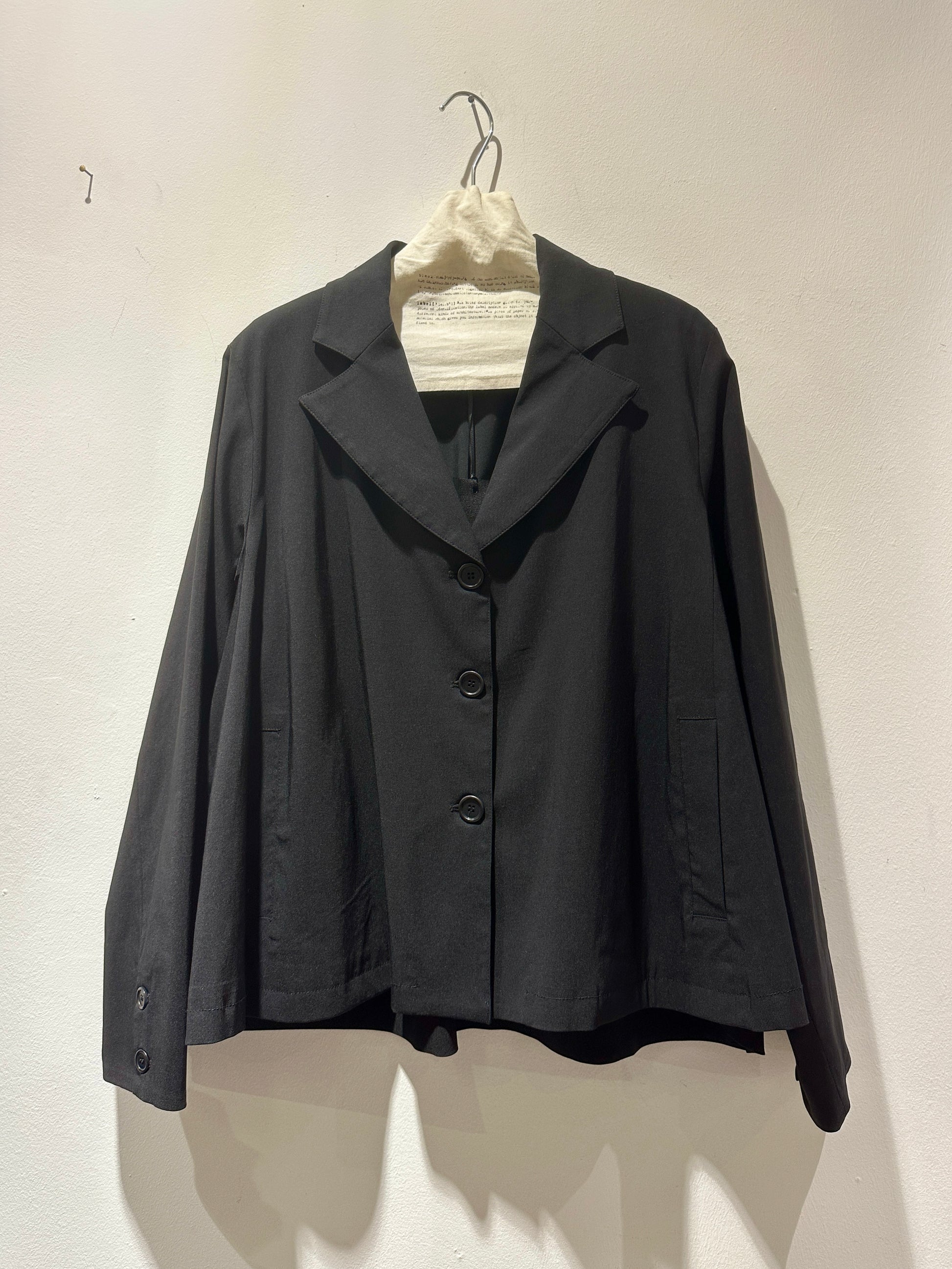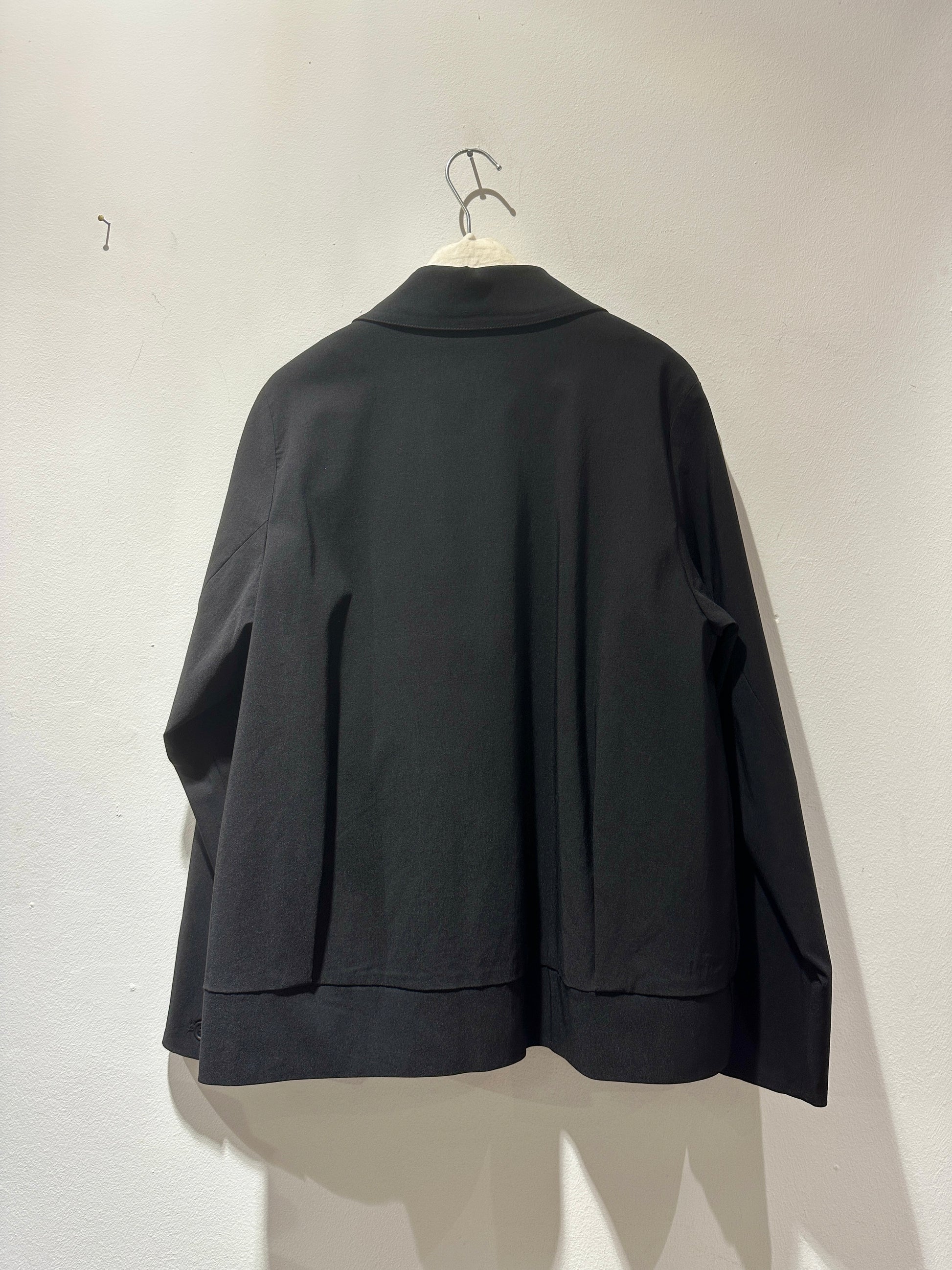 Giacca nera in tessuto tecnico con colletto e scollo a V, tasche laterali a filetto e chiusura frontale a bottoni.
