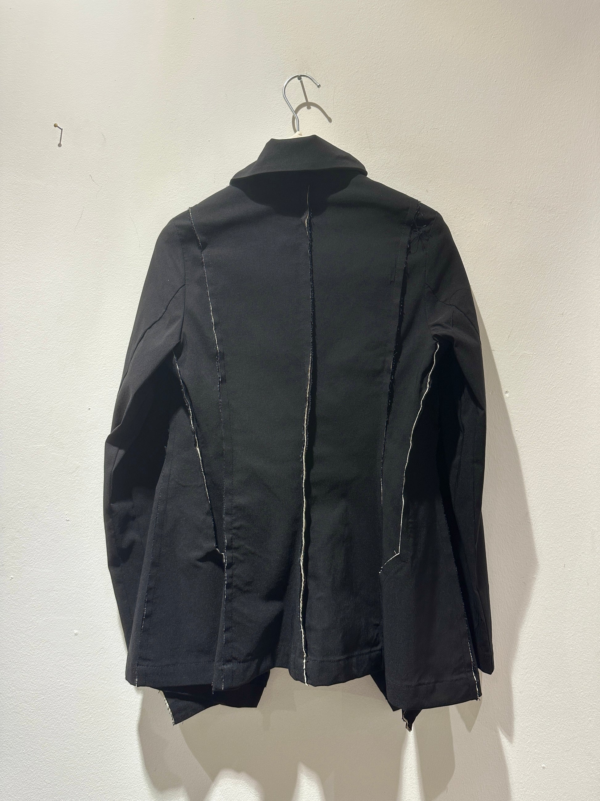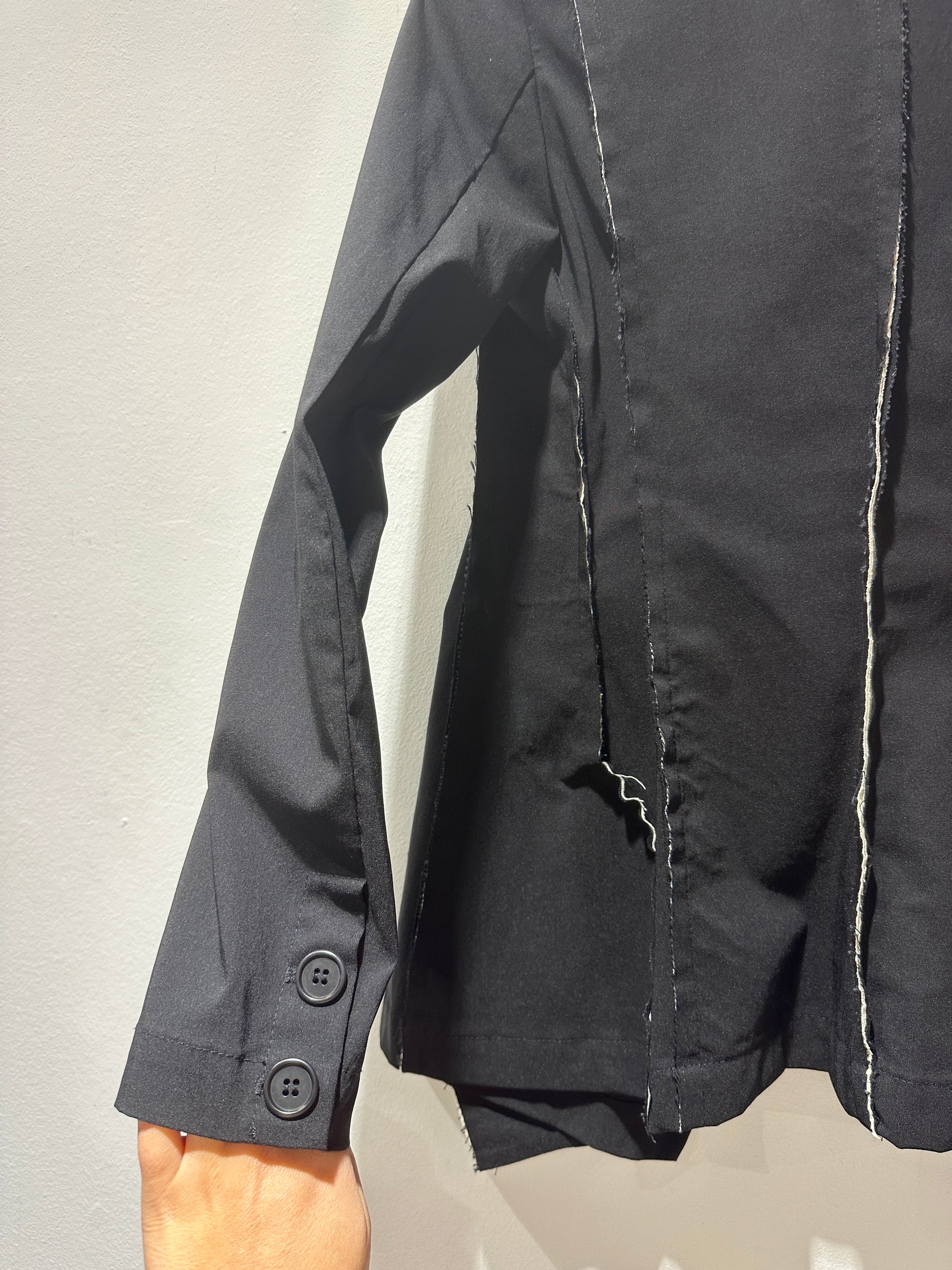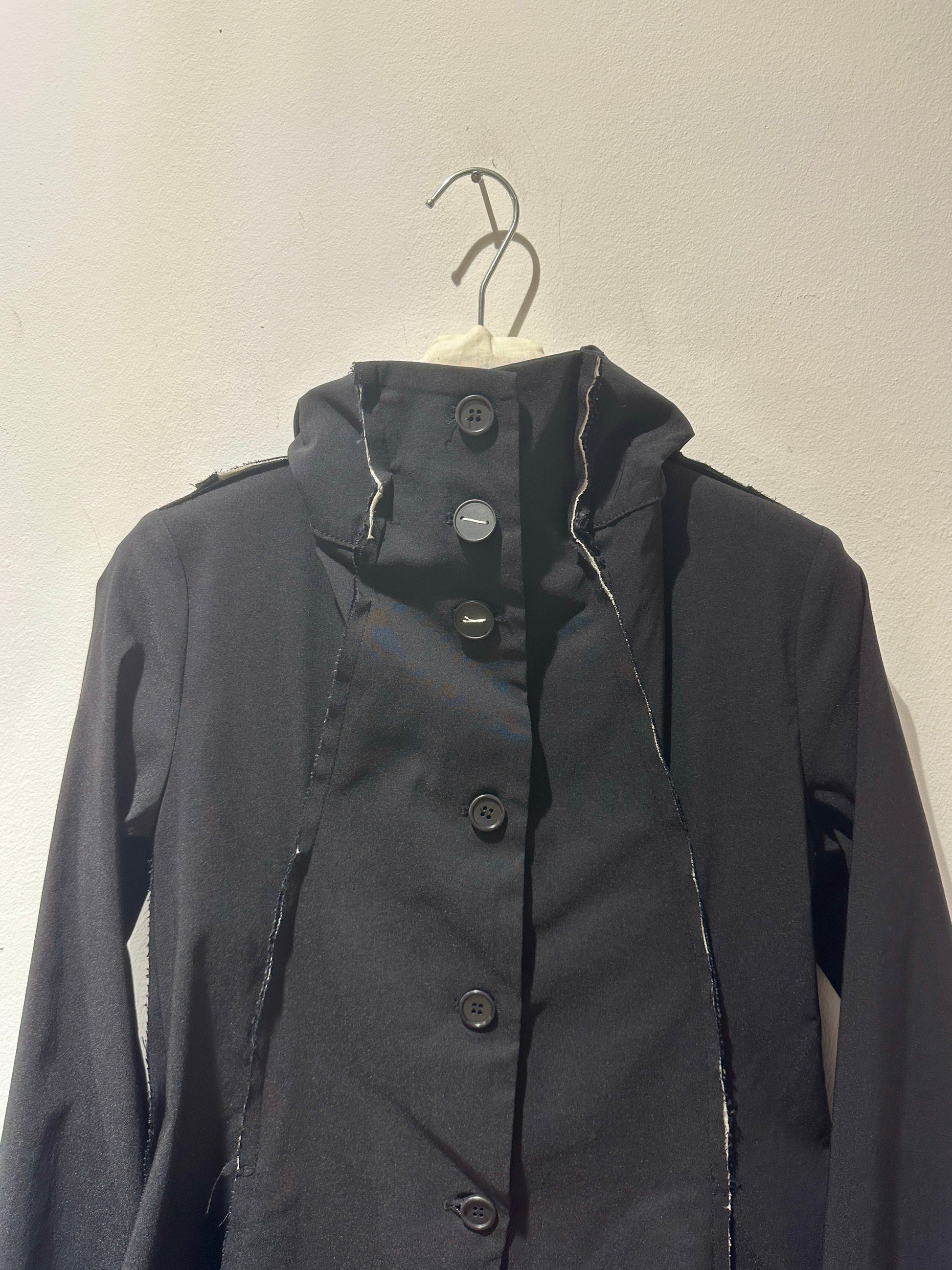 Giacca nera elasticizzato in tessuto tecnico con tagli bianchi in rilievo, collo alto, chiusura frontale a bottoni, tasche laterali e lunghezza svasata.