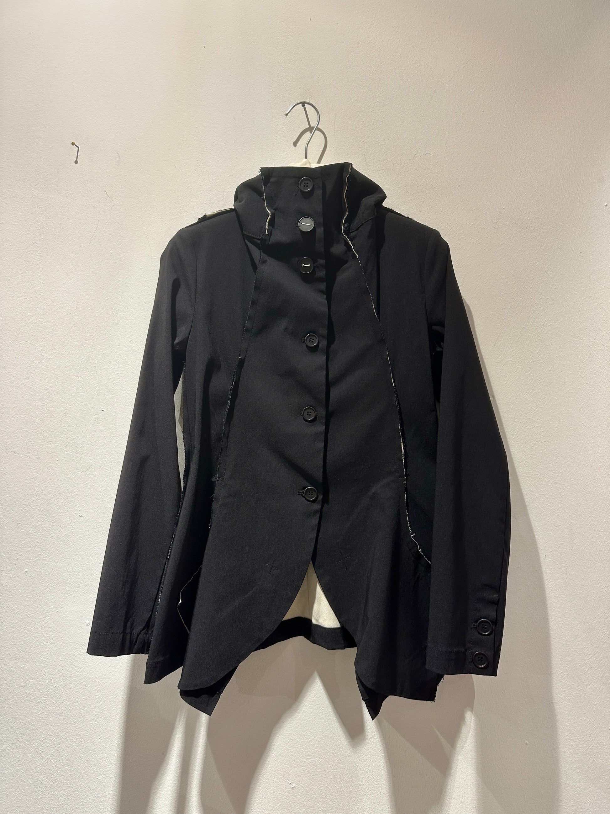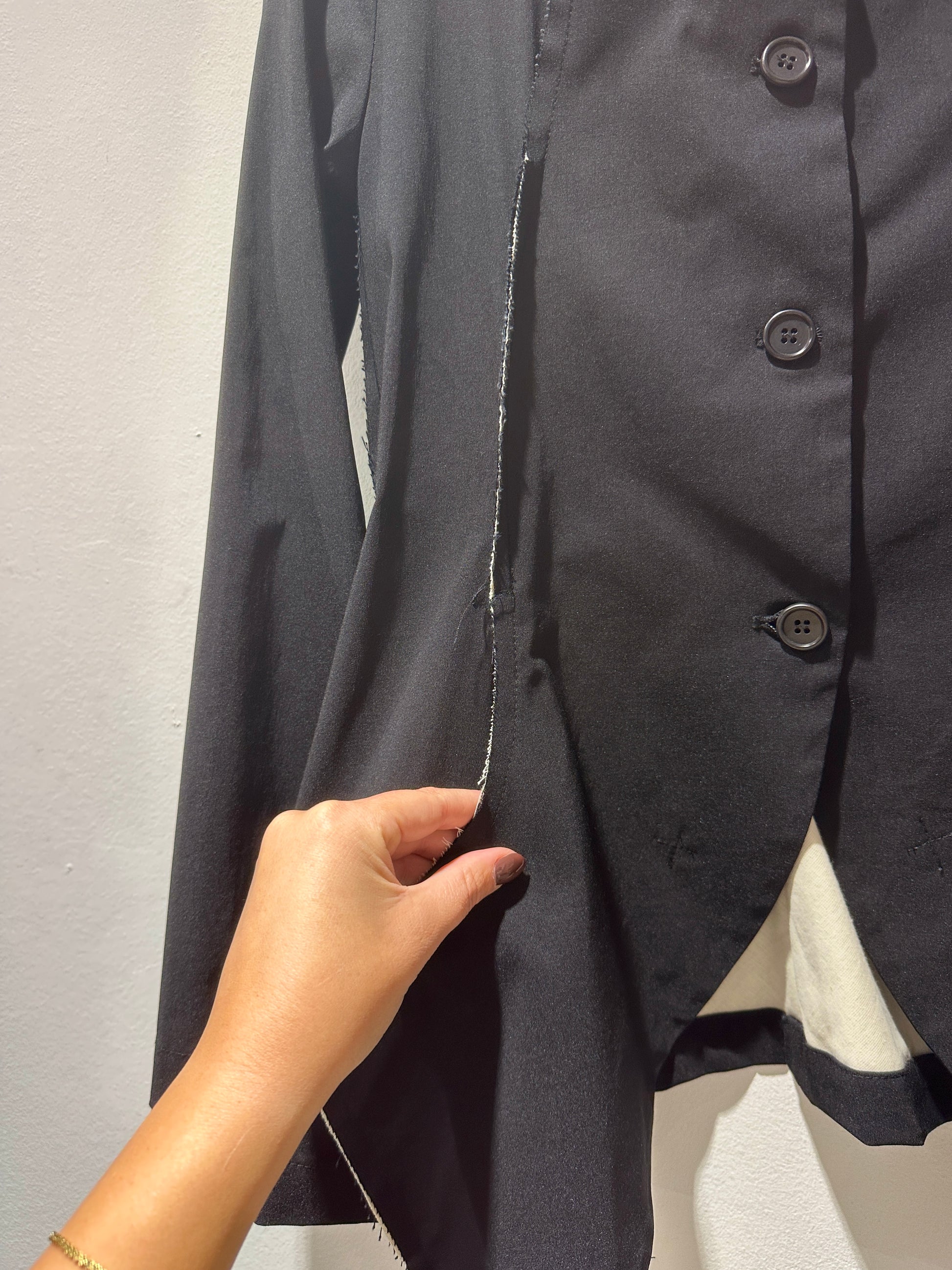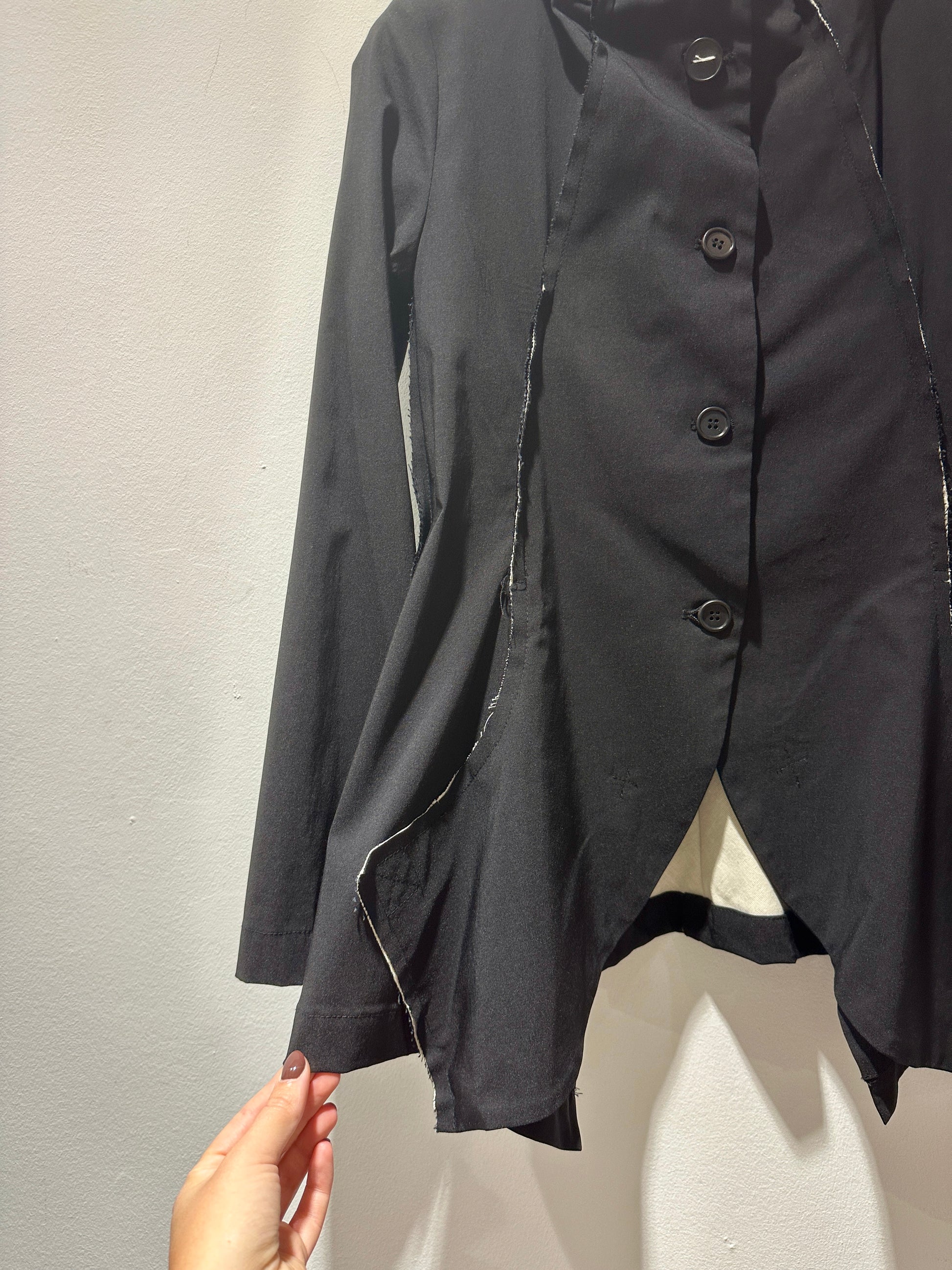 Giacca nera elasticizzato in tessuto tecnico con tagli bianchi in rilievo, collo alto, chiusura frontale a bottoni, tasche laterali e lunghezza svasata.