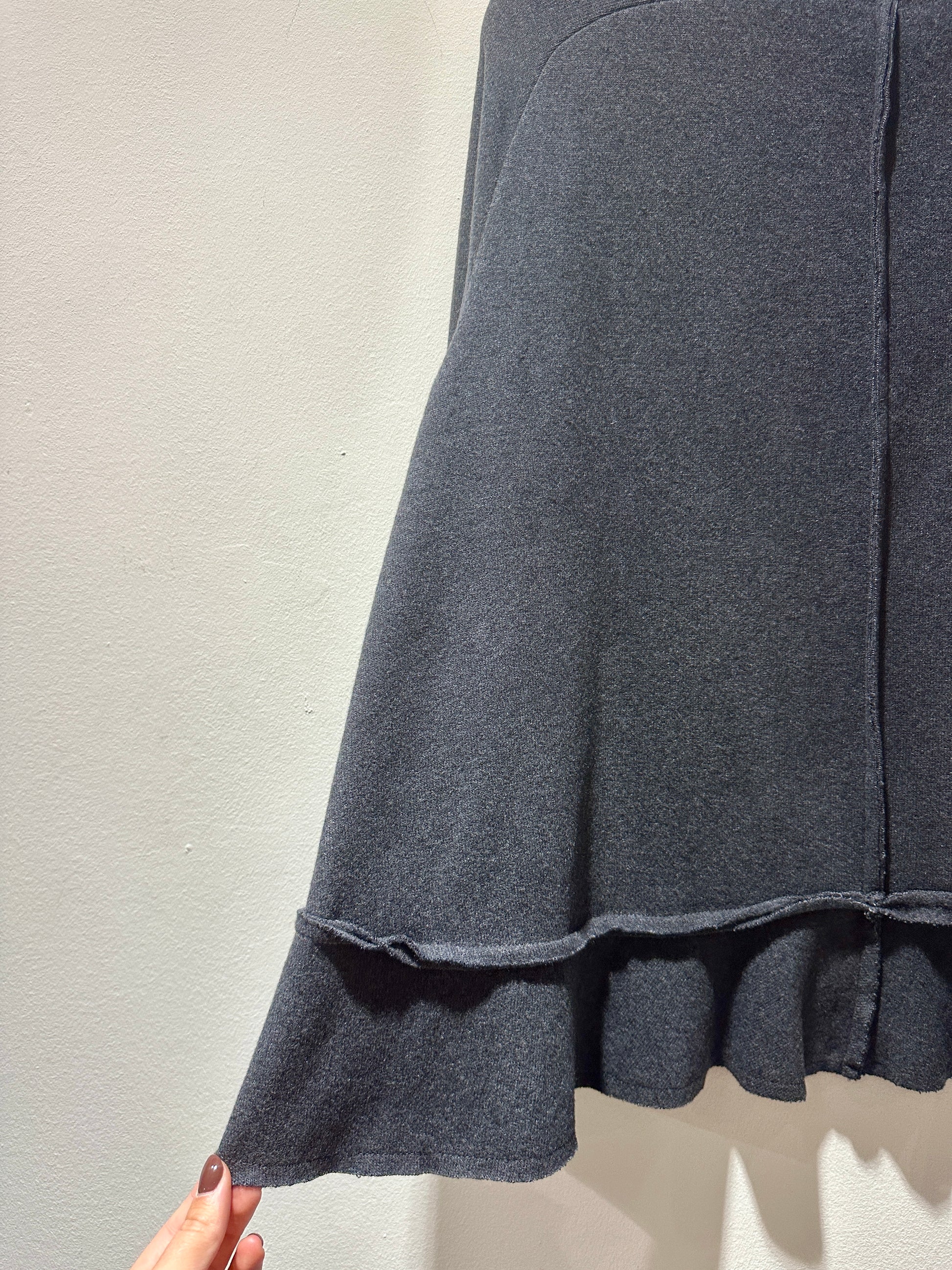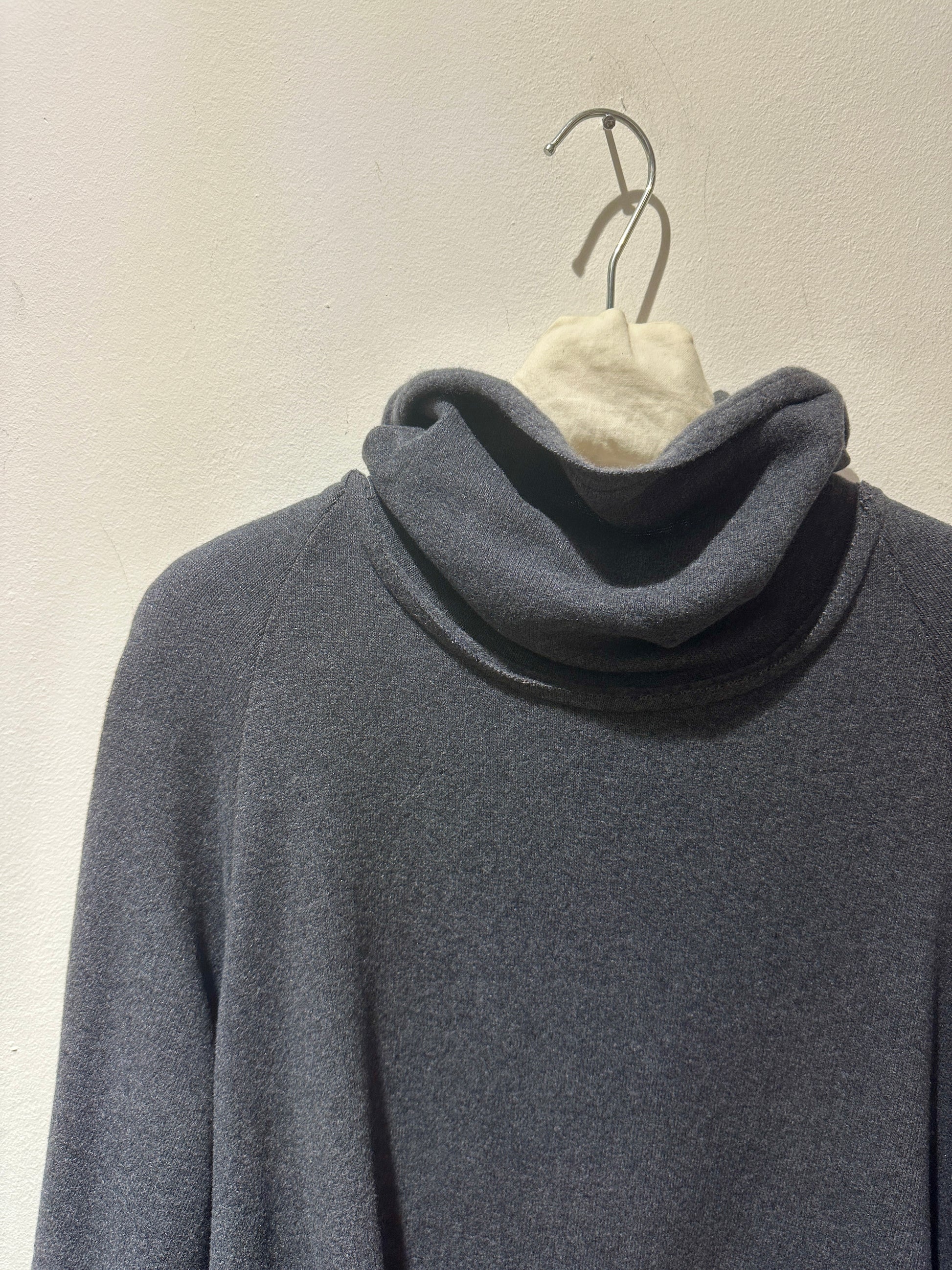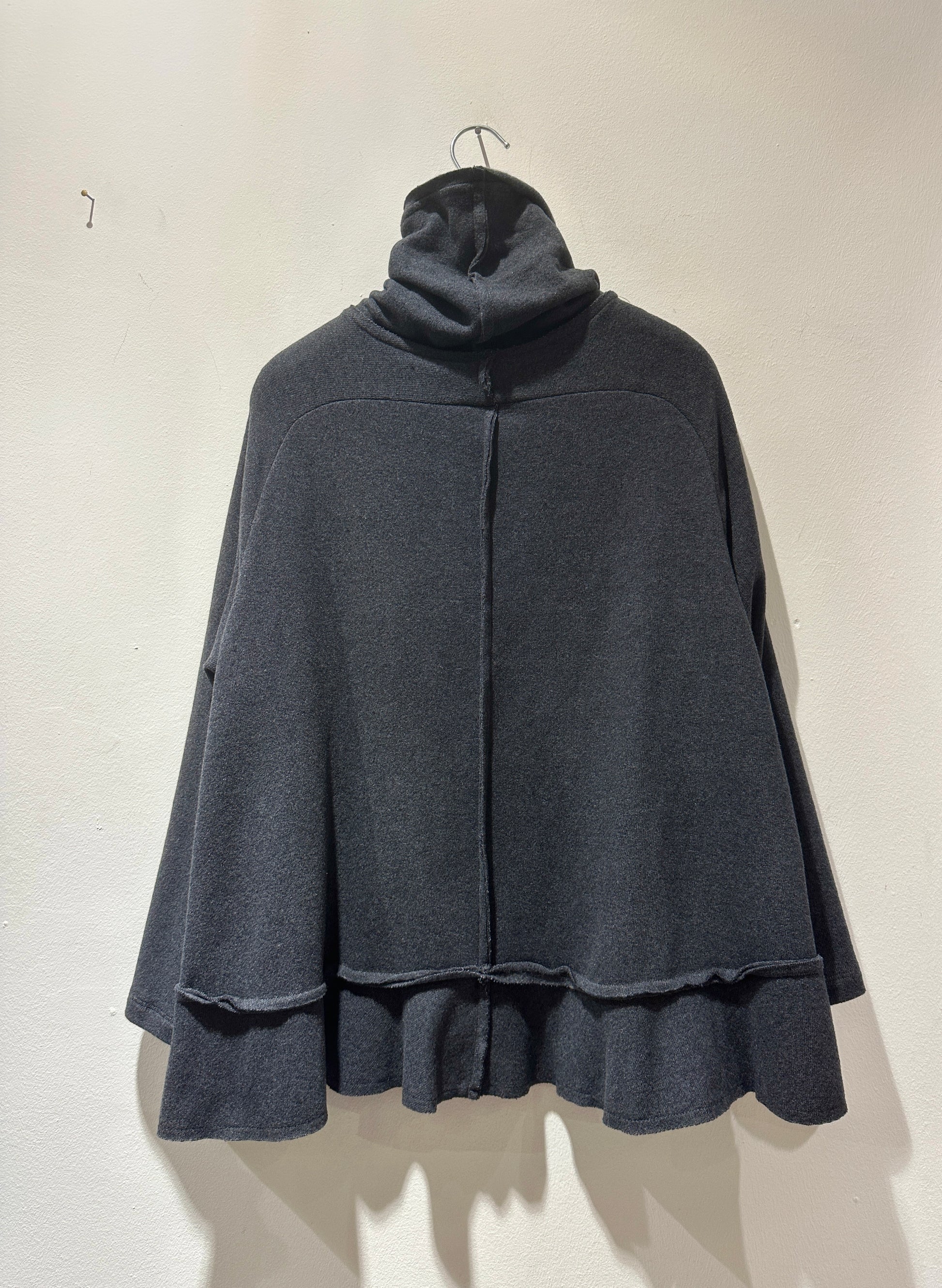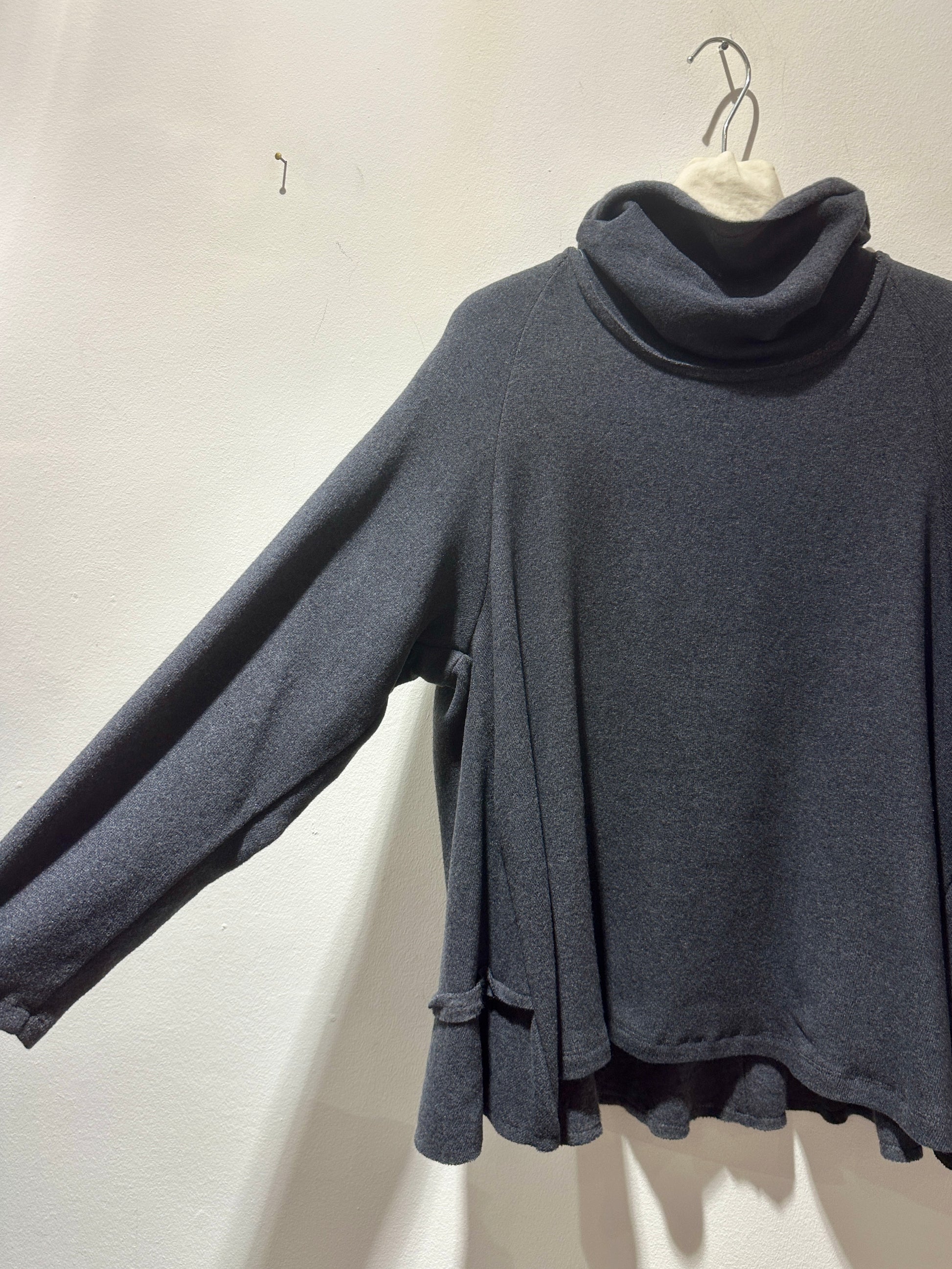 Maglia dolcevita grigio piombo in caldo cotone con collo alto, manica lunga, lunghezza svasata e balza dietro sul fondo.