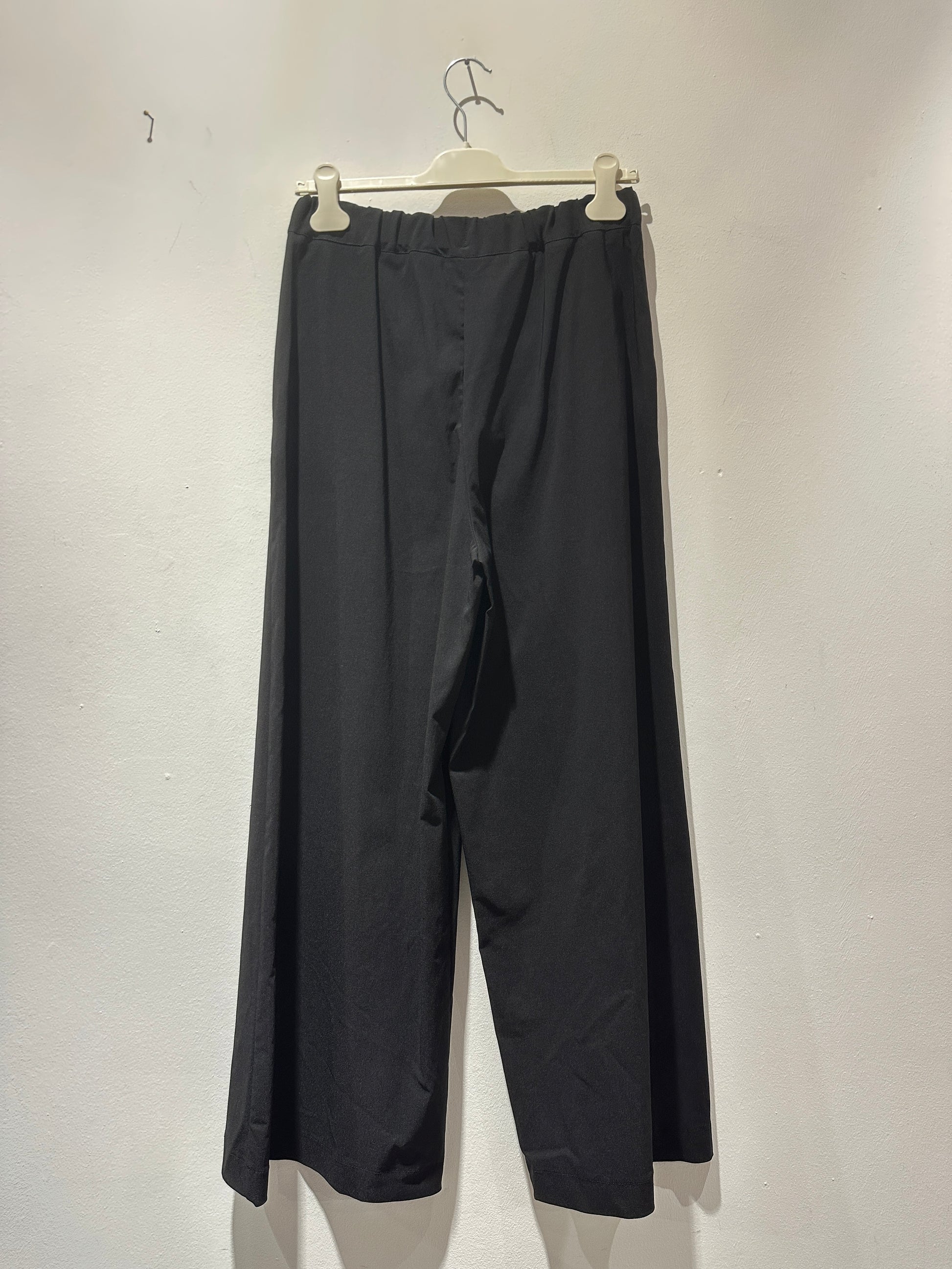Pantalone nero a palazzo in tessuto tecnico con dettaglio a pence sulla parte interna della gamba, tasche laterali a filetto, elastico in vita e chiusura classico con zip e bottone.