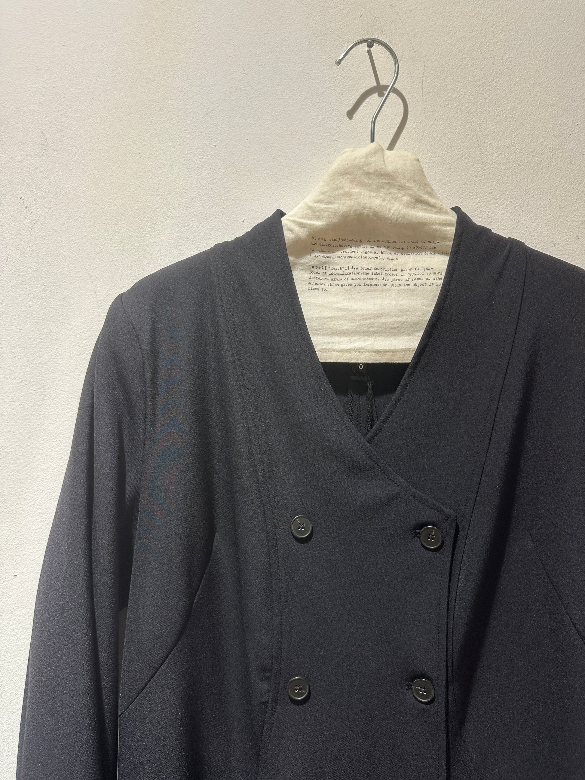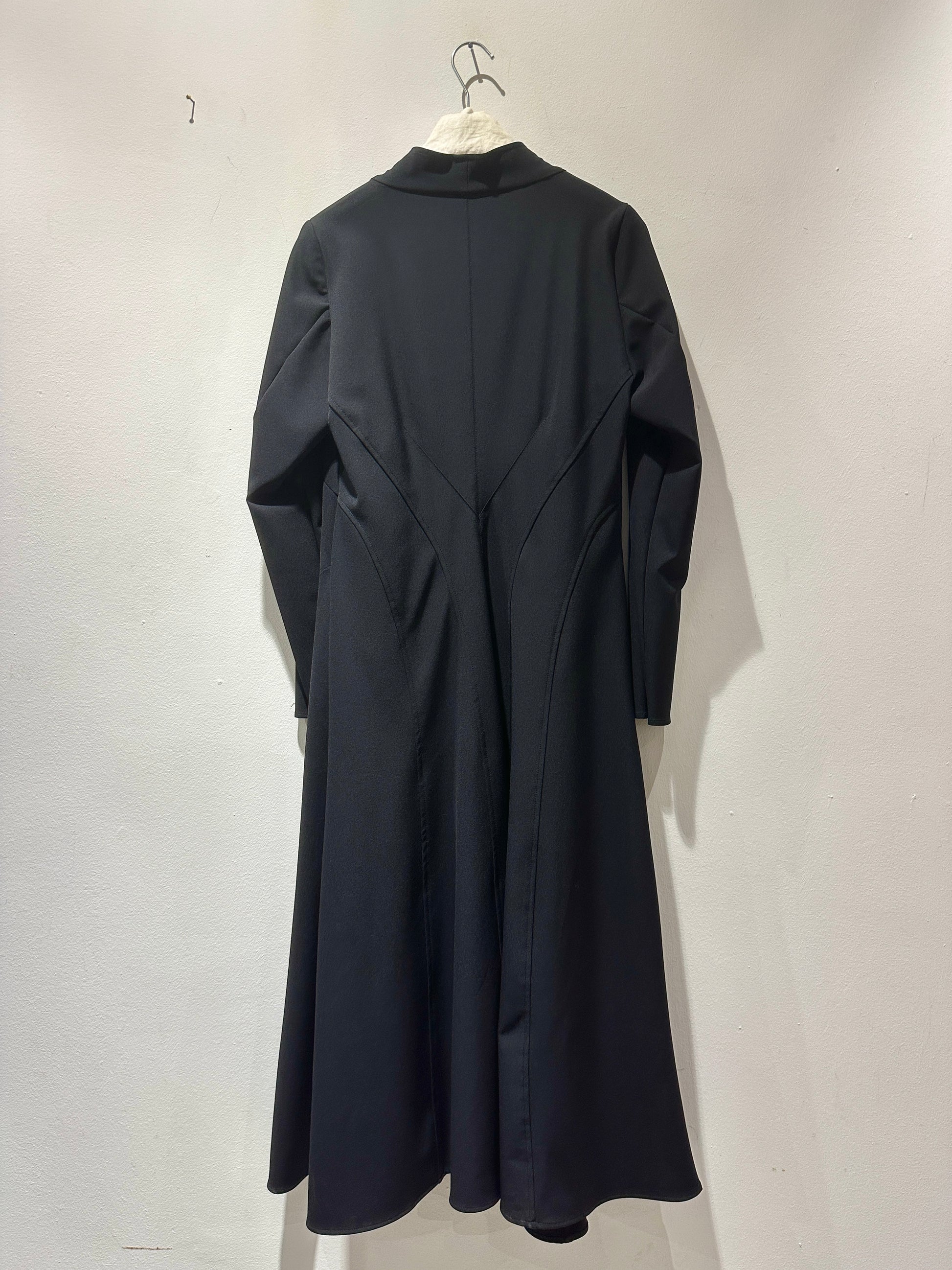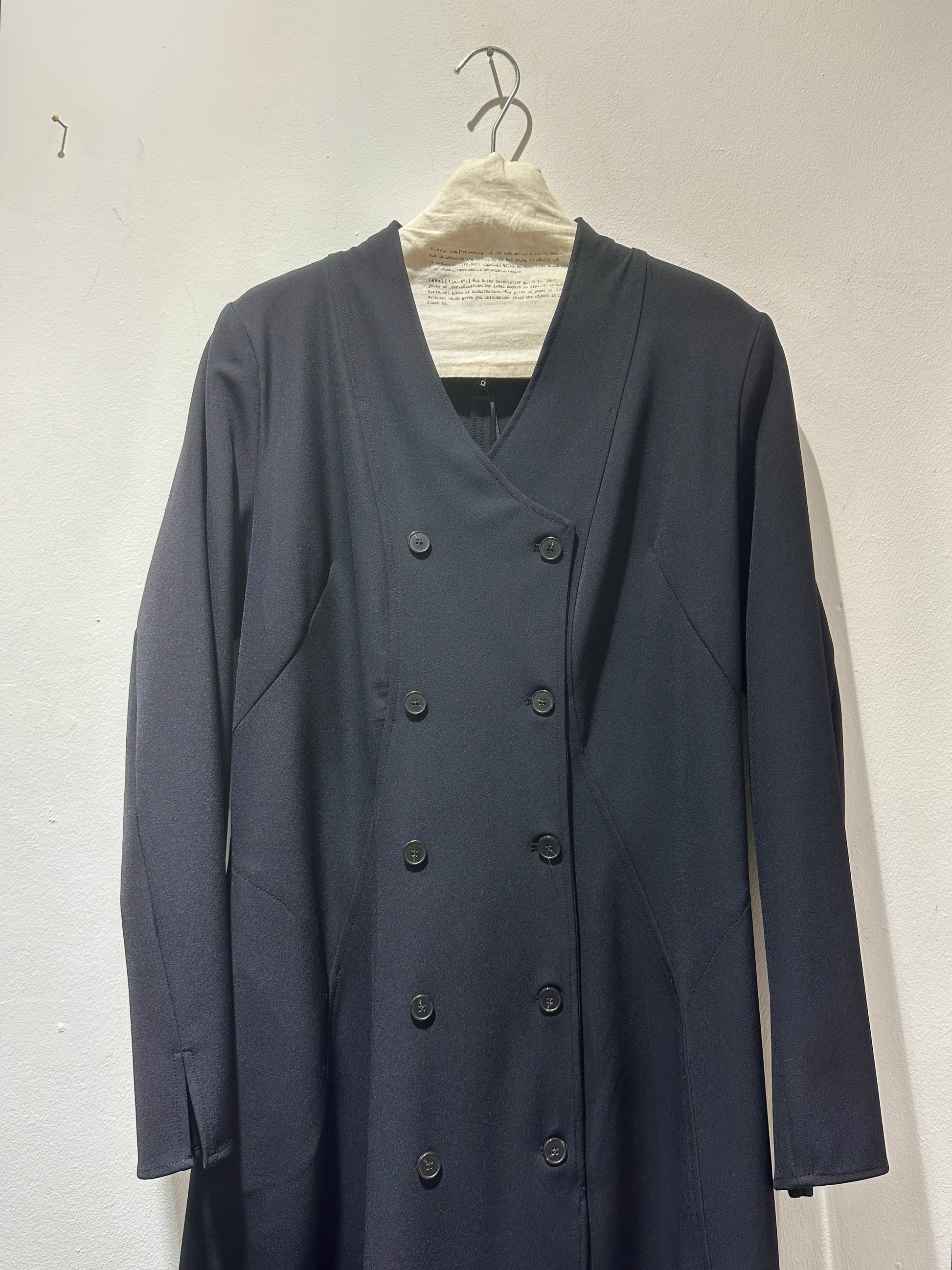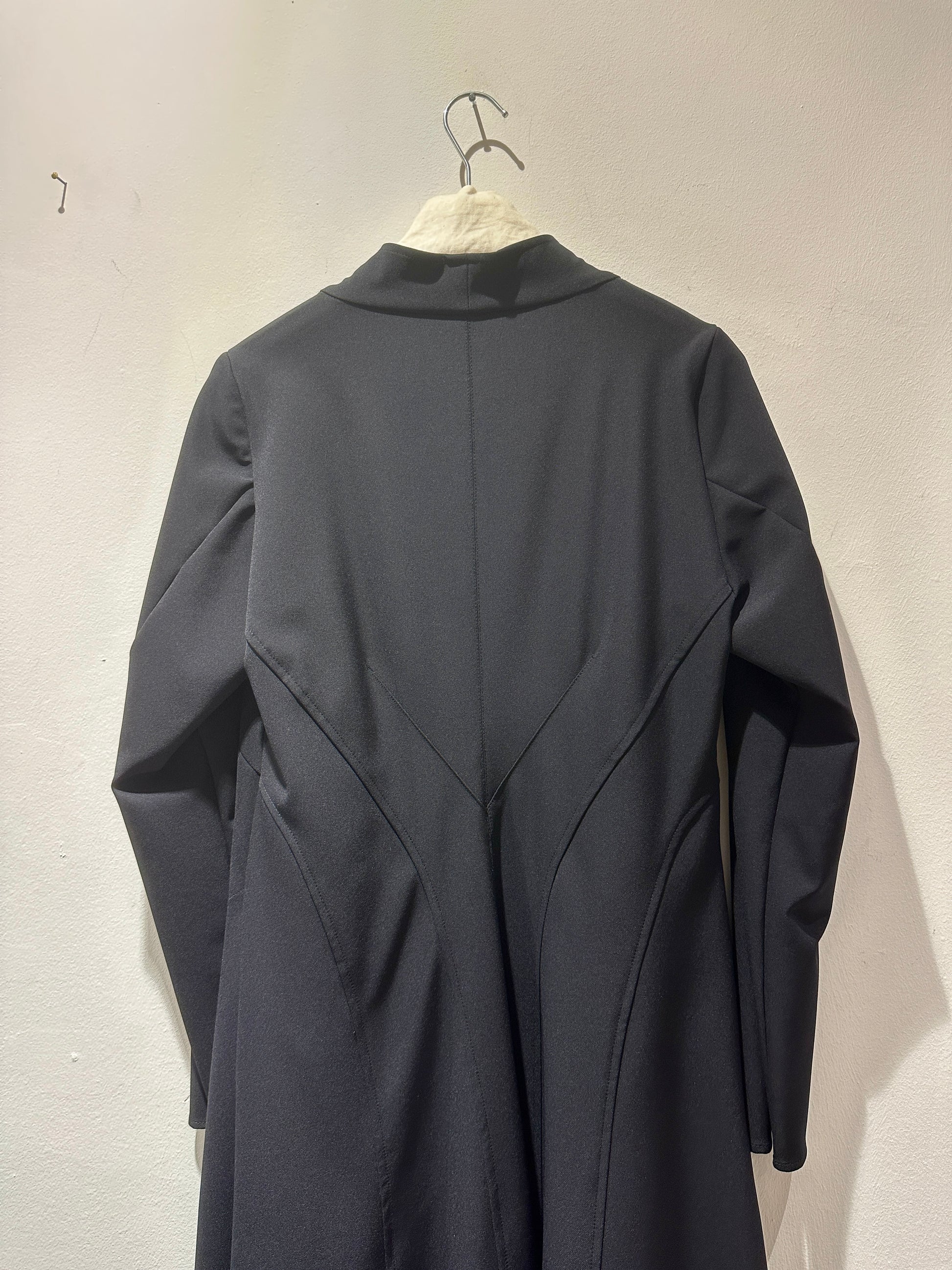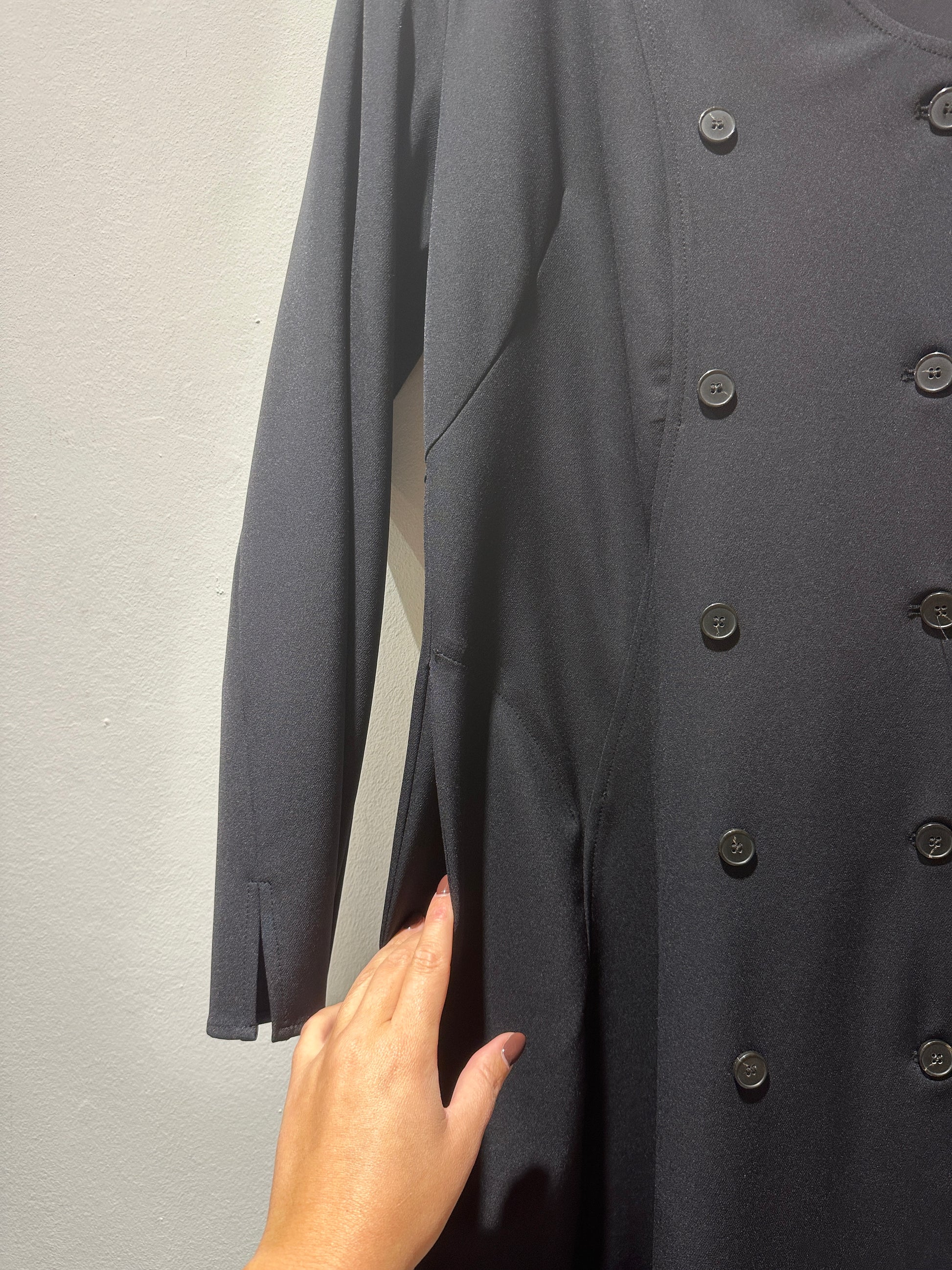 Abito spolverino nero in tessuto tecnico con manica lunga, tasche laterali a filetto e chiusura doppiopetto.