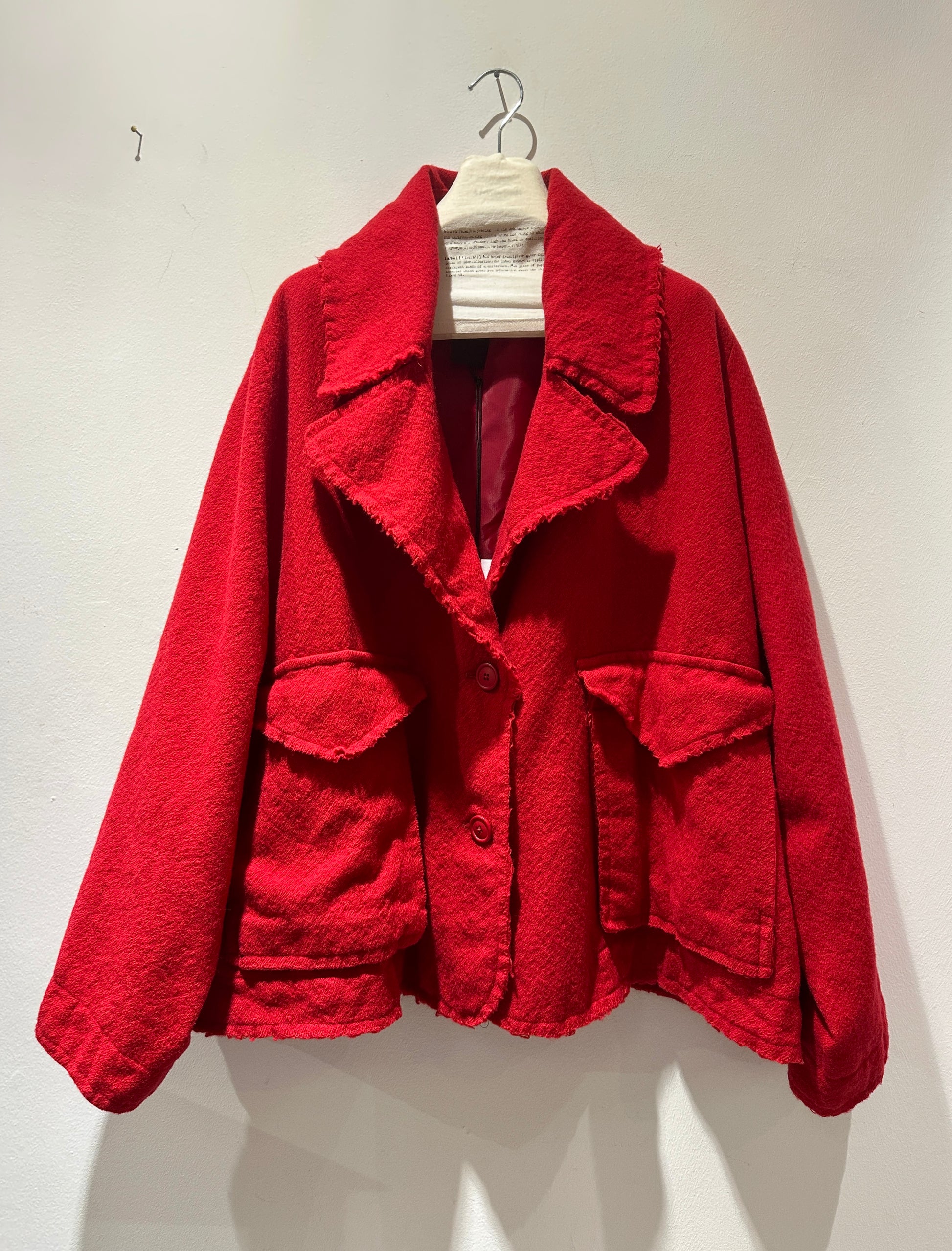 Cappotto corto rosso misto lana dal taglio over e vestibilità ampia.