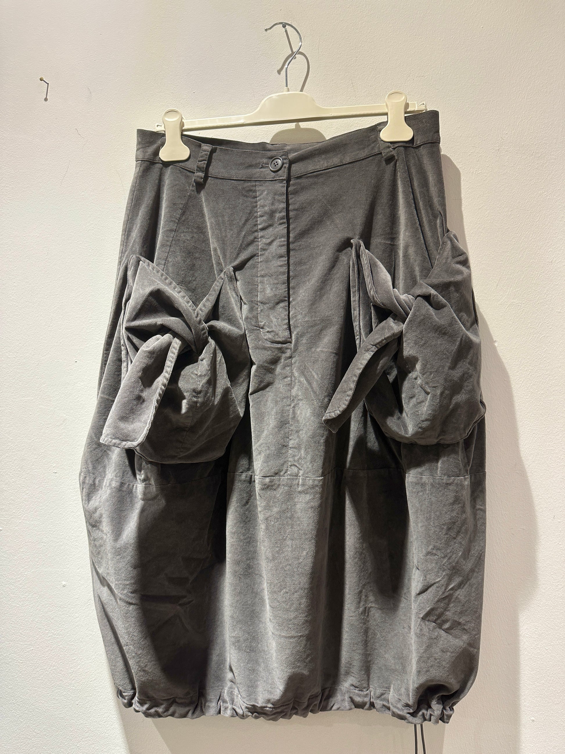 Gonna grigia in velluto effetto balloon ripresa sul fondo e regolabile con coulisse.