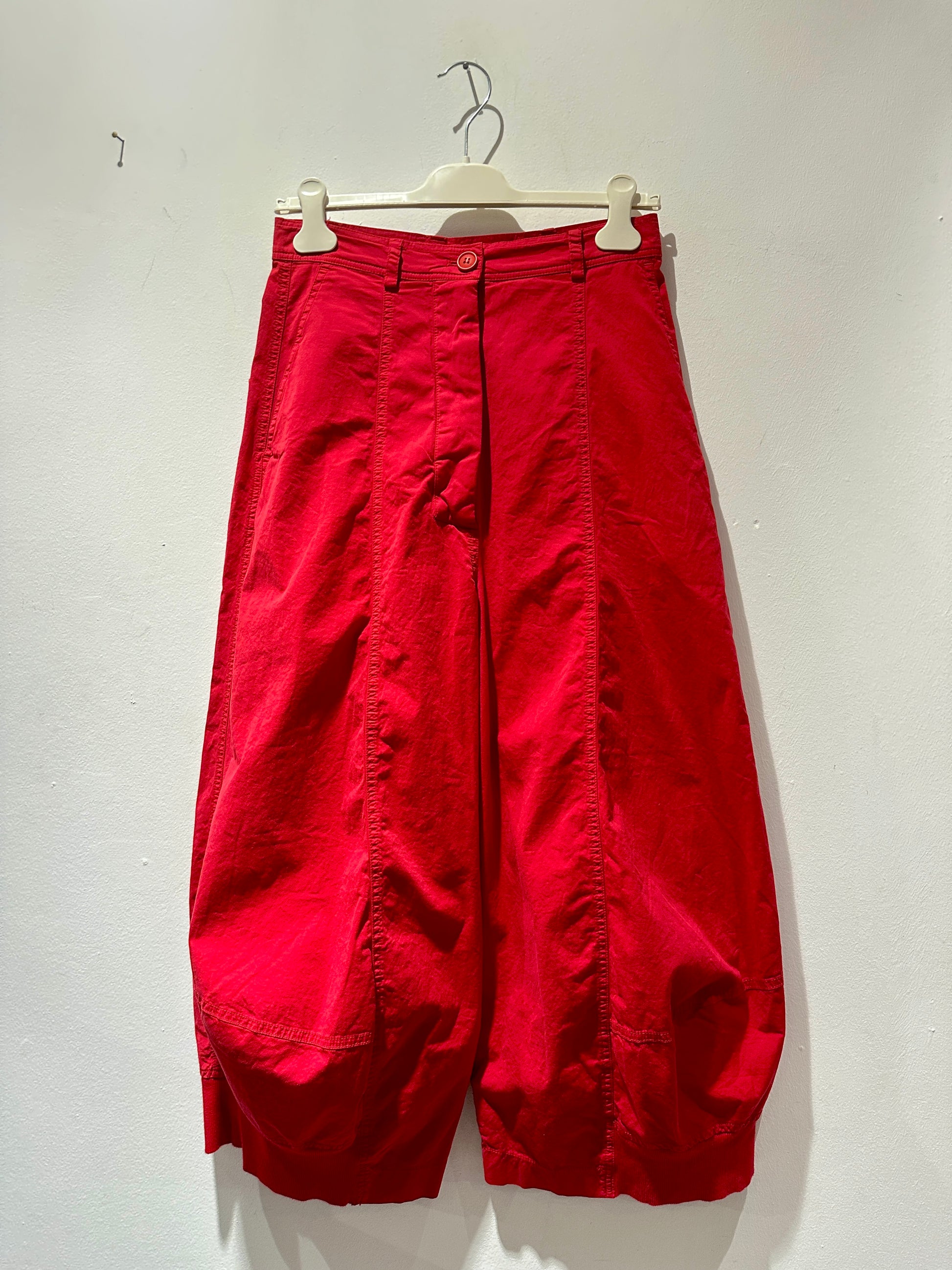 Pantalone in cotone rosso con gamba larca ripresa sul fondo. Vestibilità ampia.