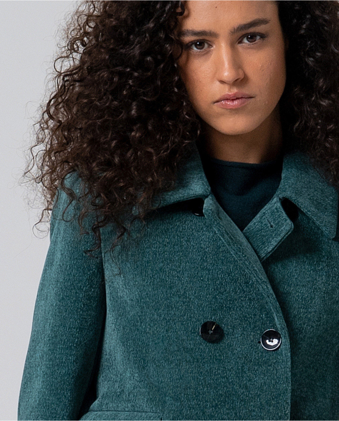 Cappotto corto a doppio petto, realizzato in morbida ciniglia con una leggera texture. Presenta fodera interna stampata, tasche con patta e collo a camicia.