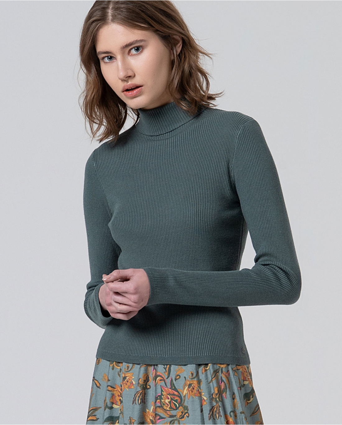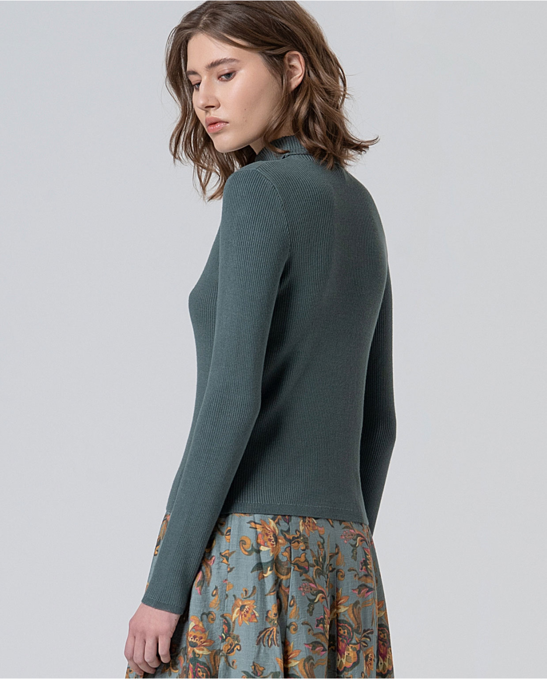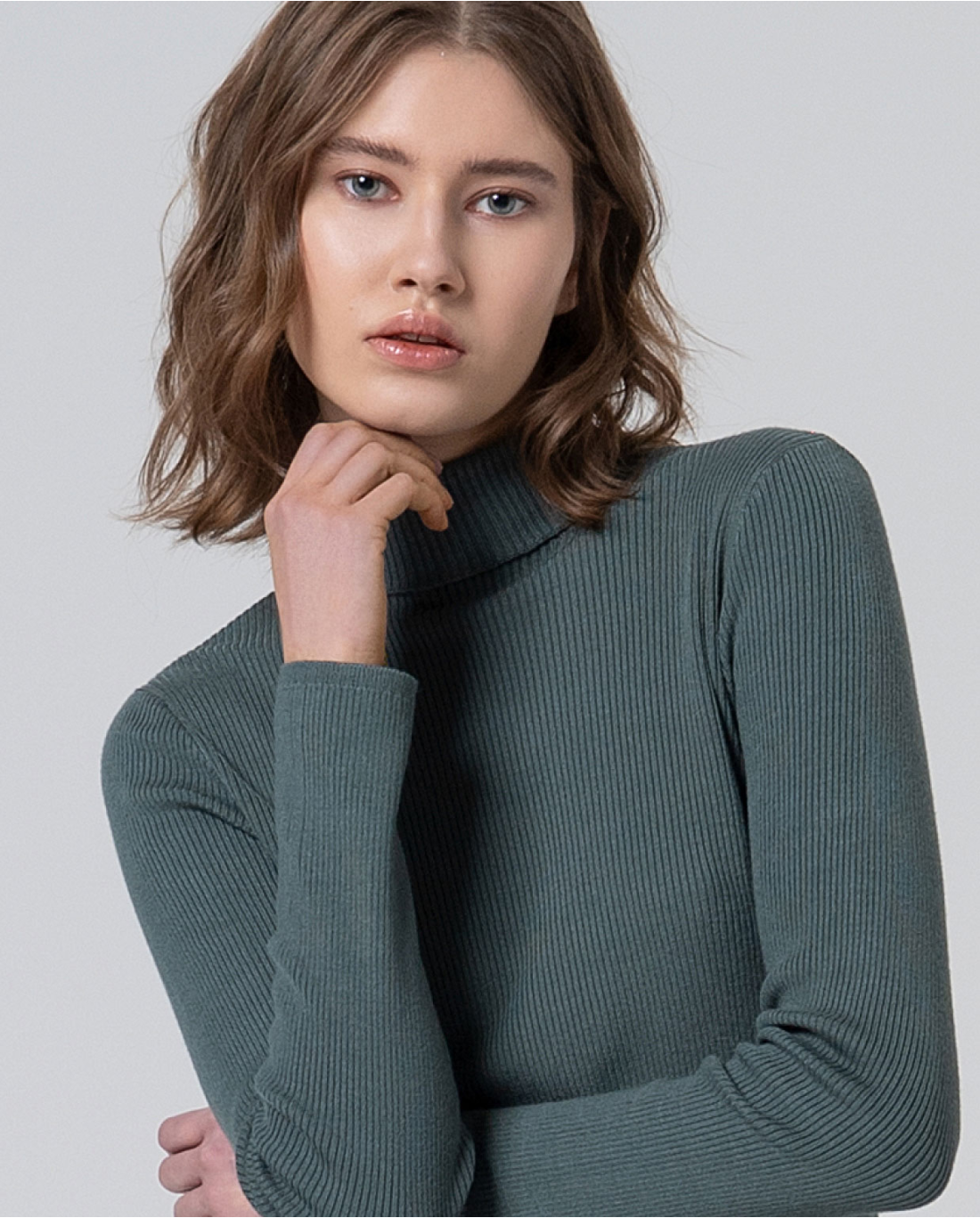 Maglione corto aderente, realizzato in viscosa a coste sottili. Il suo design aderente esalta la figura e il collo alto aggiunge un tocco sofisticato. Un capo caldo ma leggero, ideale da indossare da solo o come primo strato.