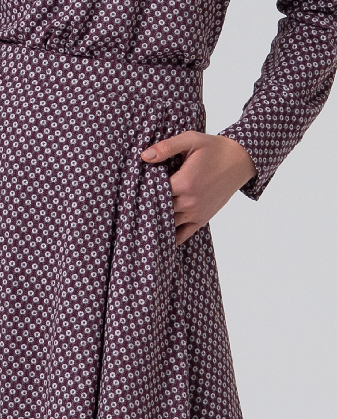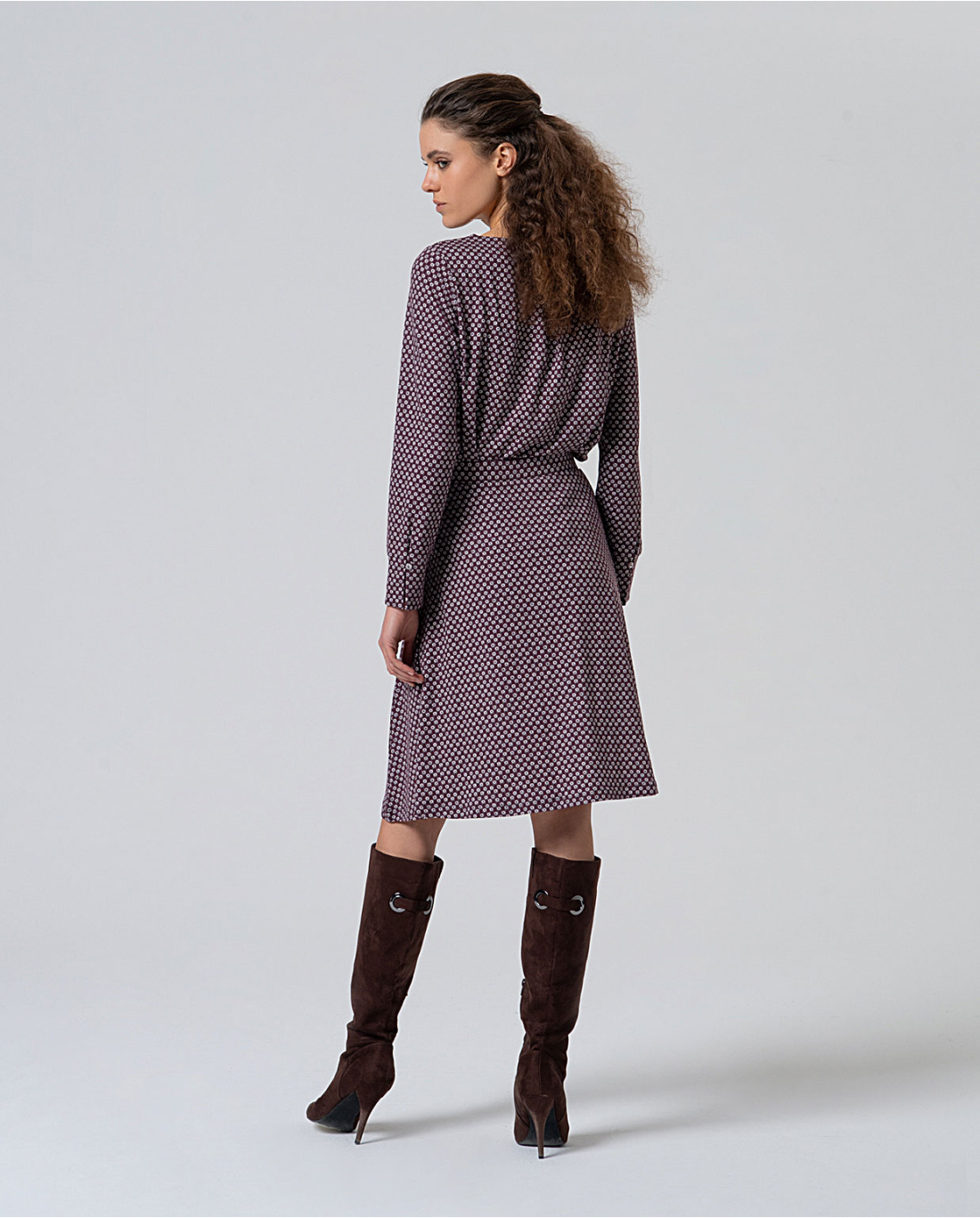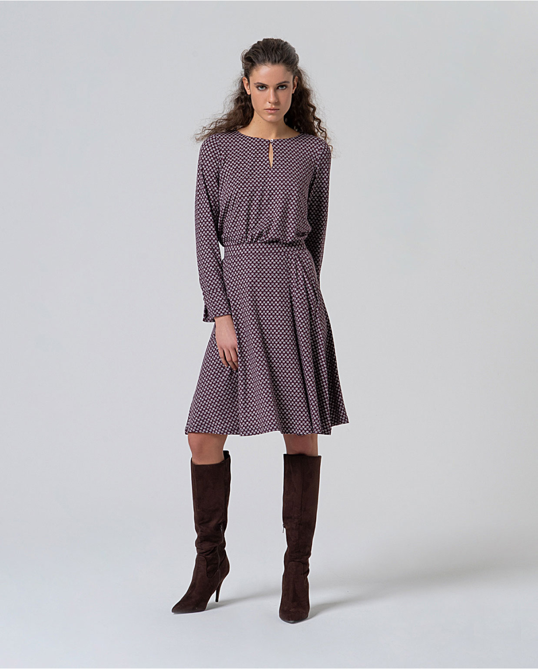 Gonna al ginocchio dalla fantasia geometrica sui toni del malva e grigio, con elastico in vita e tasche laterali.