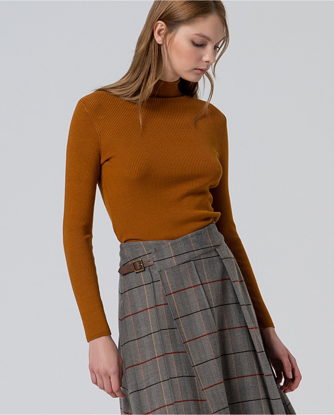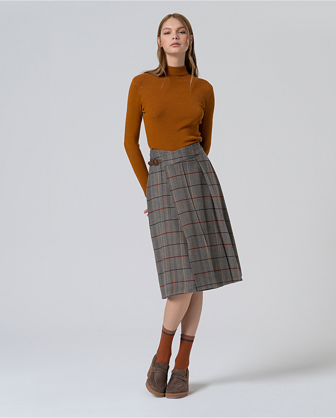 Gonna midi con silhouette a trapezio, chiusura laterale con zip e dettaglio laterale con cinturino. Il drappeggio gli conferisce carattere e movimento.