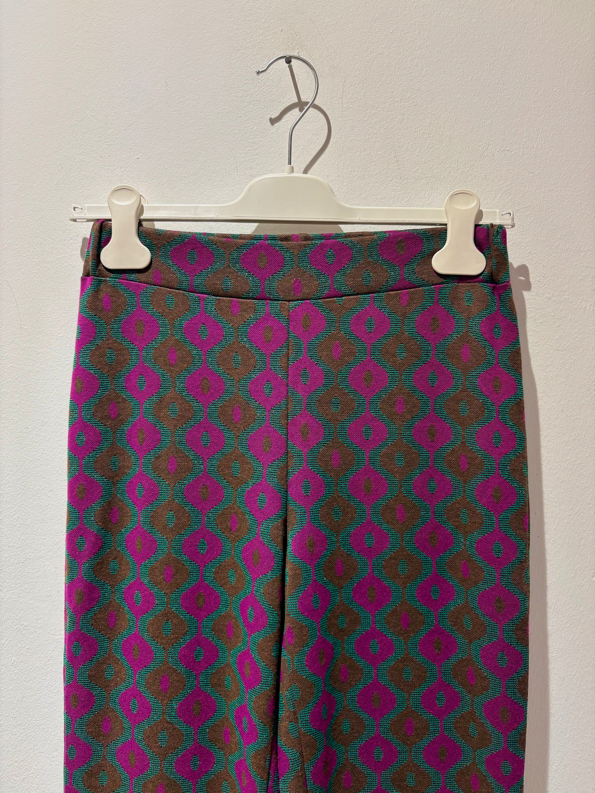 Pantalone a zampa fantasia sui toni del fucsia, verde, marrone.
