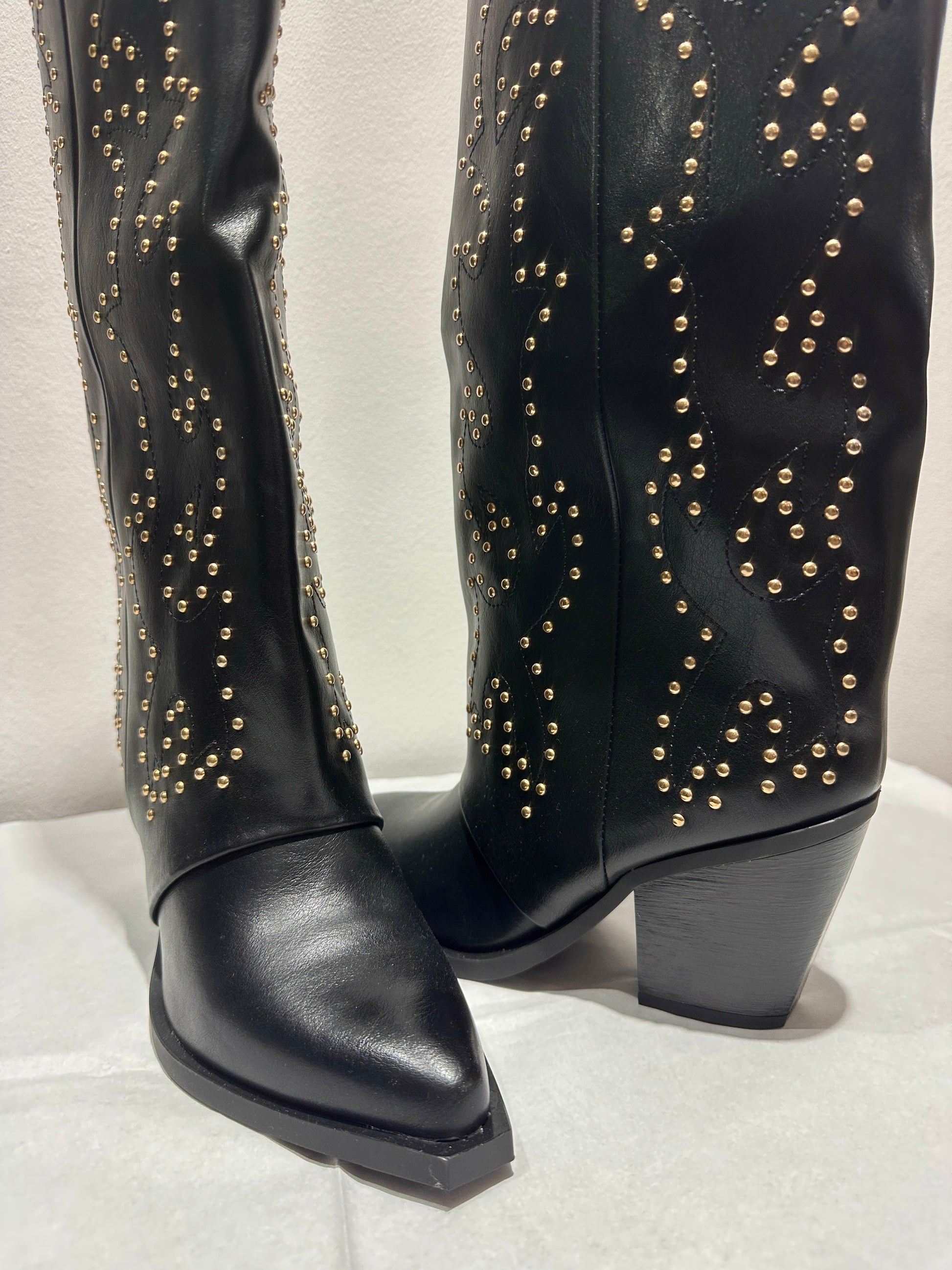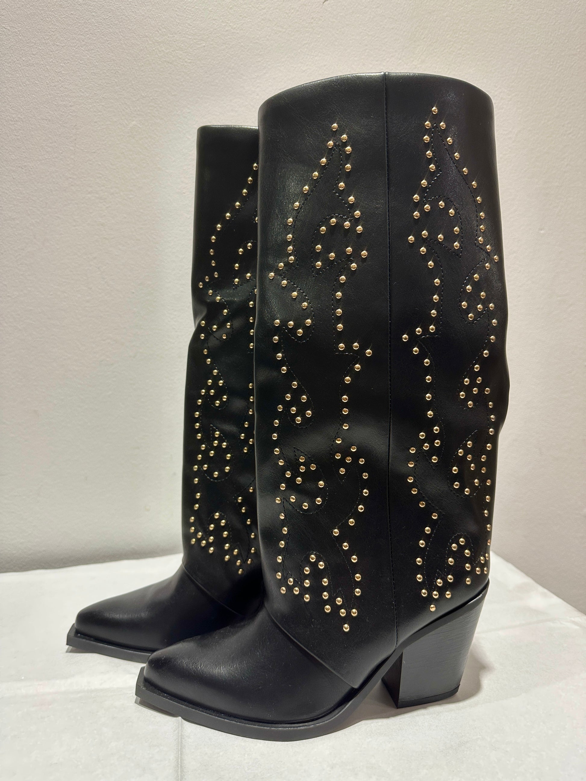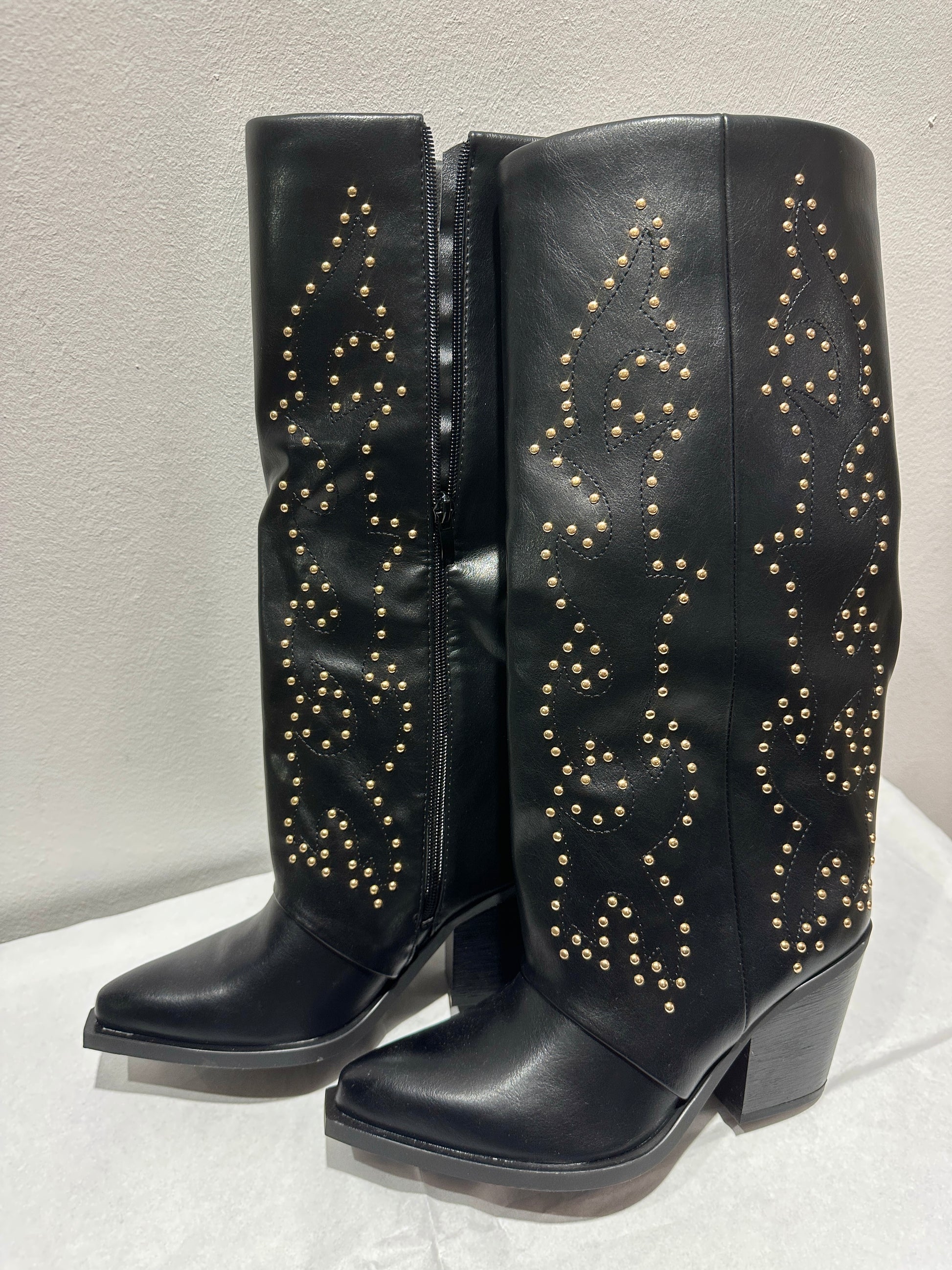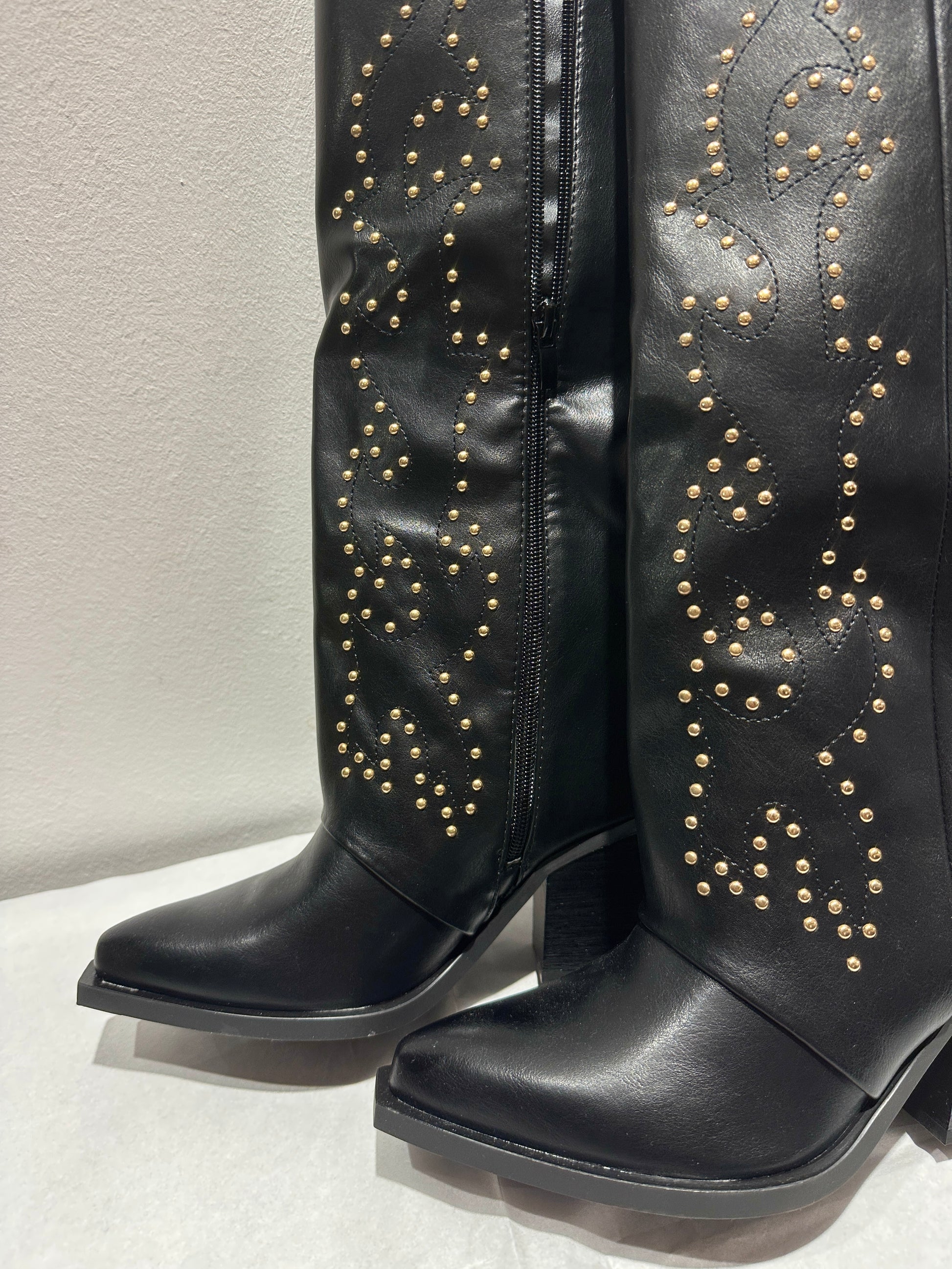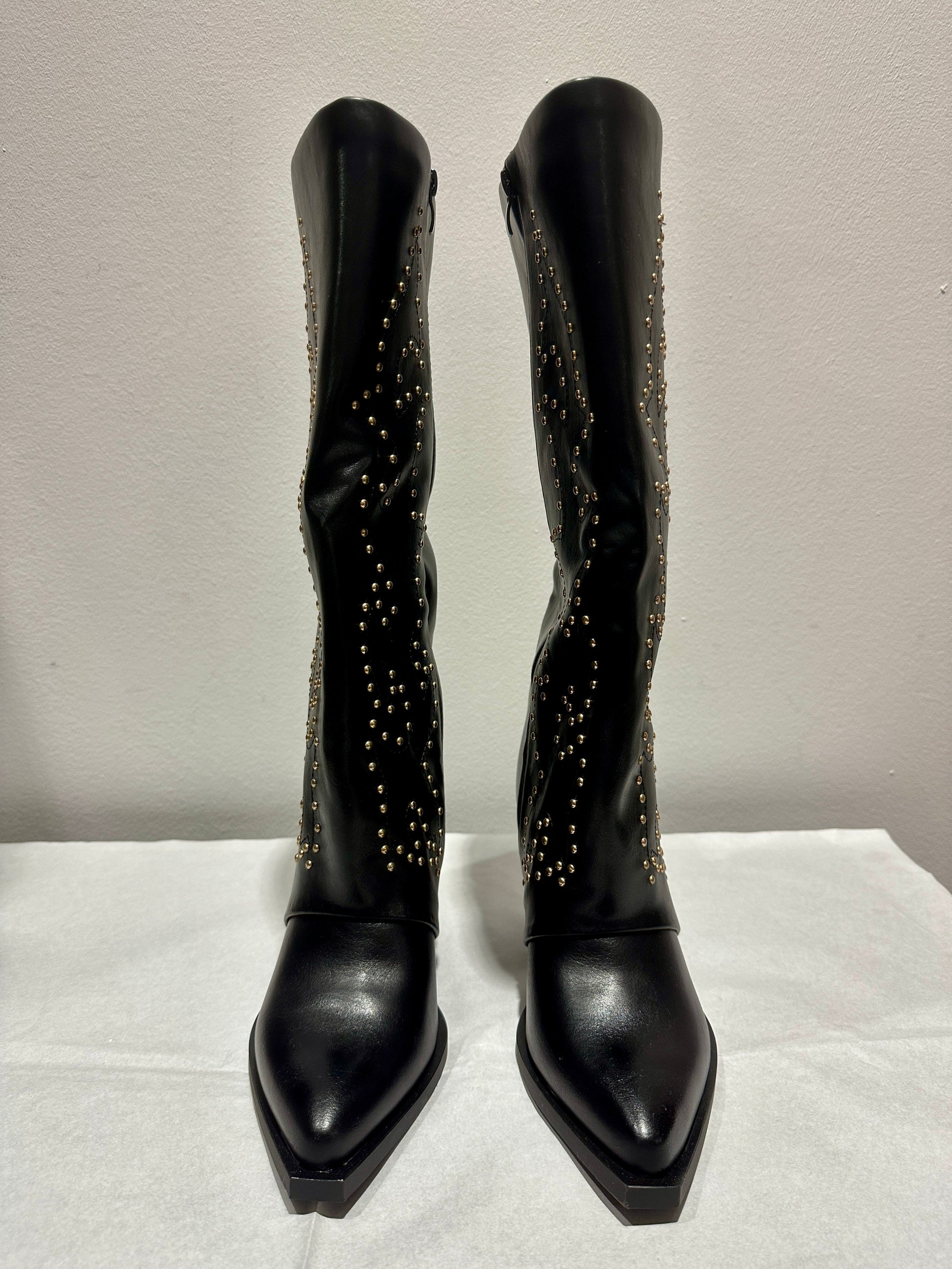 Stivale alto a punta nero con borchiette su tutta la lunghezza, cerniera laterale e tacco 7cm.
