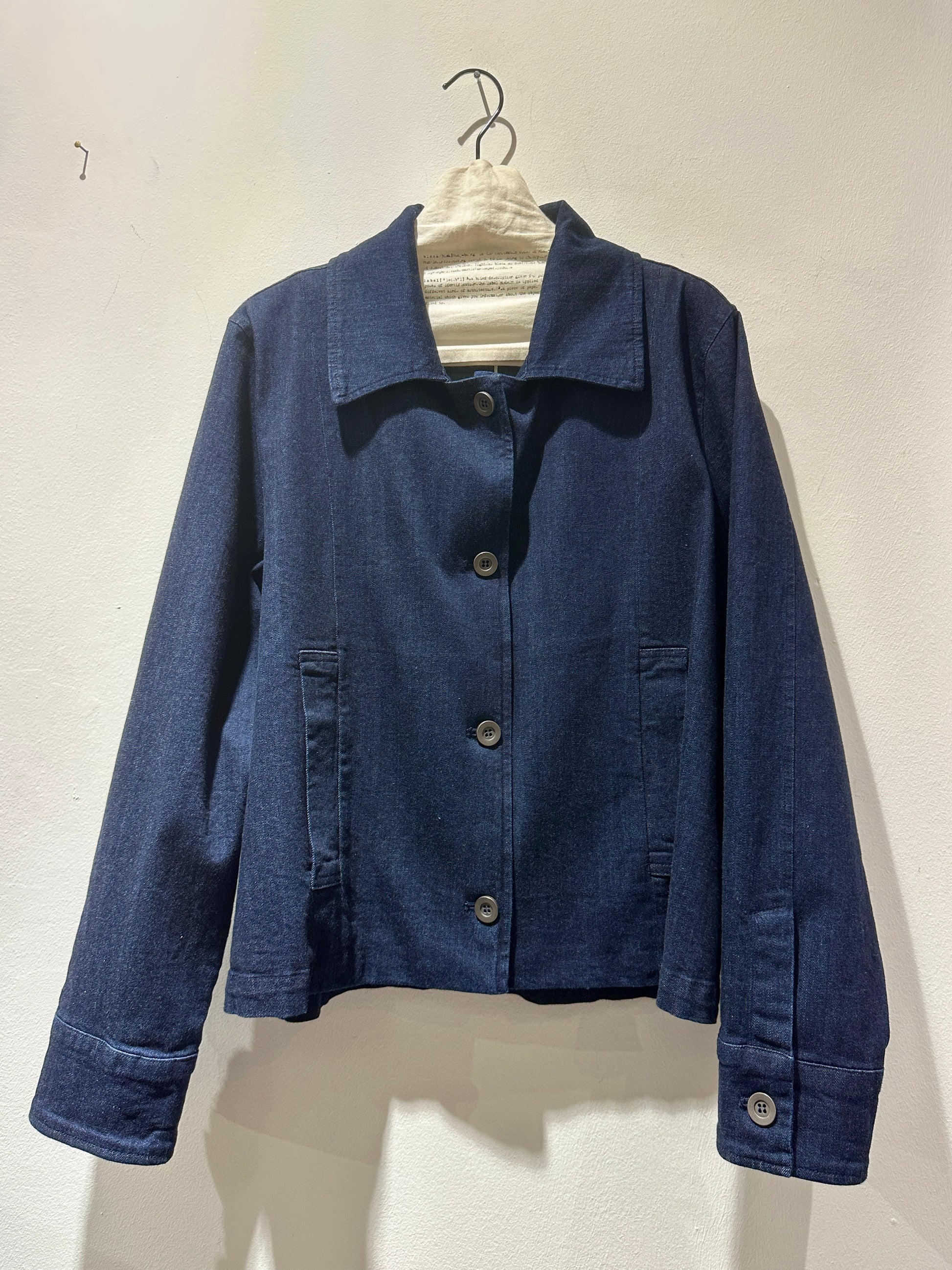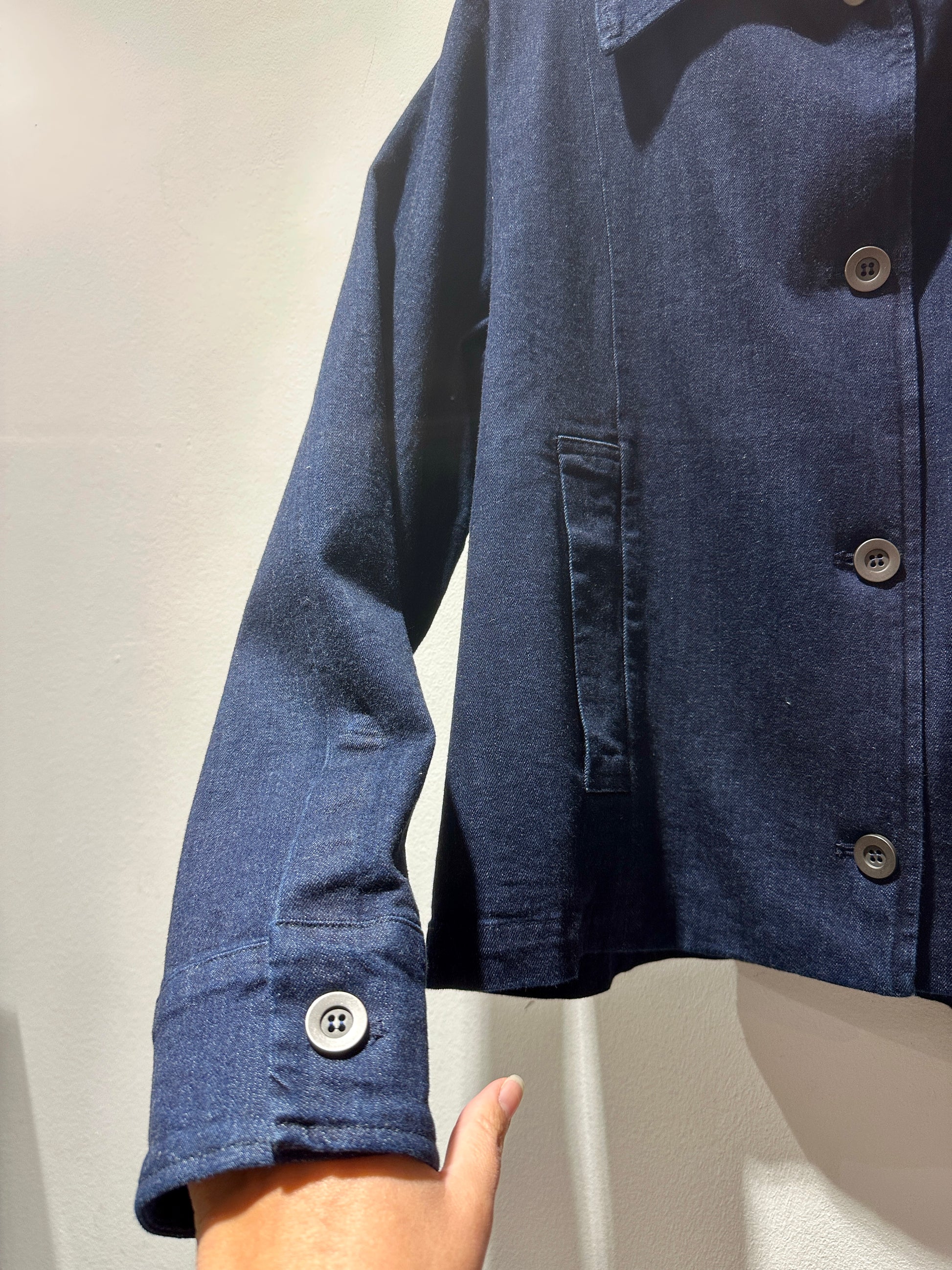 Giacca in cotone denim blu con chiusura frontale a bottoni e dua tasche laterali.