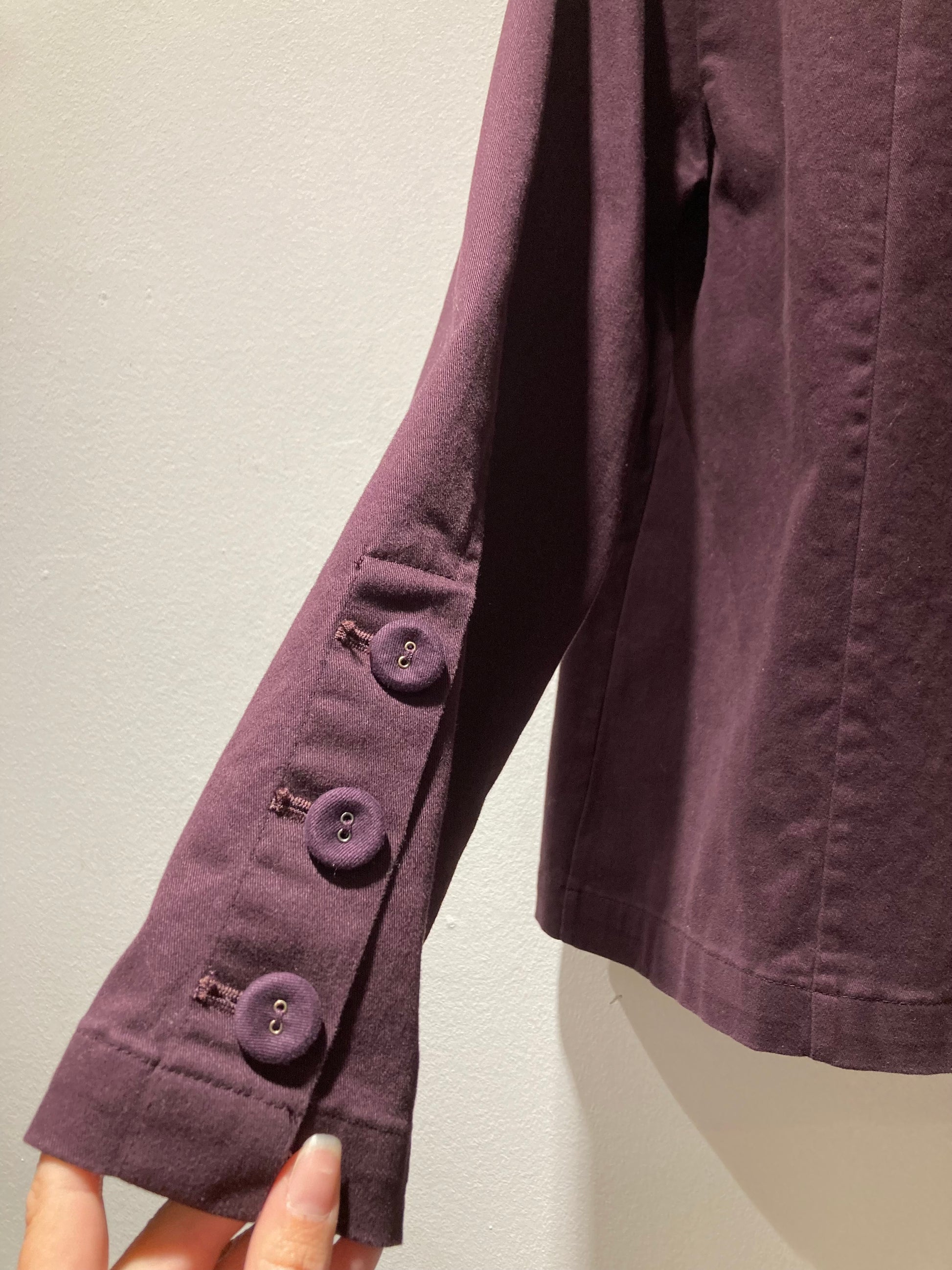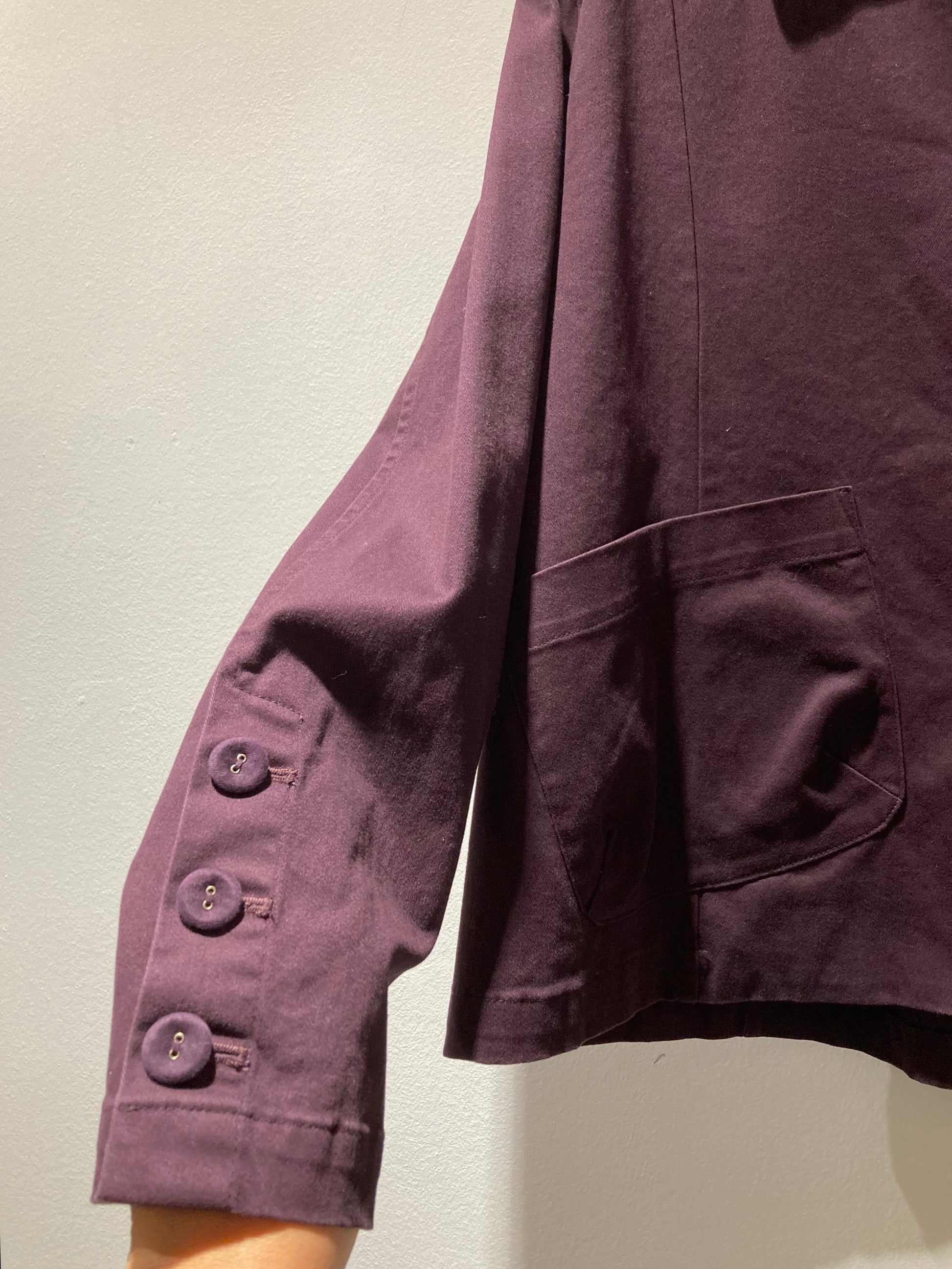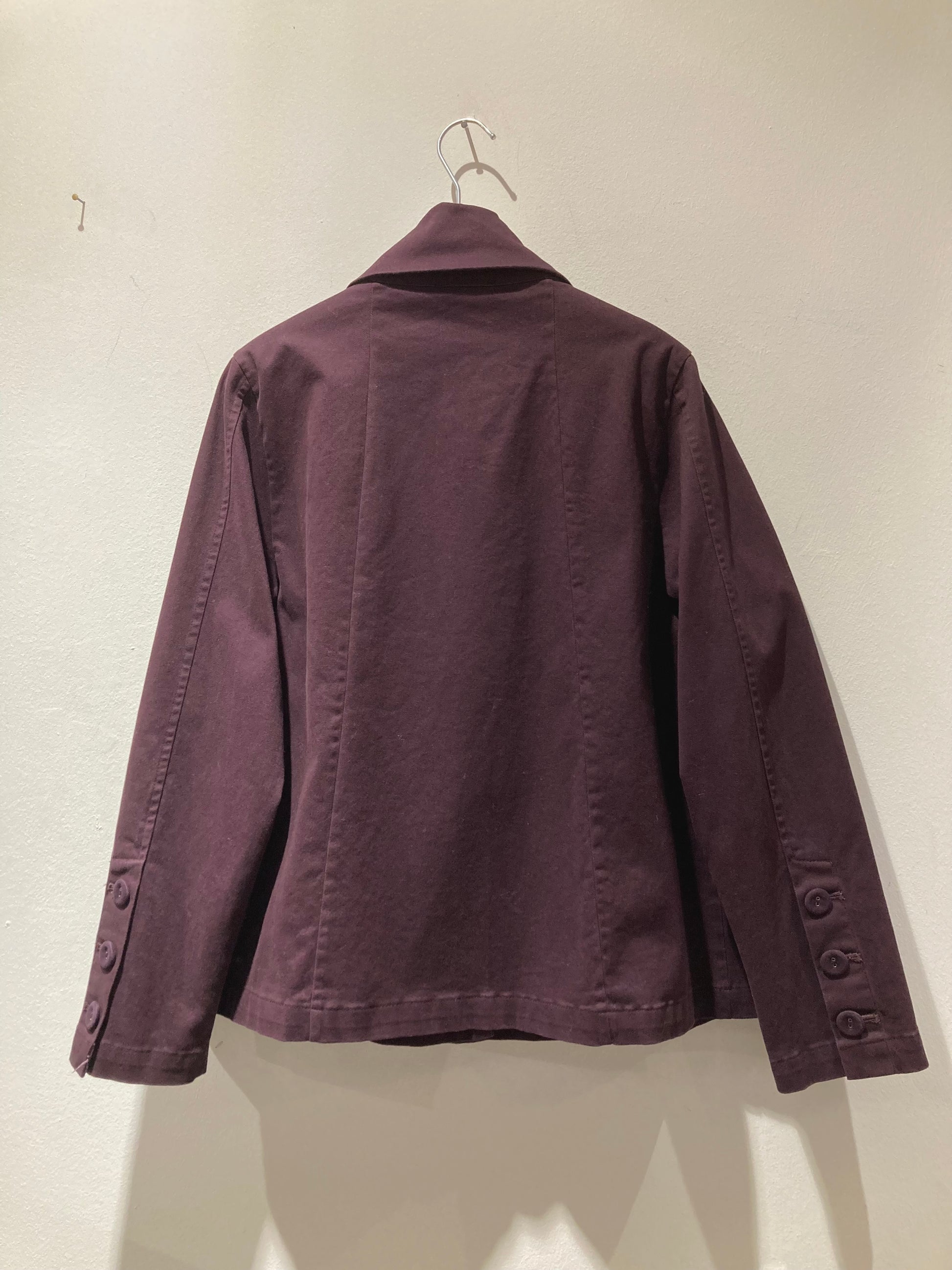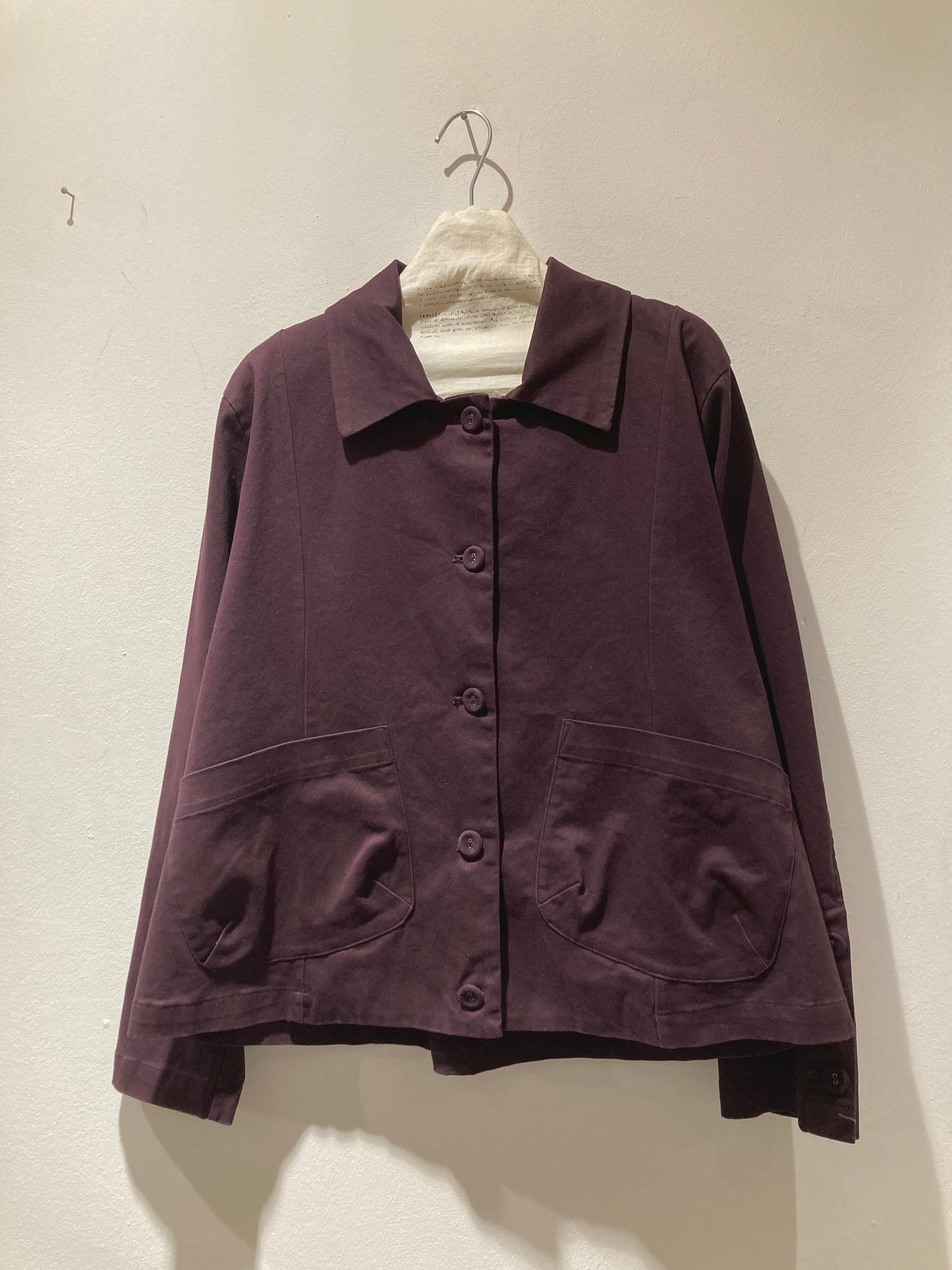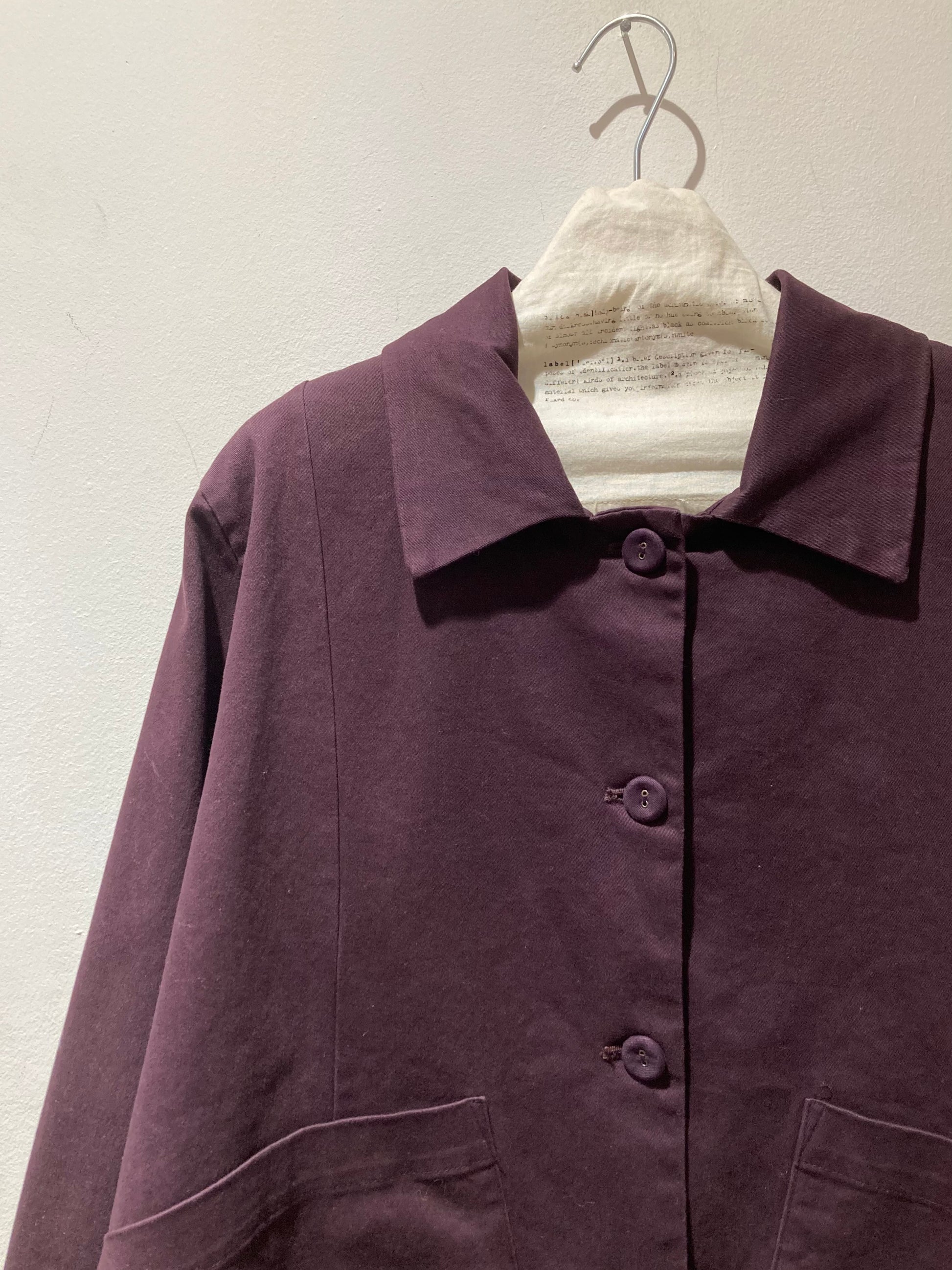 Giacca in cotone bordeaux con collo a camicia, tasche applicate e chiusura frontale a bottoni.