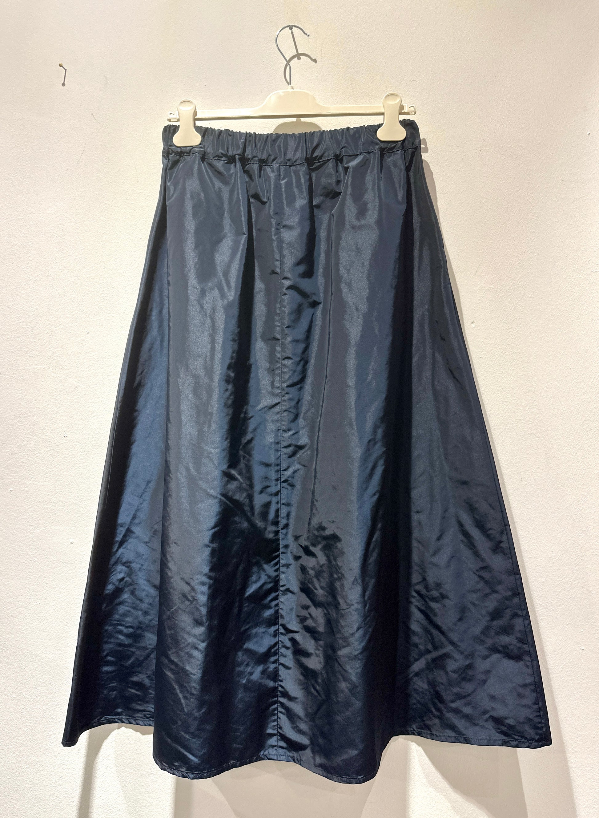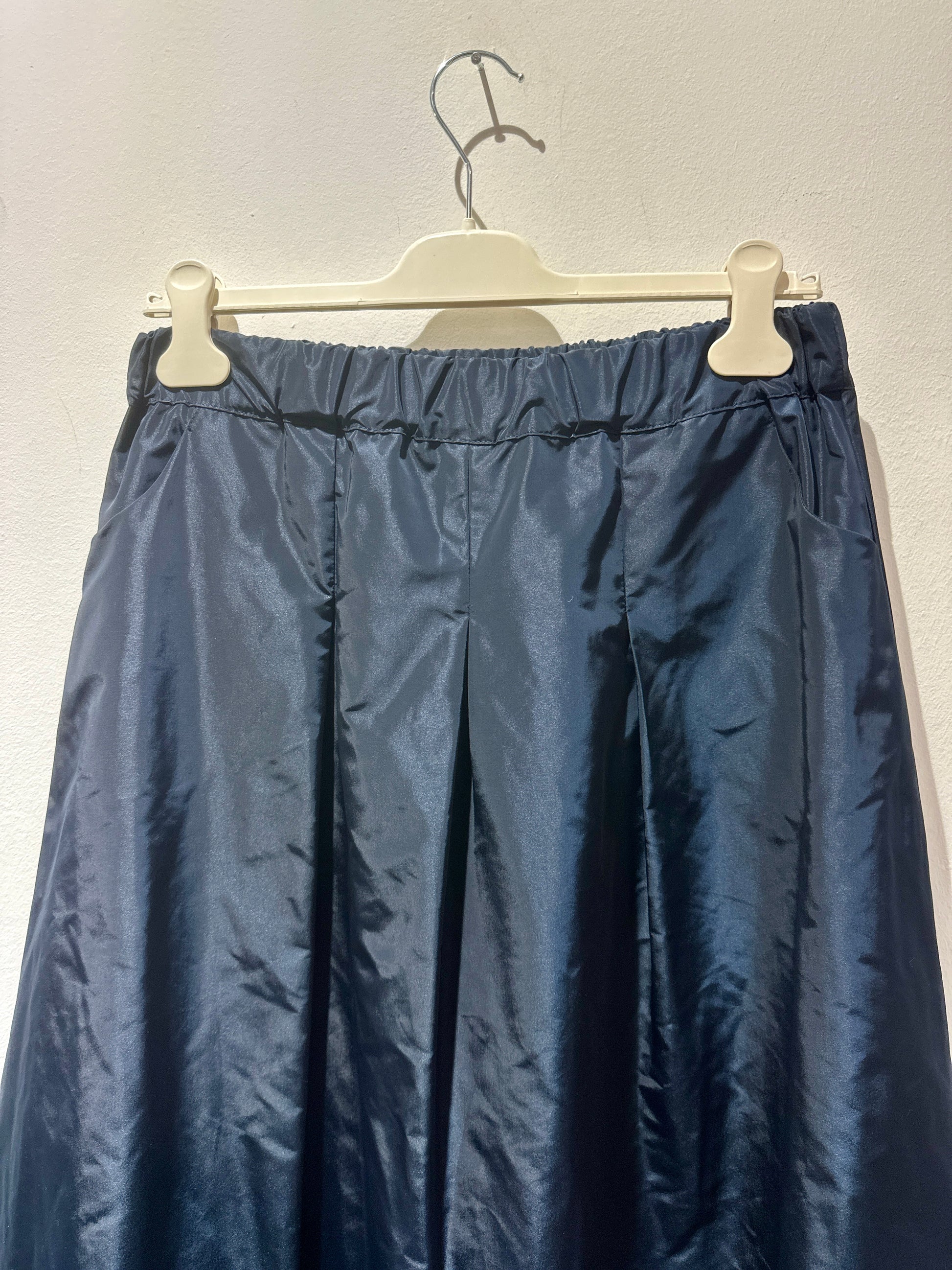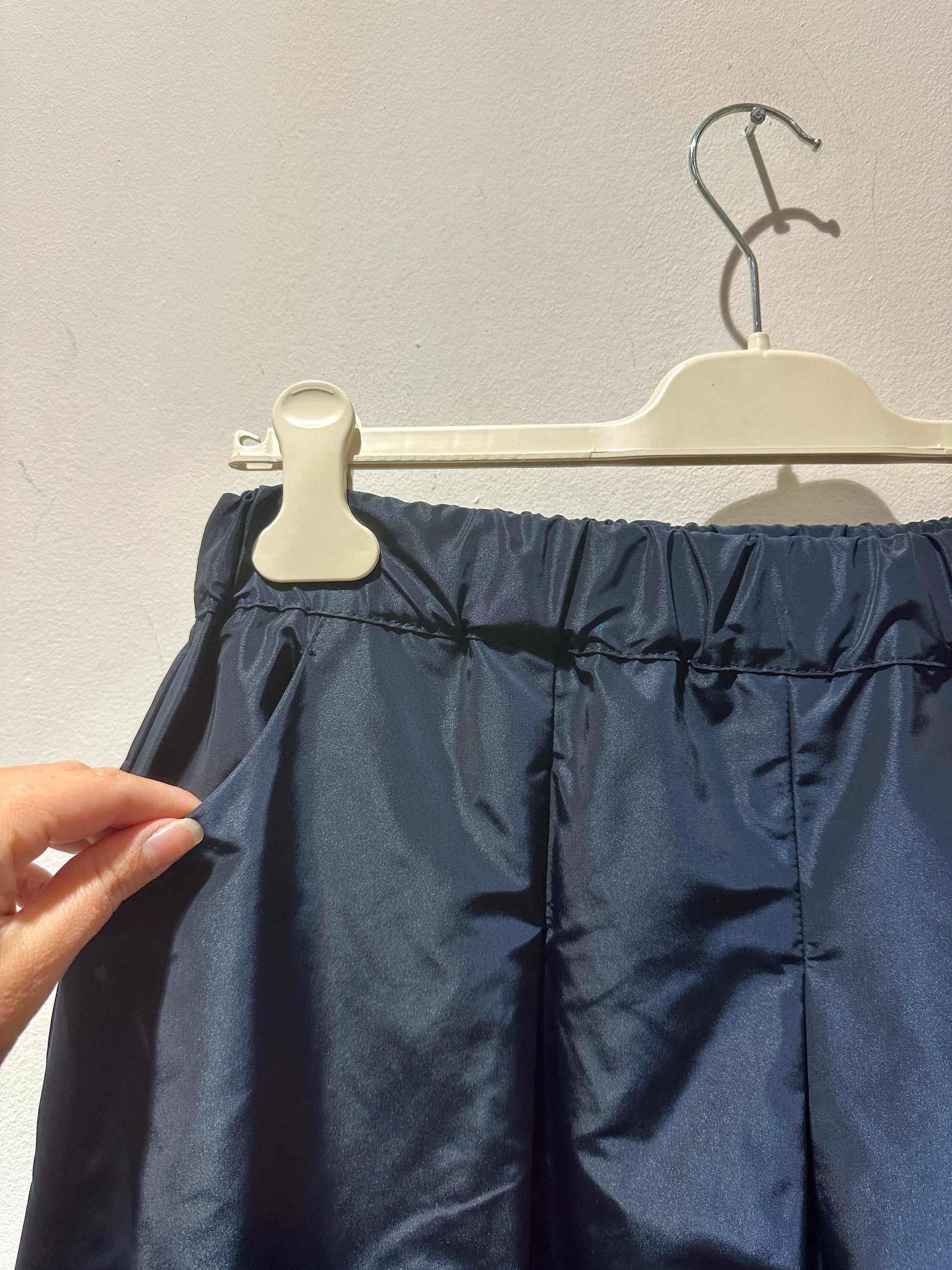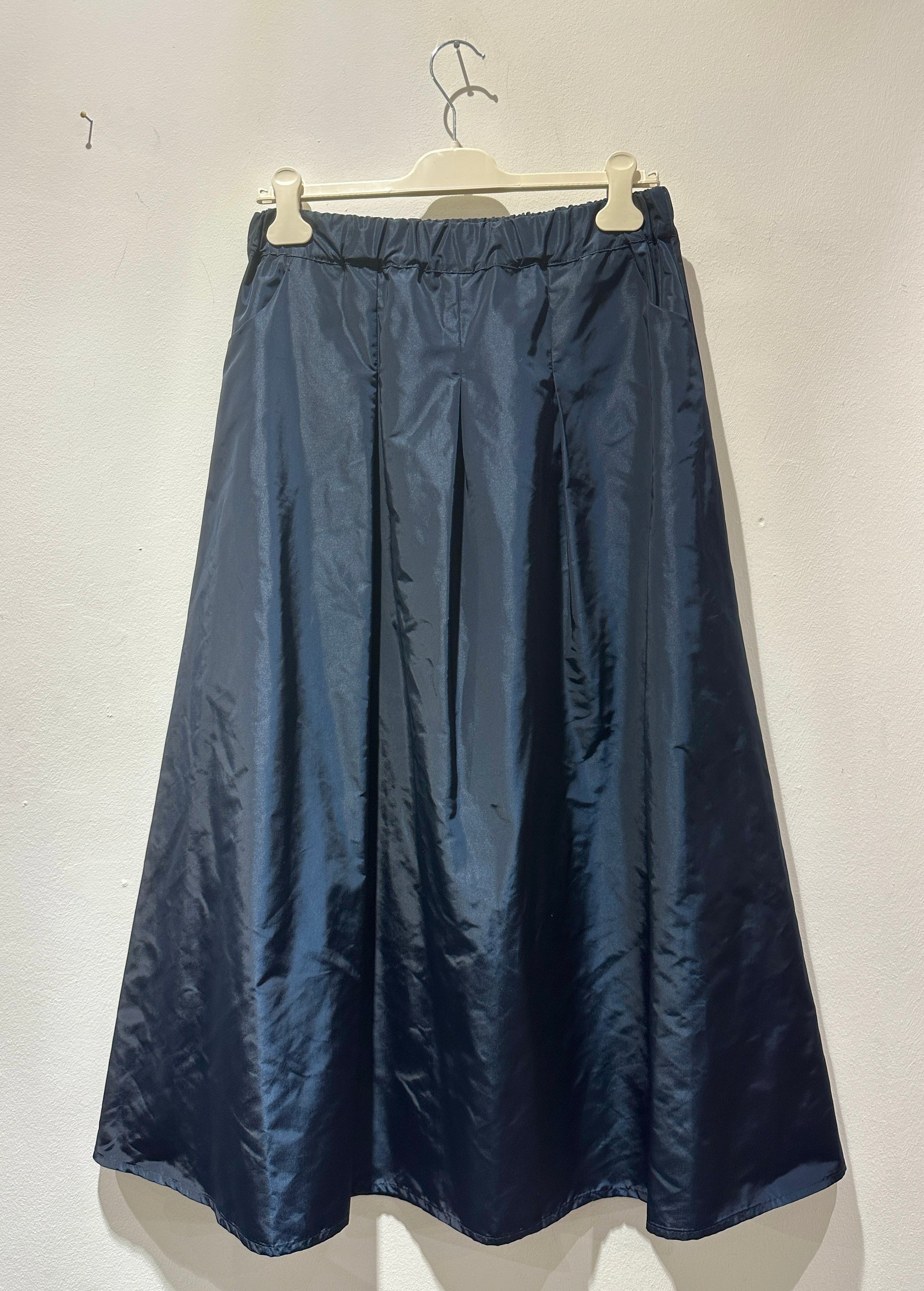 Gonna blu in taffetà con elastico in vita e tasche laterali a filetto.