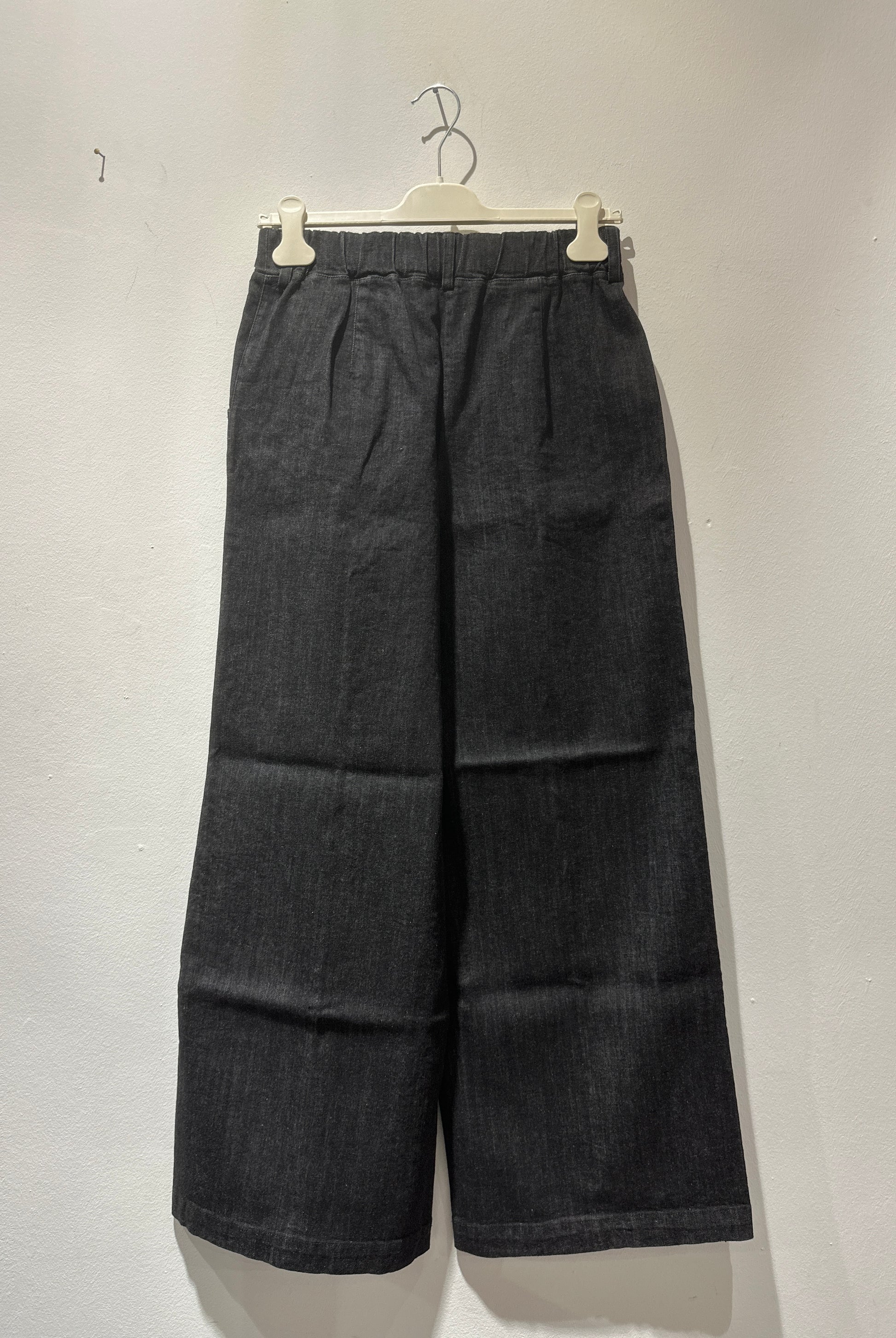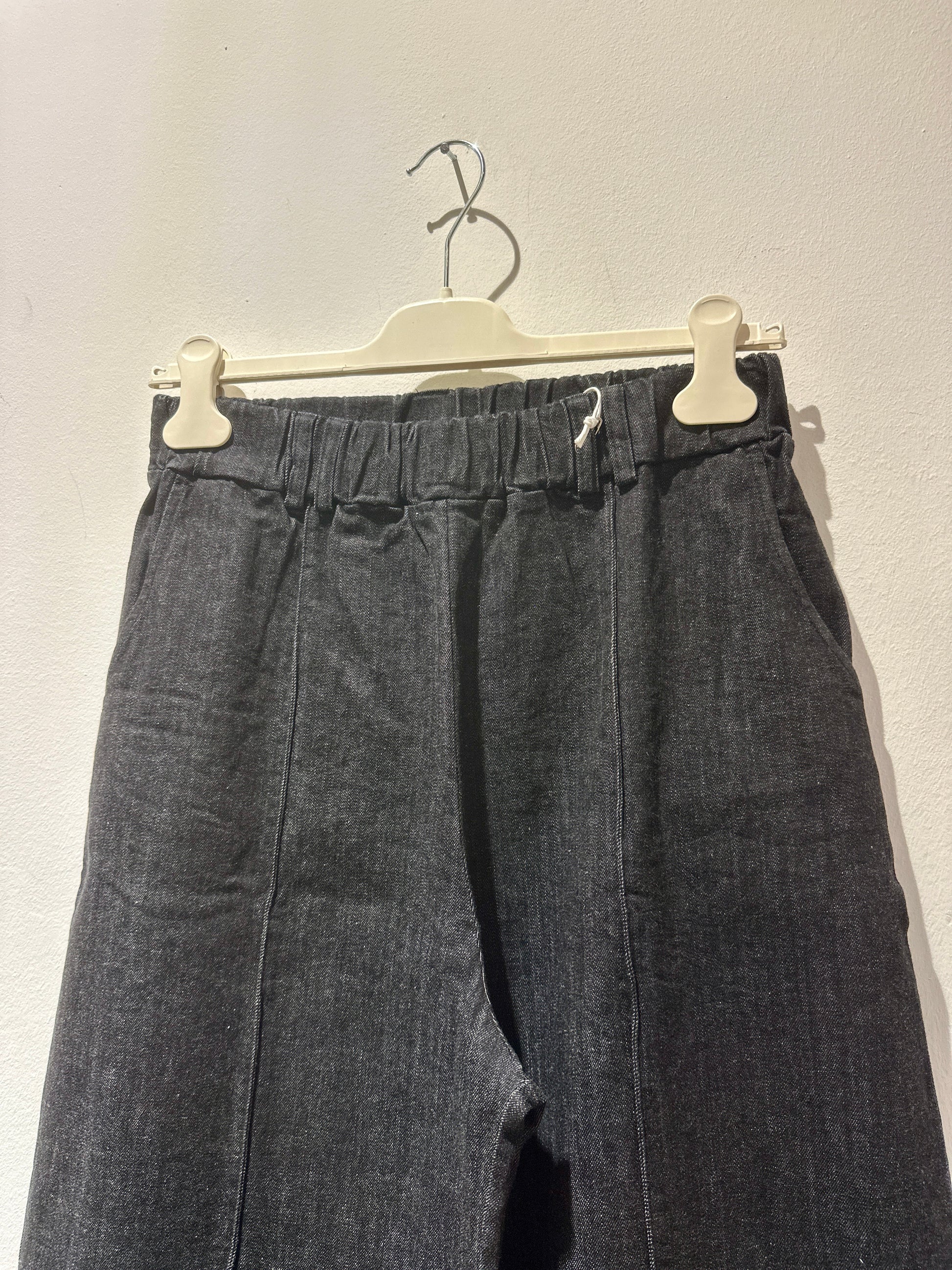 Pantalone lungo a zampa in tessuto denim con elastico in vita e passanti per cintura. Cuciture a vista.