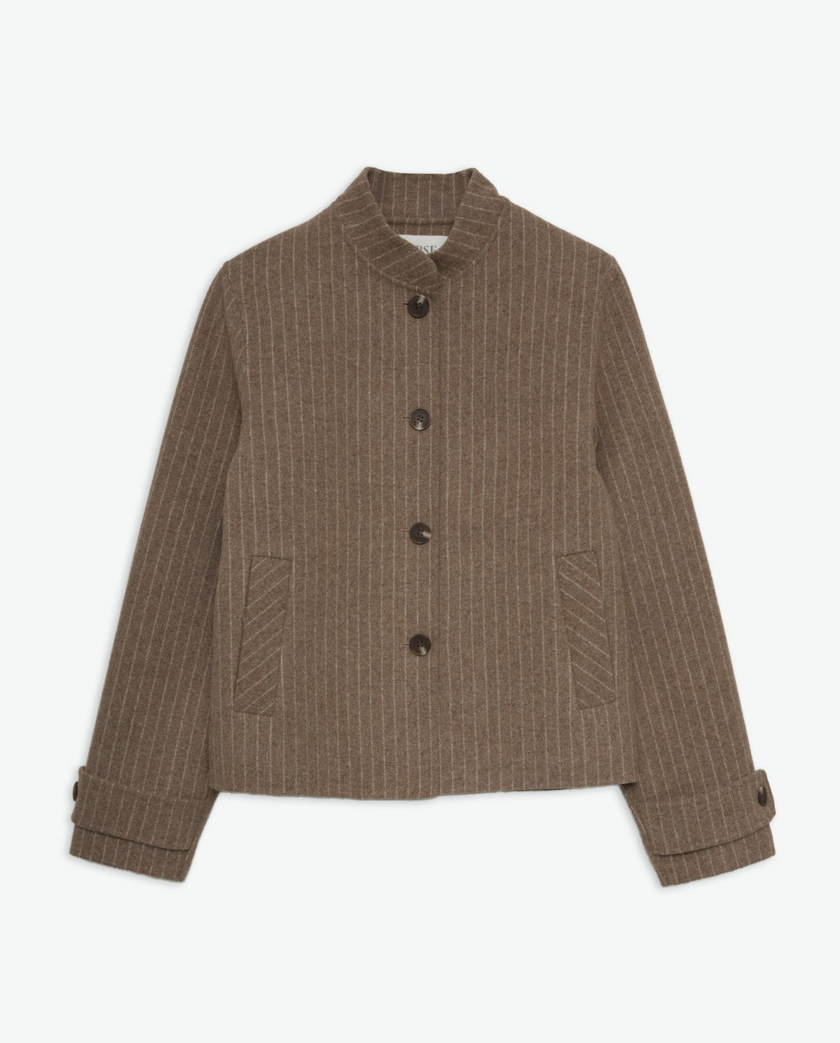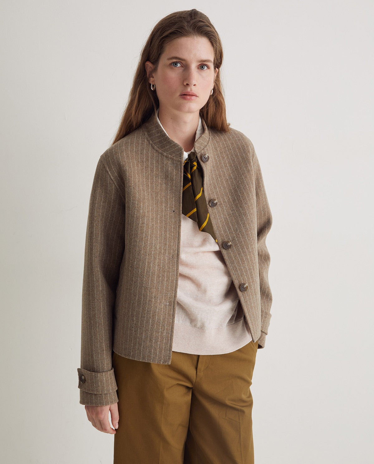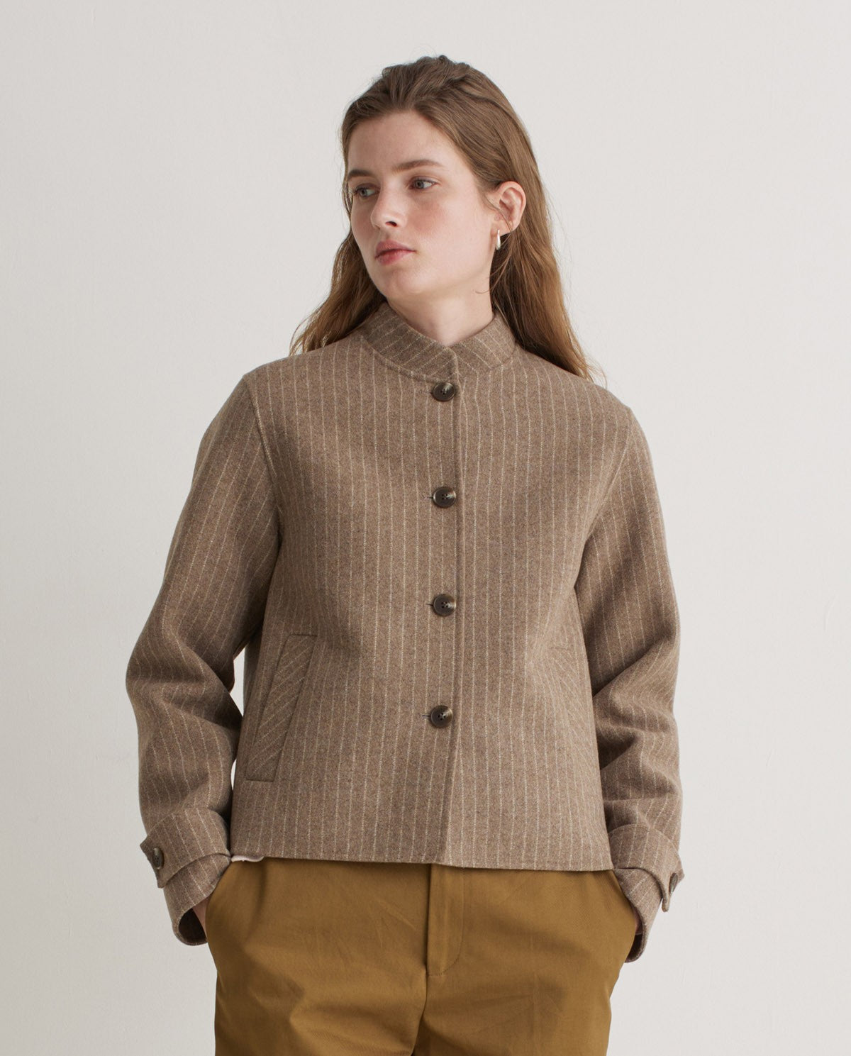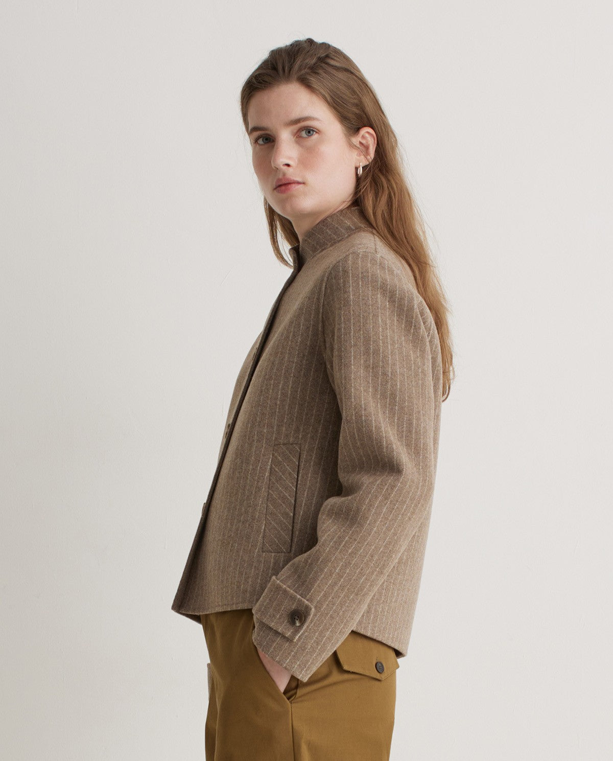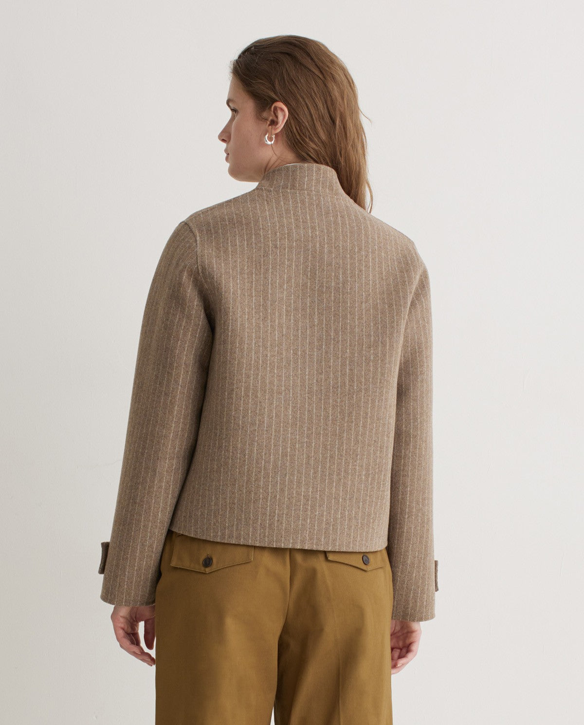 Giacca corta dal tessuto double-face di lana e fibre riciclate con stampa a righe.